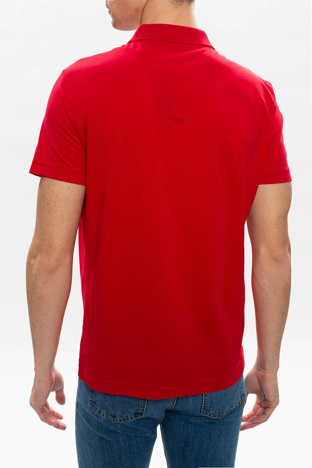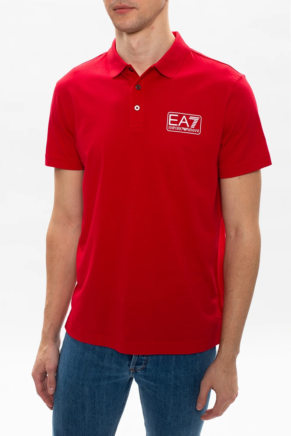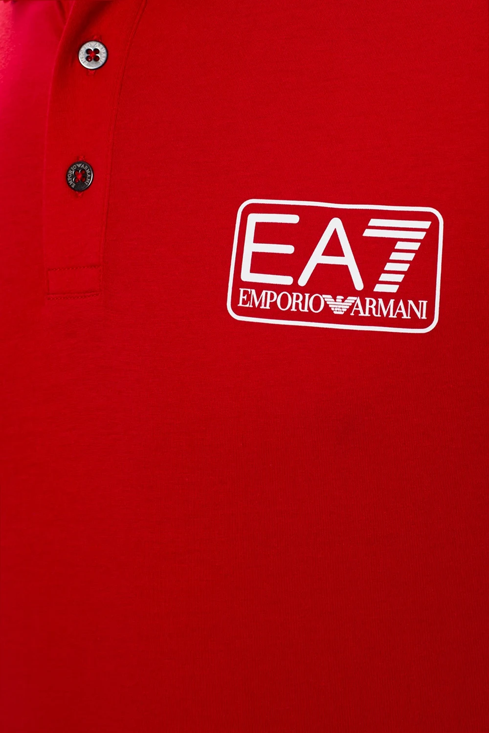 Red polo shirt from EA7 Emporio Armani. Boasting a silver-tone logo print, this cotton-crafted style fastens via buttons.