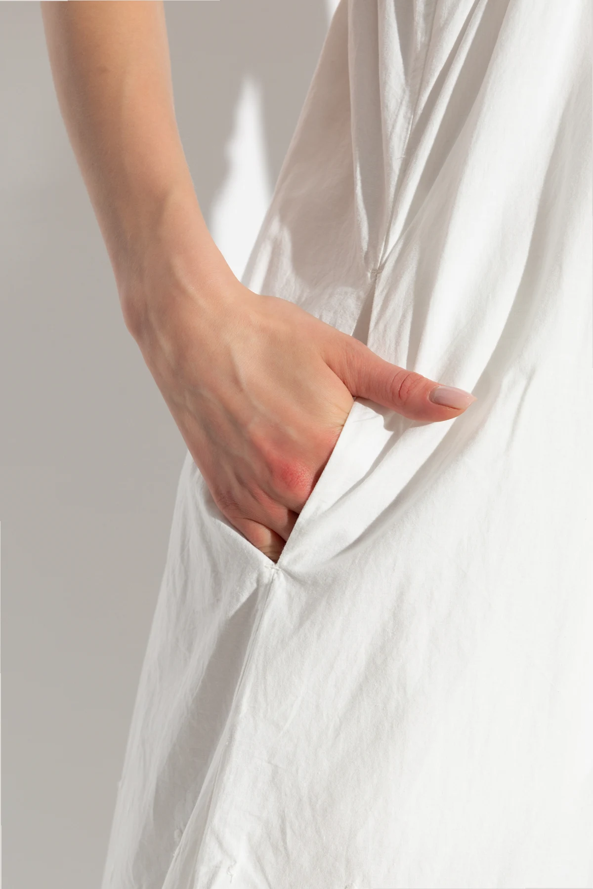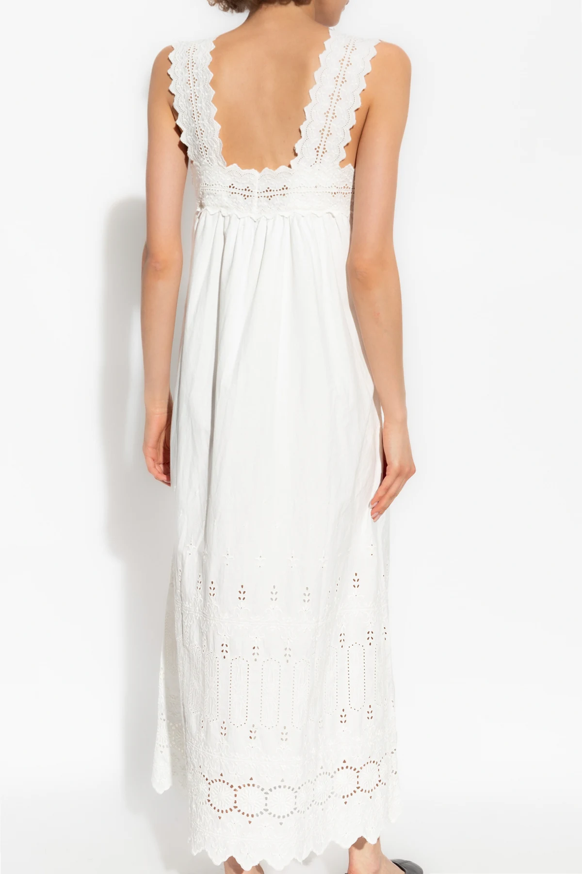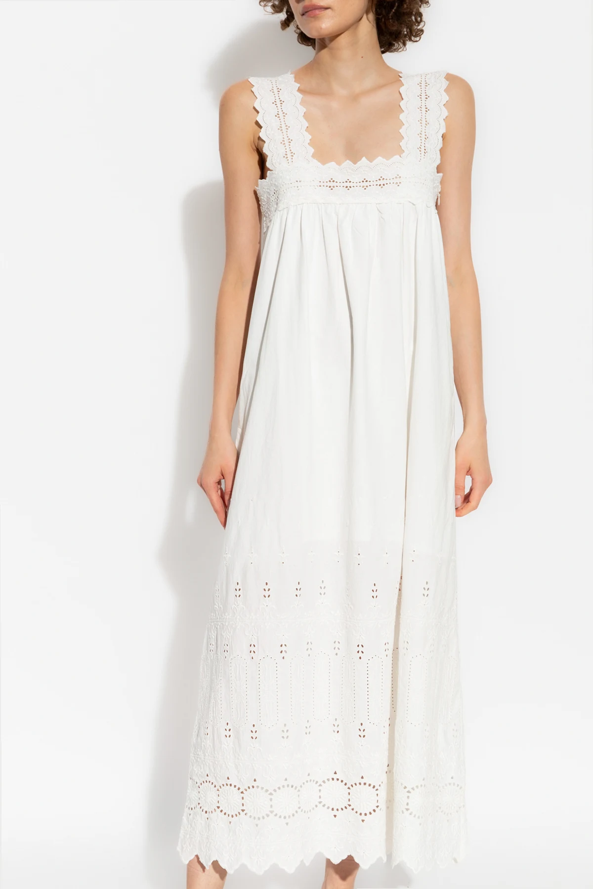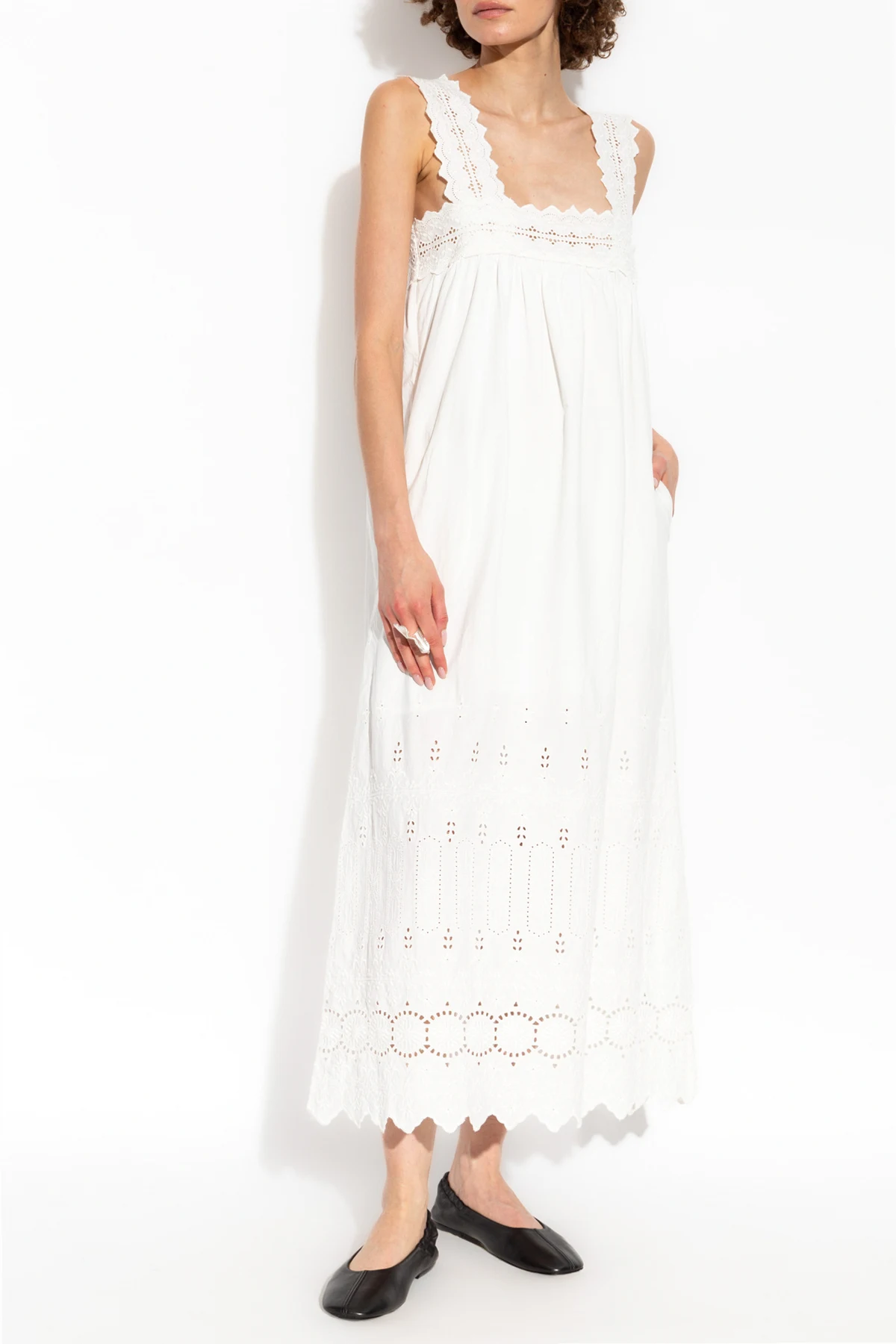 Aus leichter, weißer Baumwolle gefertigt, ist das Kleid luftig und ideal für Sommertage. Der untere Teil ist mit einer zarten, geometrischen durchbrochenen Stickerei verziert, und die gewellten Ränder der Träger und des Kleides unterstreichen seinen mädchenhaften Charakter.