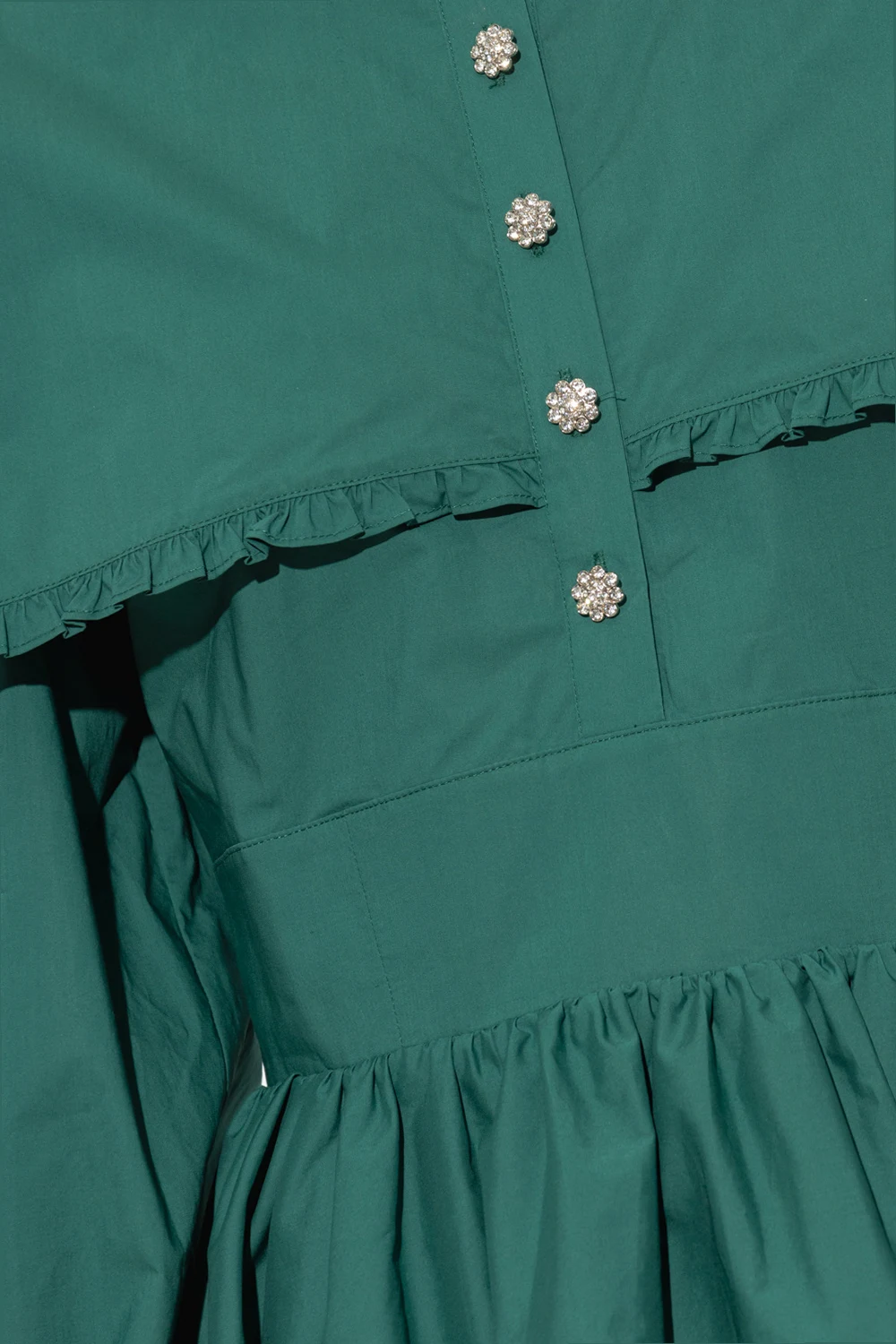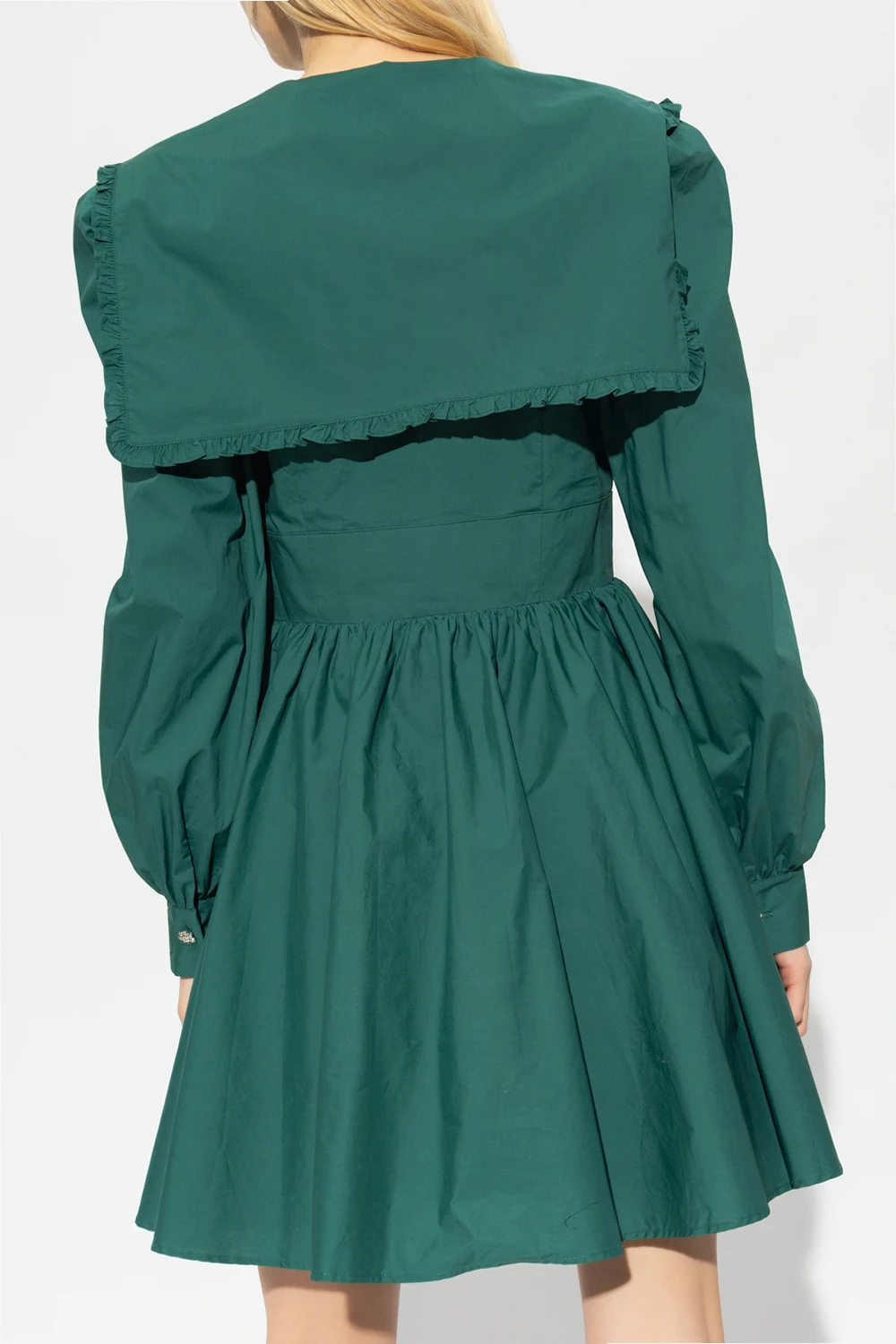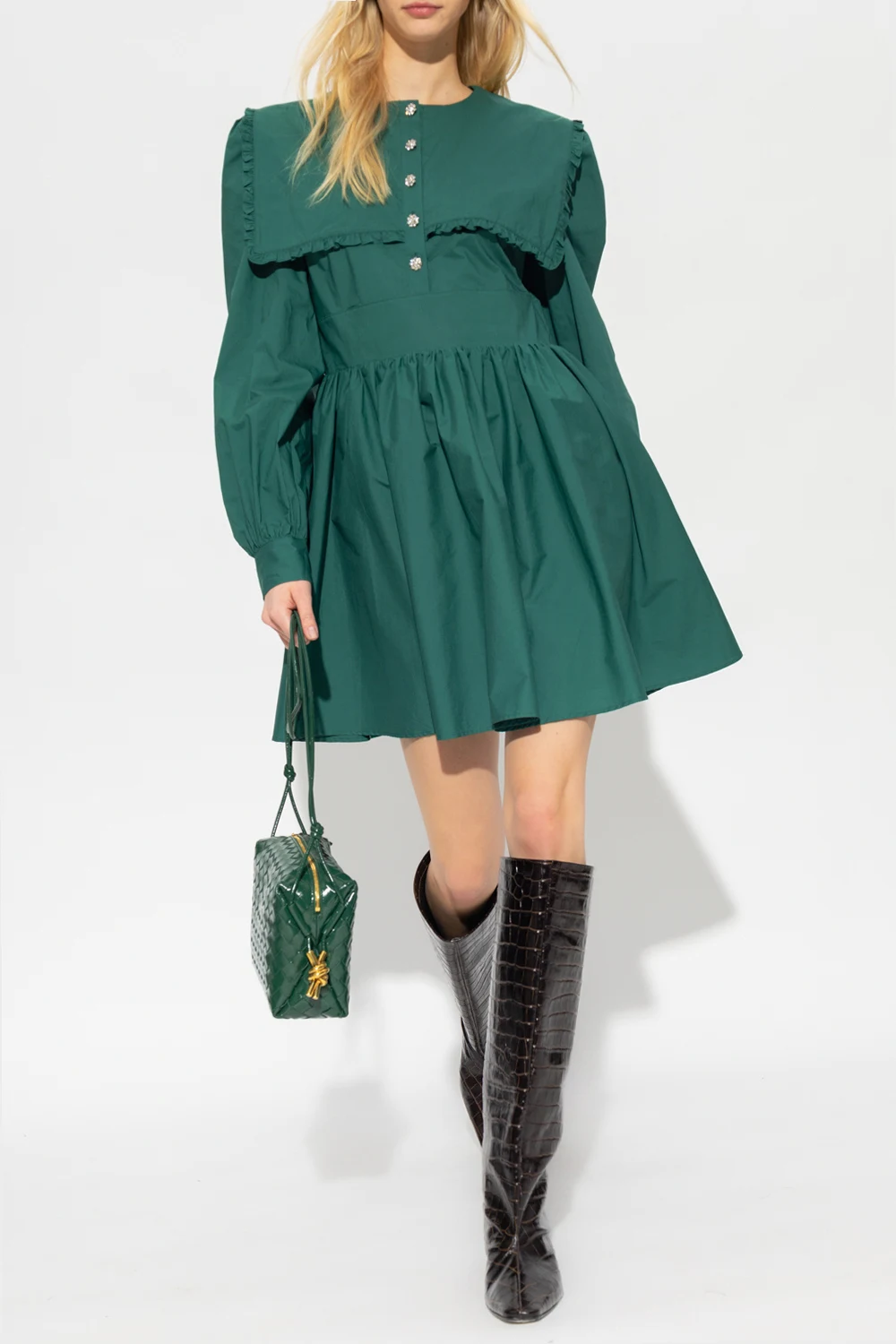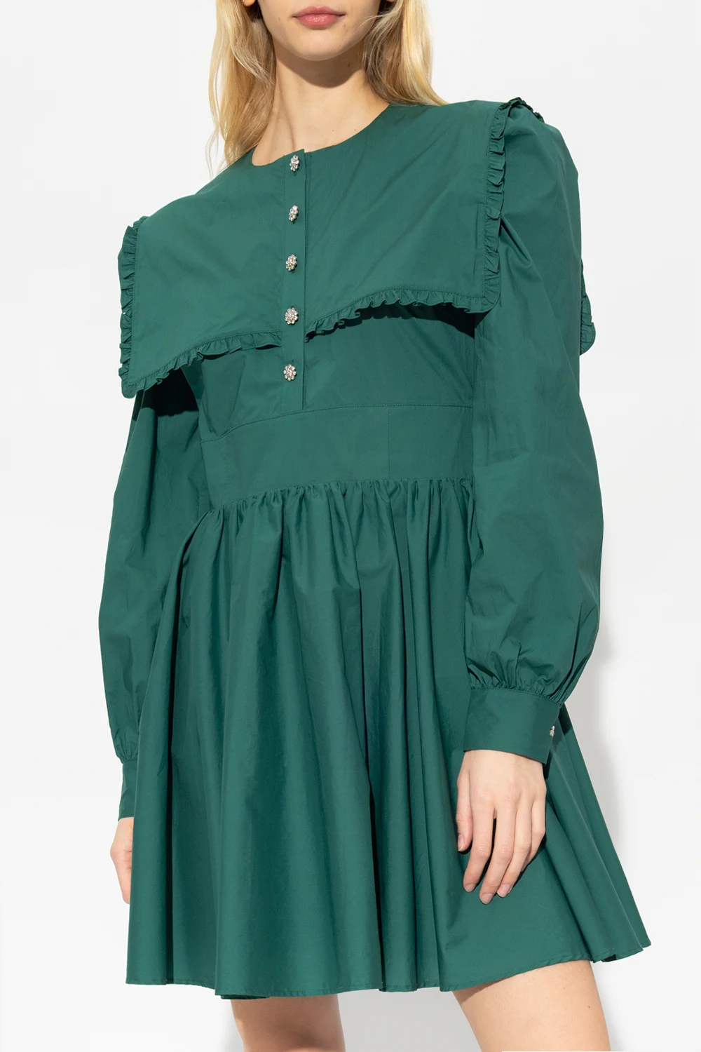 Green ‘Lora’ dress from Custommade. Crafted from organic cotton, this style features distinctive button closures, padded shoulders, ruffled inserts, a flared hem and blouson sleeves.