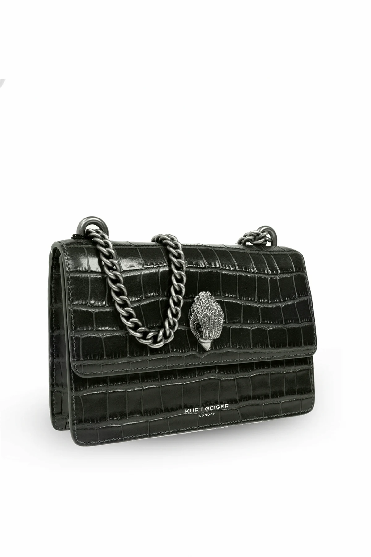 Gefertigt aus hochwertigstem Leder, beeindruckt die Tasche mit einer tiefen, dunkelgrünen Farbe, die ihr exklusives Aussehen unterstreicht. Auf der Vorderseite befindet sich ein metallisches Logo in Form eines Adlerkopfes sowie der Schriftzug "Kurt Geiger London" in Silber, die ihr Prestige verleihen. Eine solide, silberfarbene Metallkette dient als Schulterriemen und sorgt für angenehmen Tragekomfort.