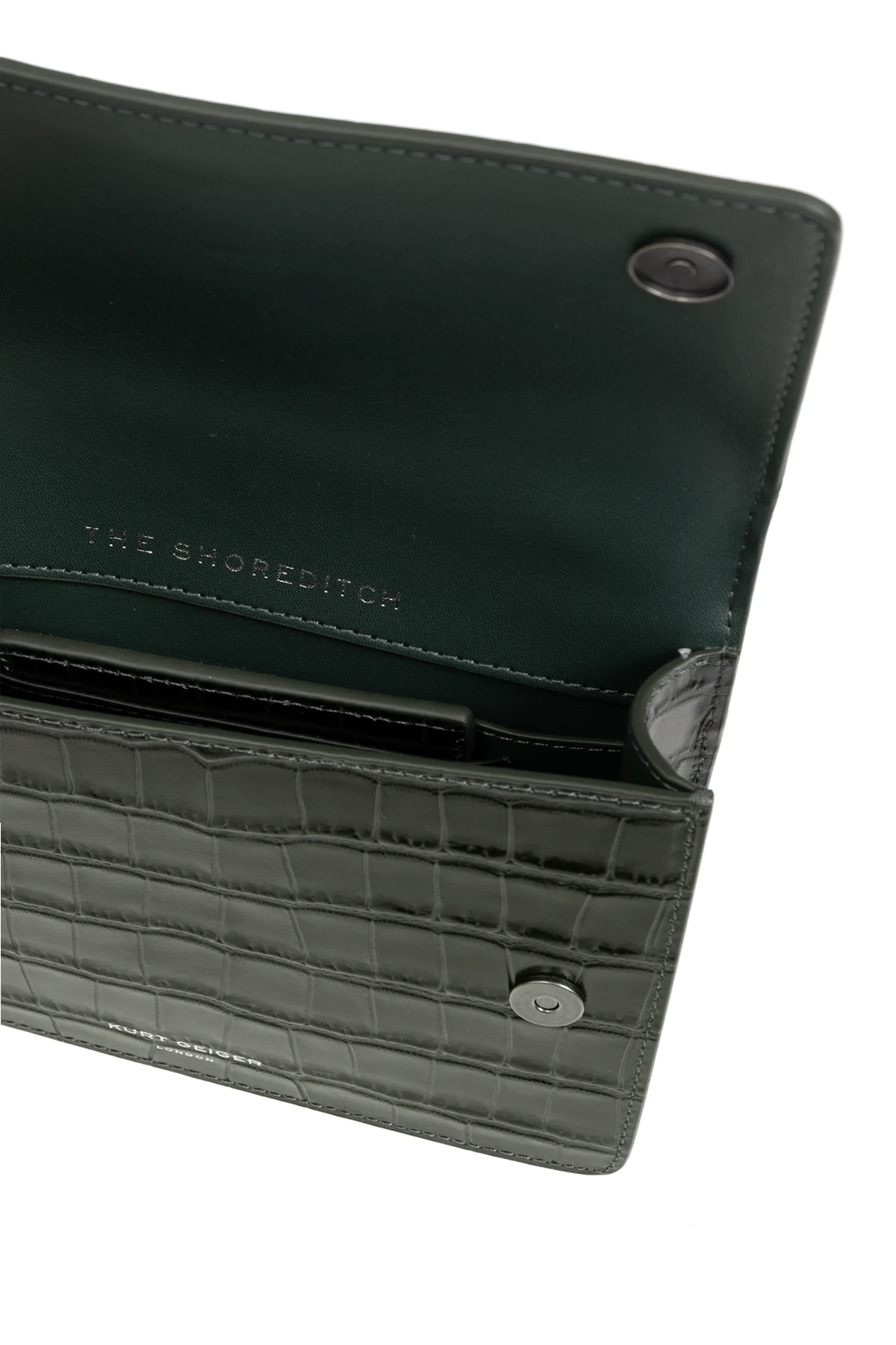 Das mit dunkelgrünem Stoff ausgekleidete Innere der Tasche enthält ein Hauptfach und eine Einschubtasche, und auf der inneren Klappe prangt der Schriftzug "THE SHOREDITCH". Die Tasche wird mit einem Magnetverschluss geschlossen, der die Sicherheit der darin aufbewahrten Gegenstände gewährleistet.