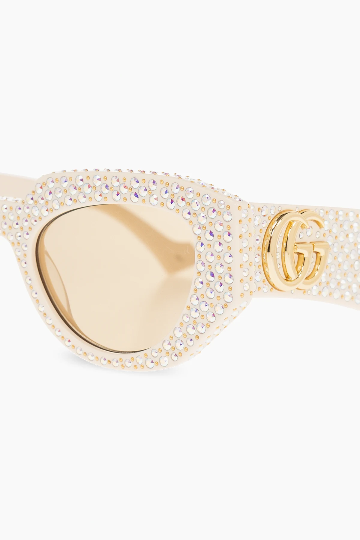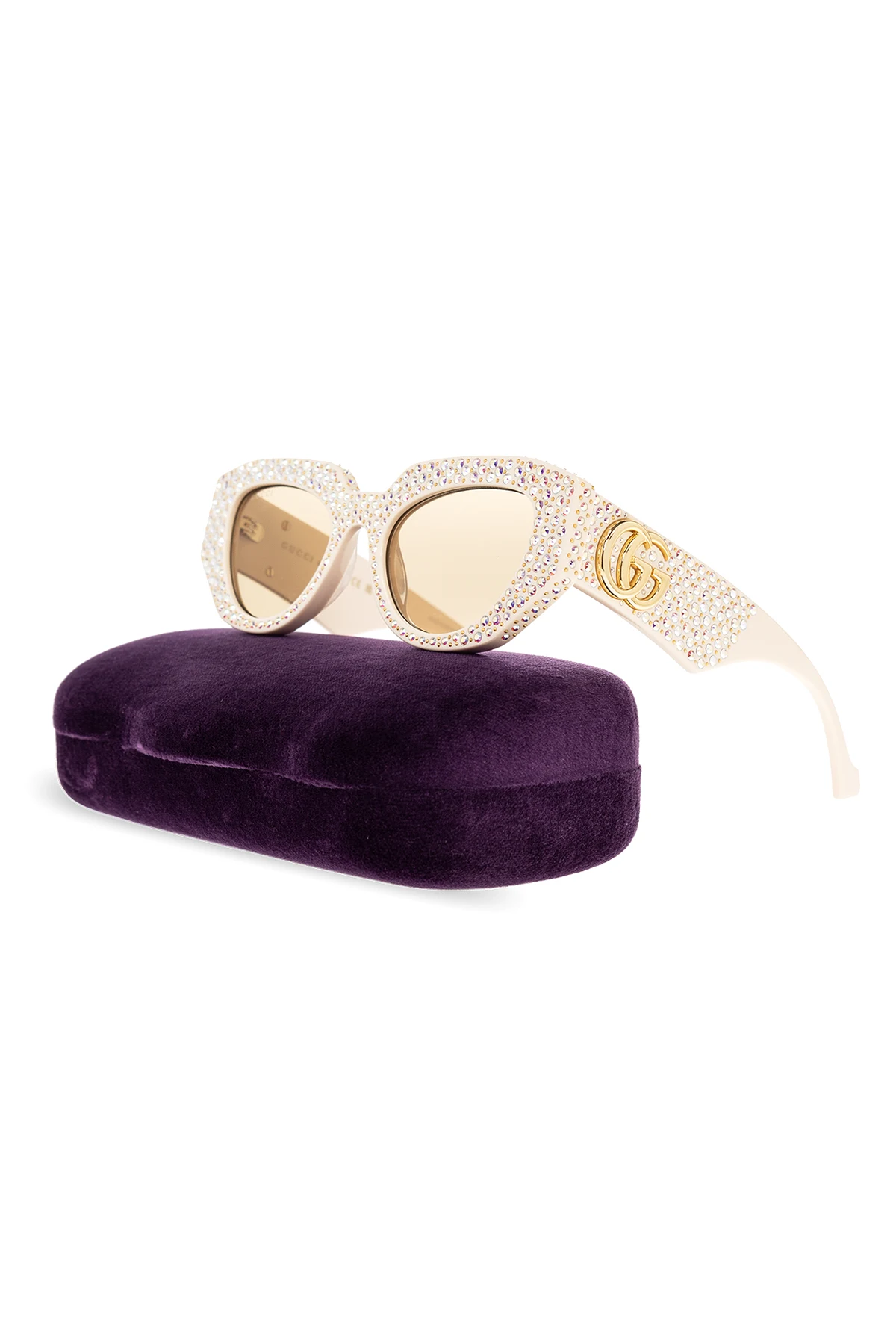 Cream sunglasses from Gucci. This pair features a cat-eye frame, multicolored crystals, gold-tone studs, wide temples with a gold-tone logo and brown lenses with 100% UV protection. Case color individually selected for each pair of glasses.