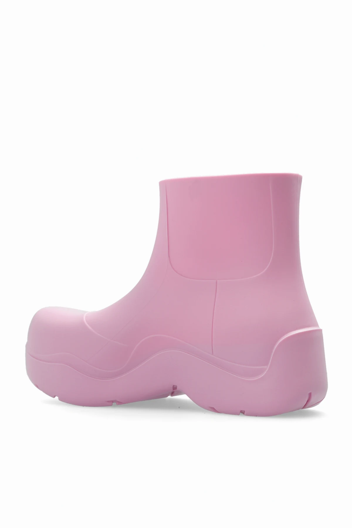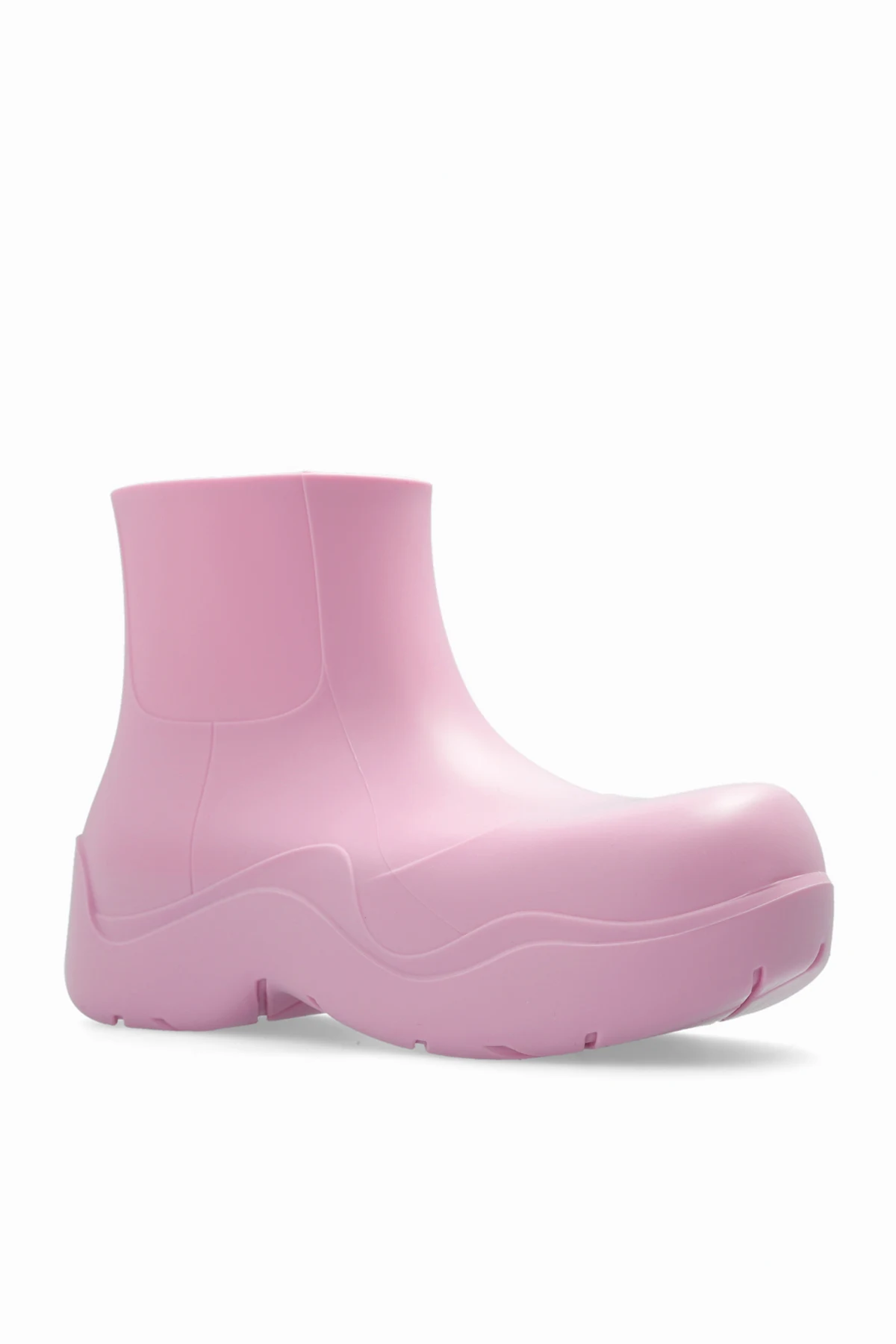 Pink ‘Puddle’ short rain boots from Bottega Veneta. Crafted from biodegradable material with a seamless construction, this model features a cotton lining.