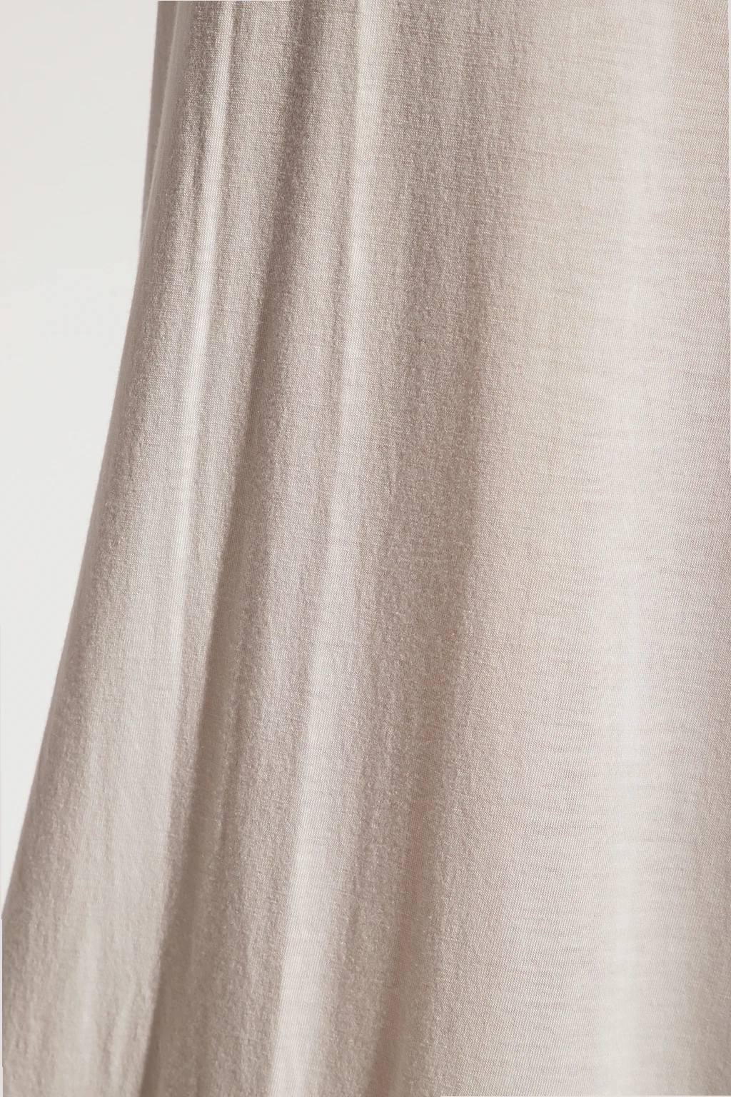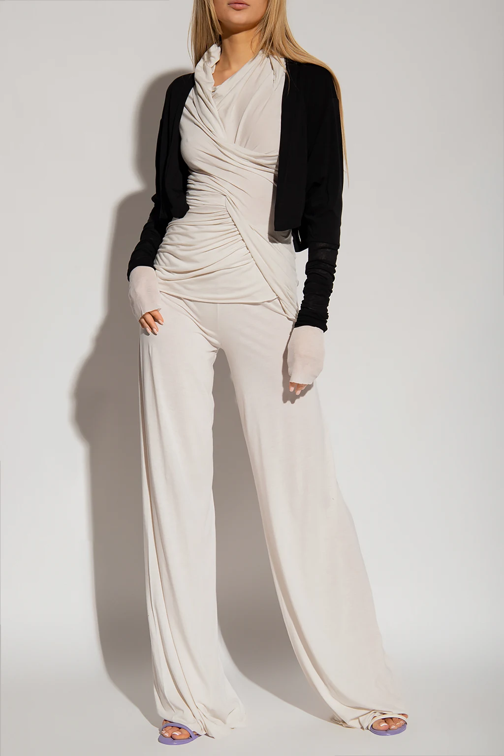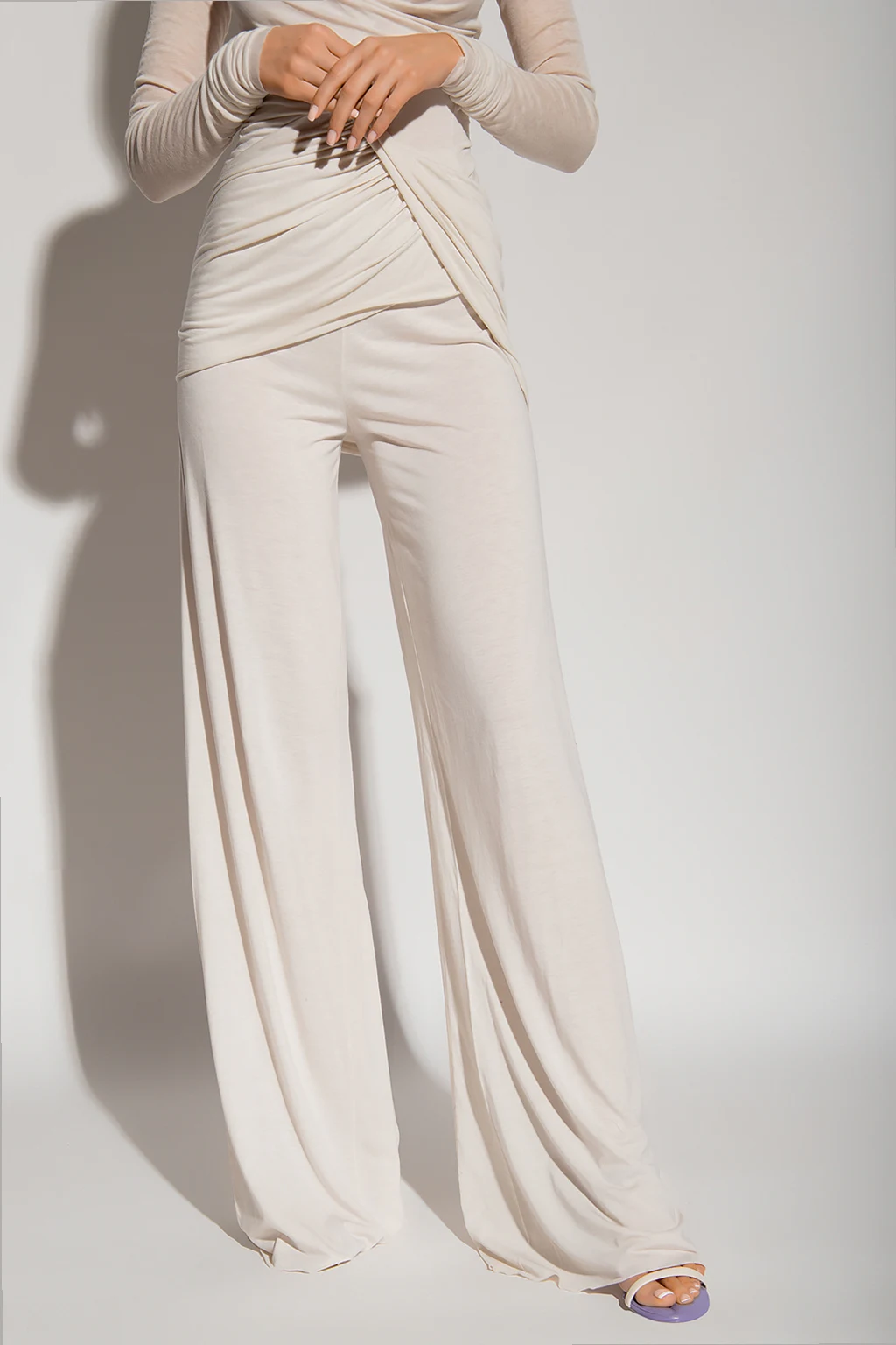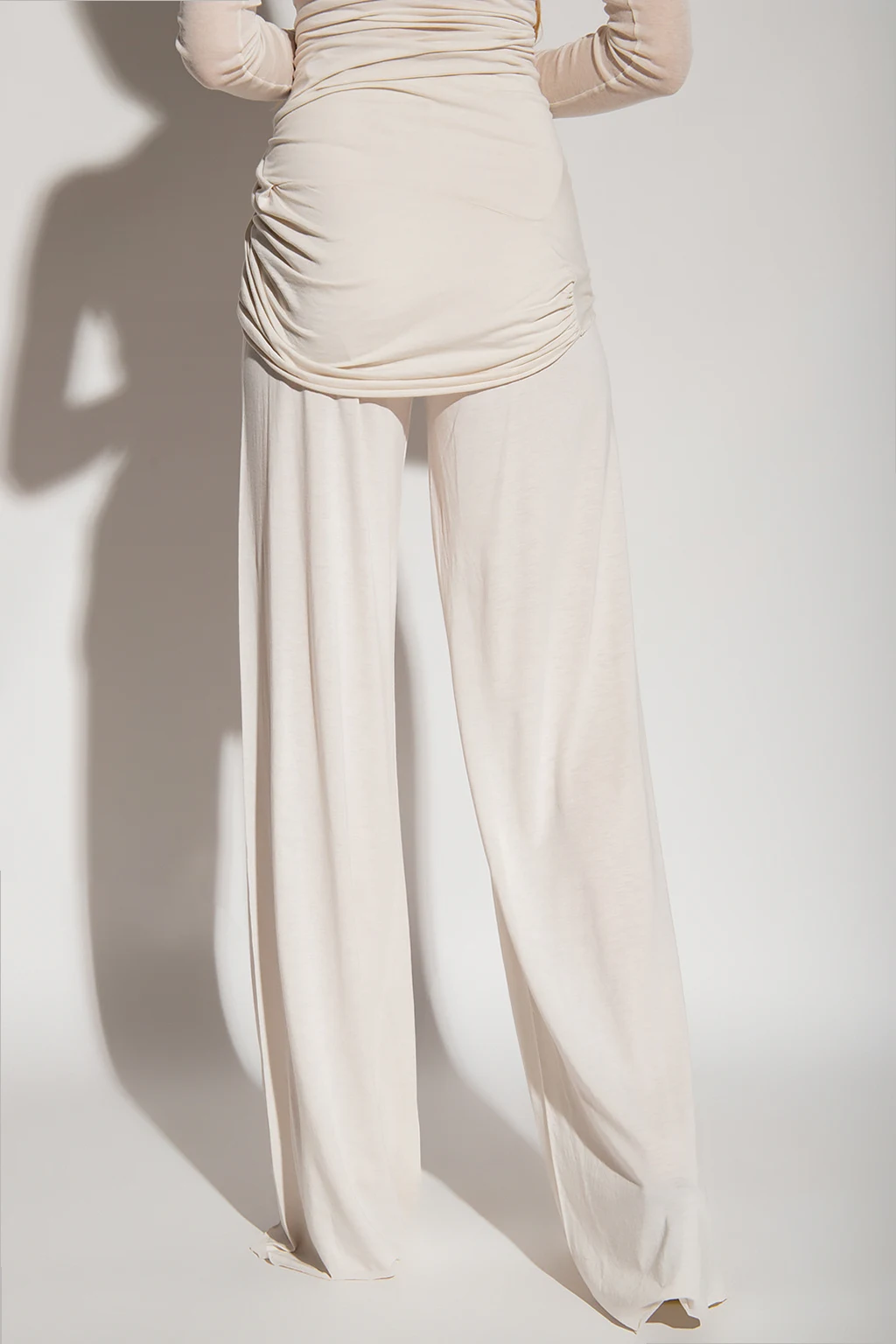 Cream trousers from Rick Owens Lilies. This flared pair features an elastic waistband and raw cut edges.