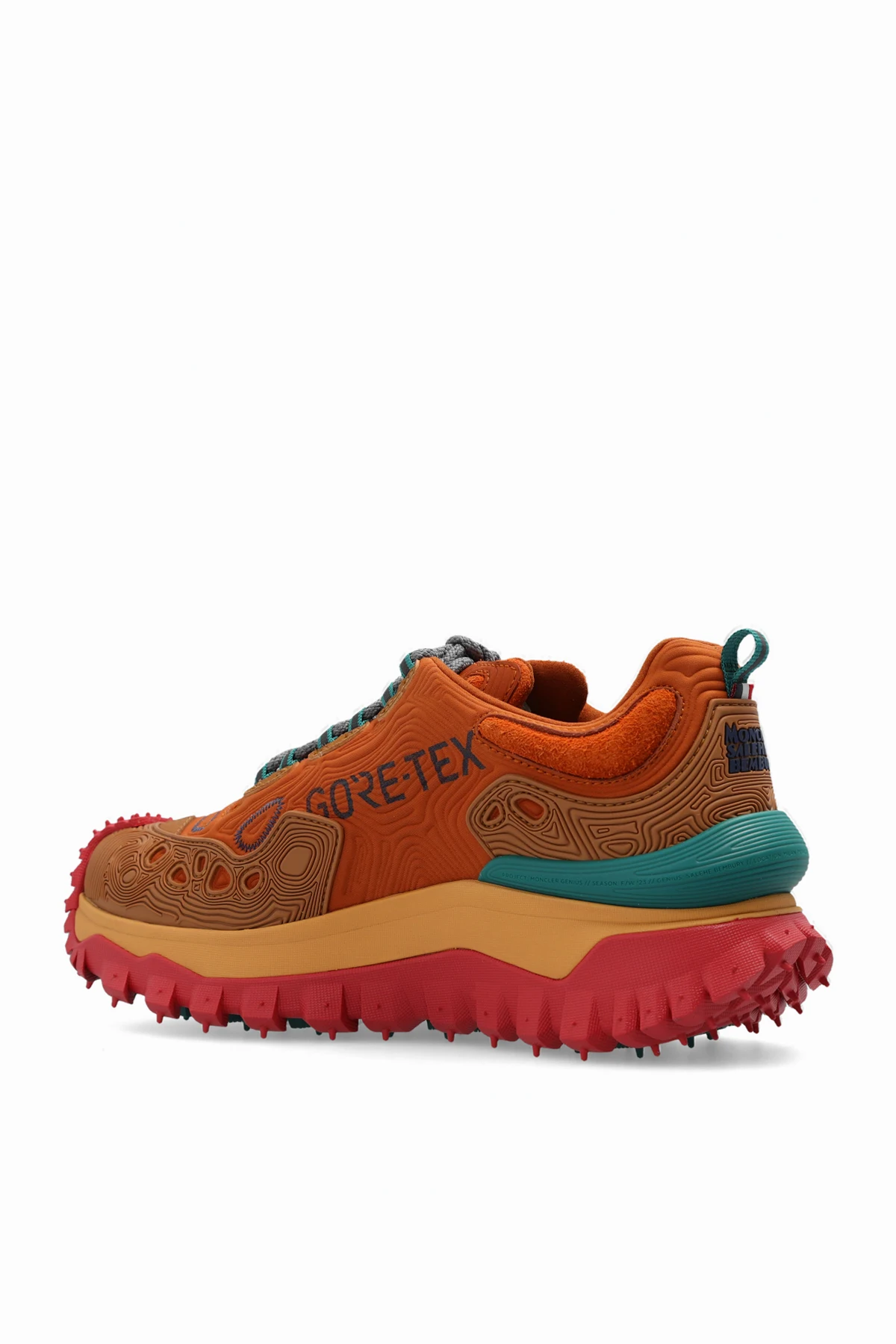Multicoloured ‘Trailgrip’ waterproof sneakers from Moncler Genius, the '5 Moncler Salehe Bembury' collection. Sitting on an EVA midsole that adds flexibility and lightness, this model showcases a highly-resistant nylon upper, enriched with emblematic fingerprint stitching. The Vibram MEGAGRIP sole adds traction and slip resistance to the style. An easily washable OrthoLite® insole enhances the shoe's breathability and provides long-term cushioning. The carbon fibre between the midsole and tread helps propulsion, allowing you to go further. The sneaker comes with an additional set of laces and an additional cork footbed.
