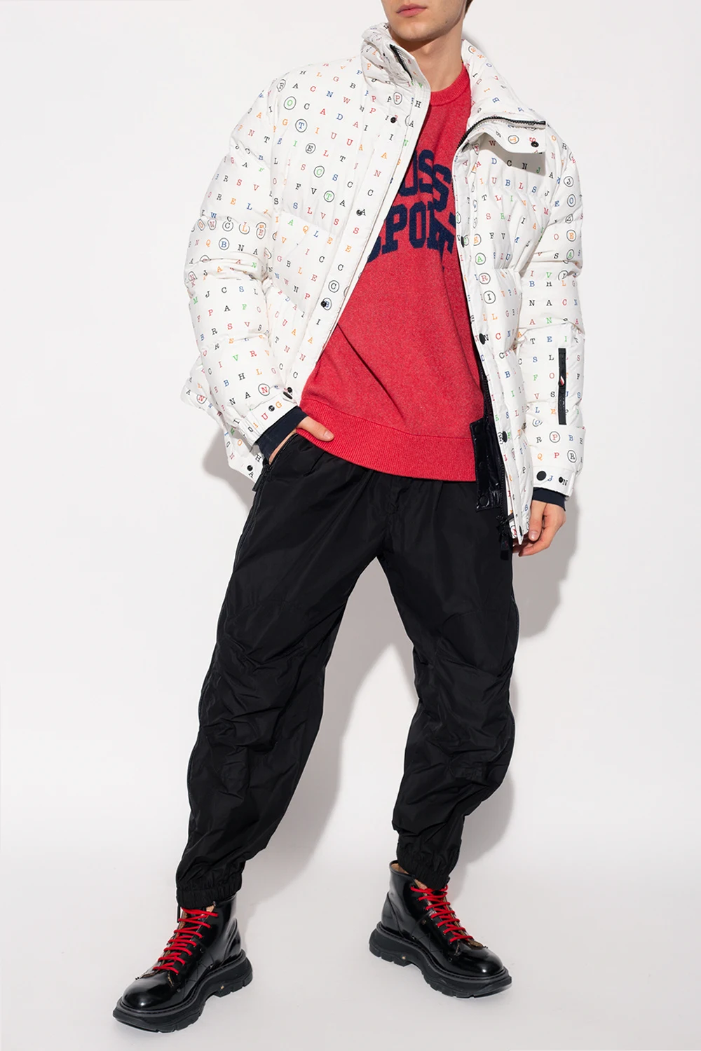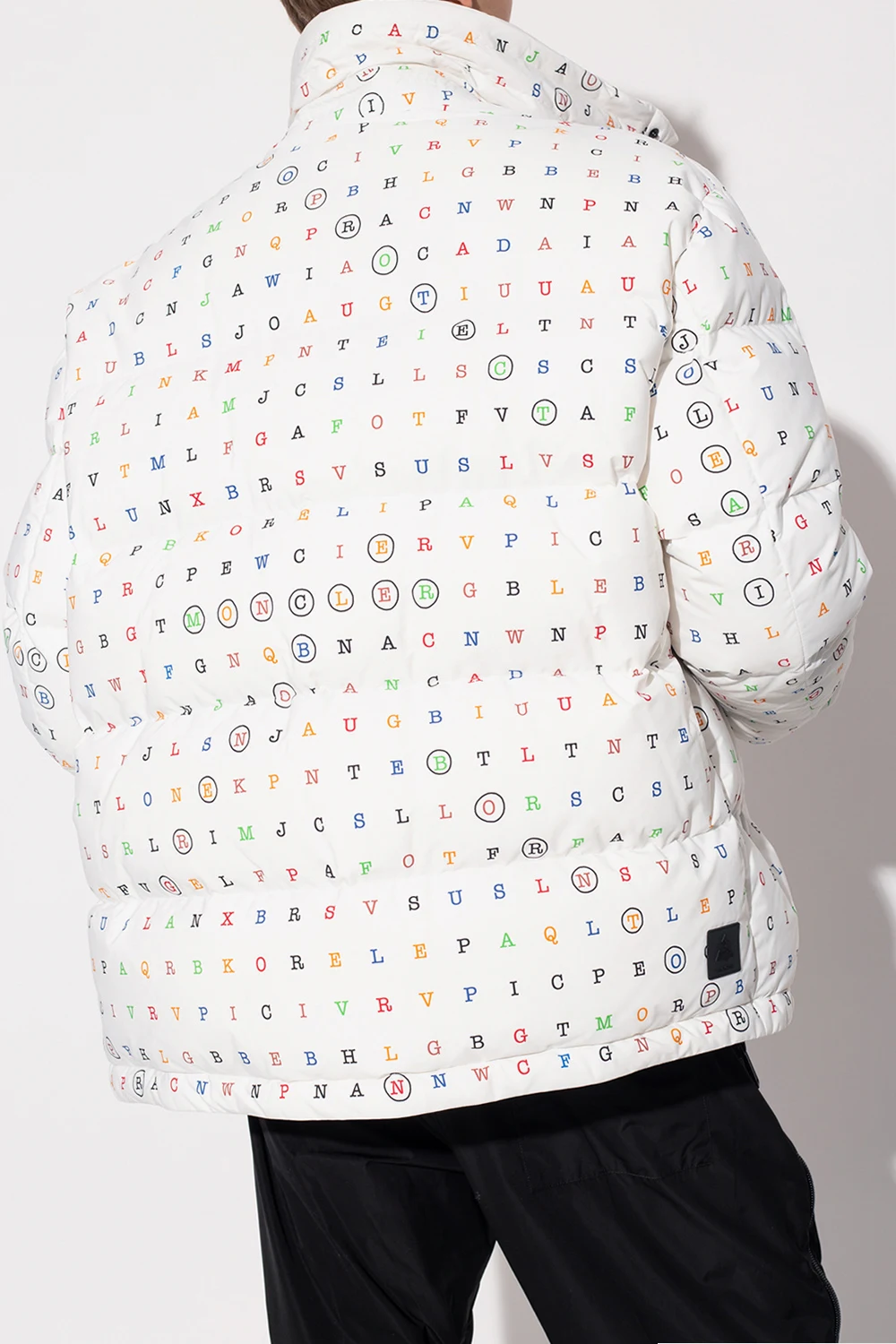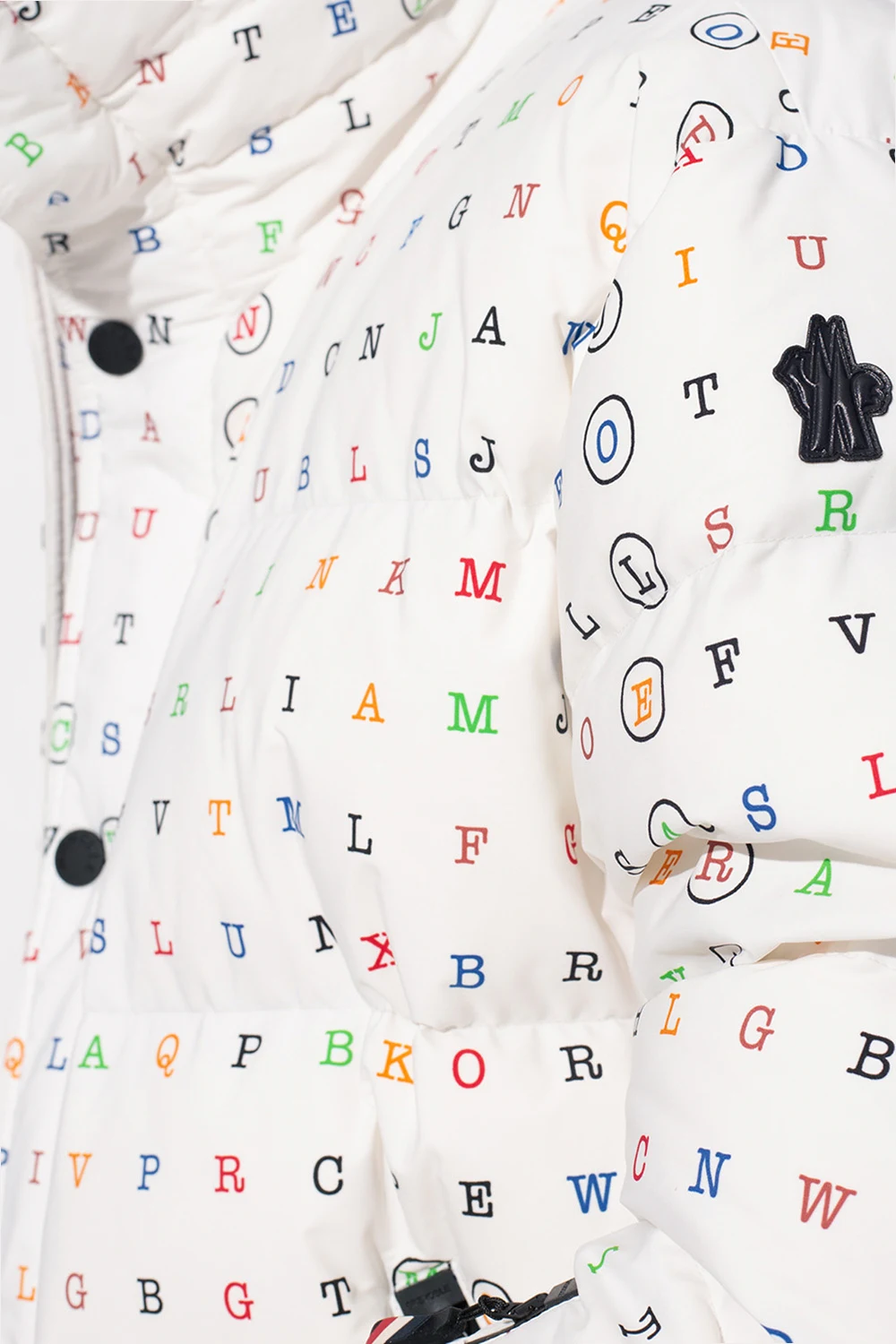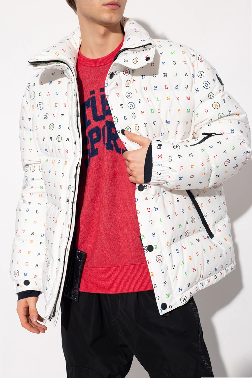 White ‘Arlaz’ down jacket from Moncler Genius. The design is part of the ‘3 Moncler Grenoble’ collection. Fastened with a two-way zip and snaps, this garment is decorated with a multicolored pattern and a sleeve patch with a logo. It is complete with a three zip pocket, long sleeves with ribbed cuffs and thumbholes as well as an elasticated hem with drawstrings. The jacket has insulating, water- and wind-proofing properties.