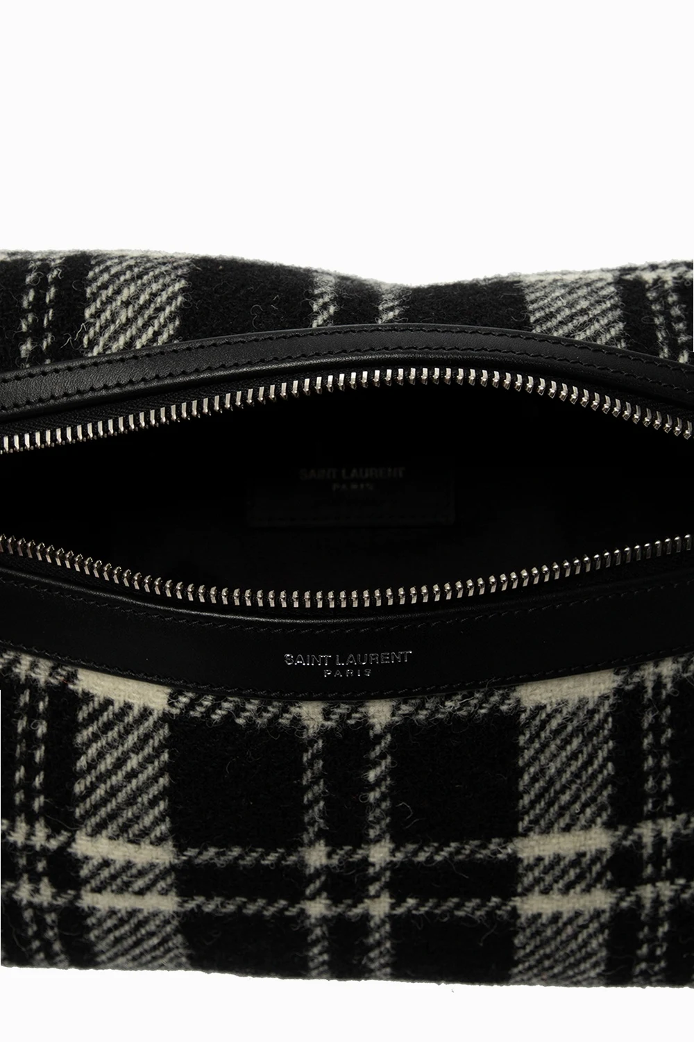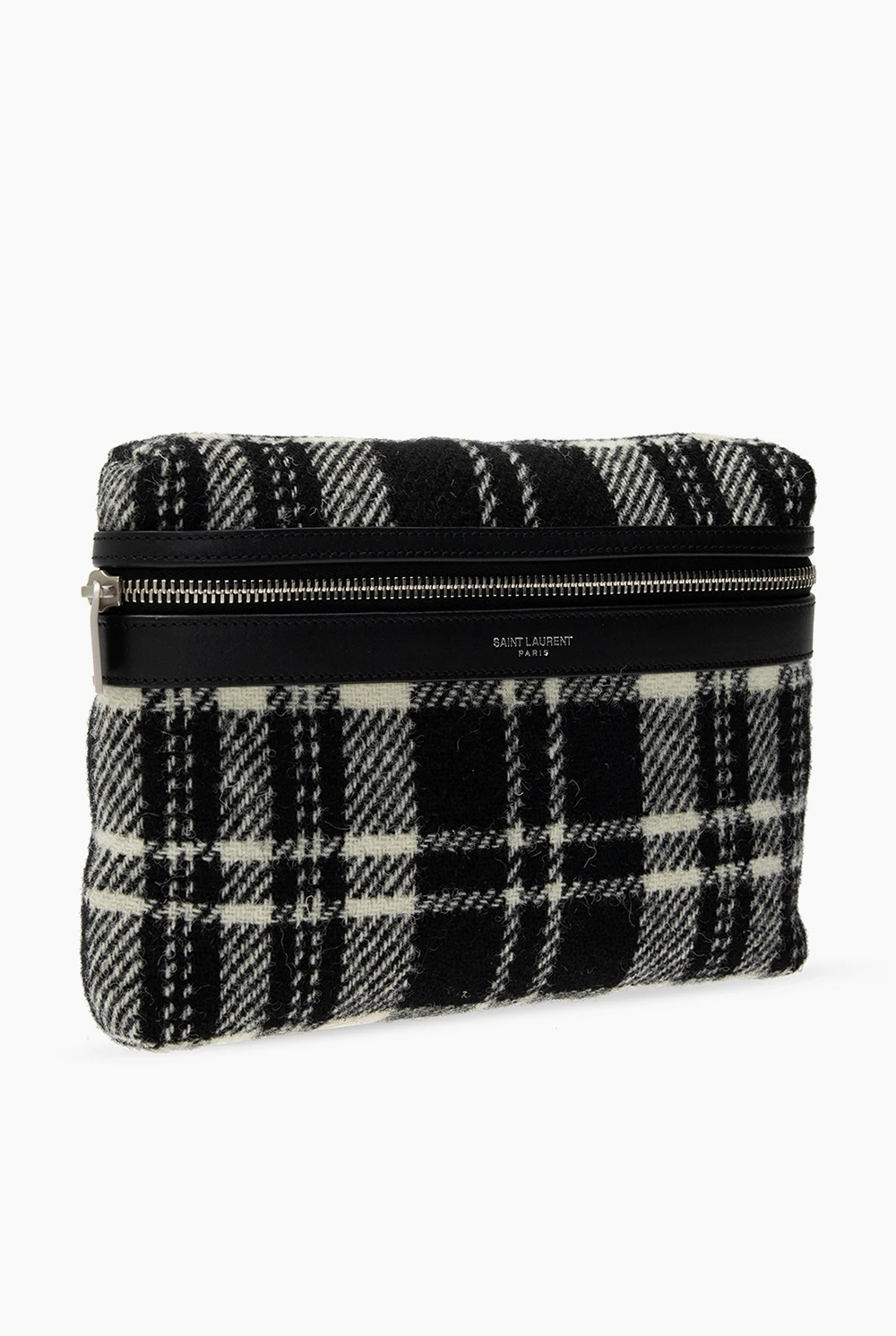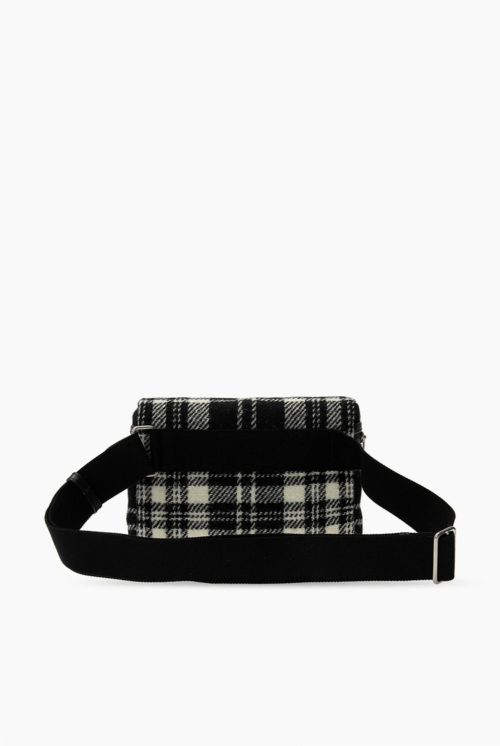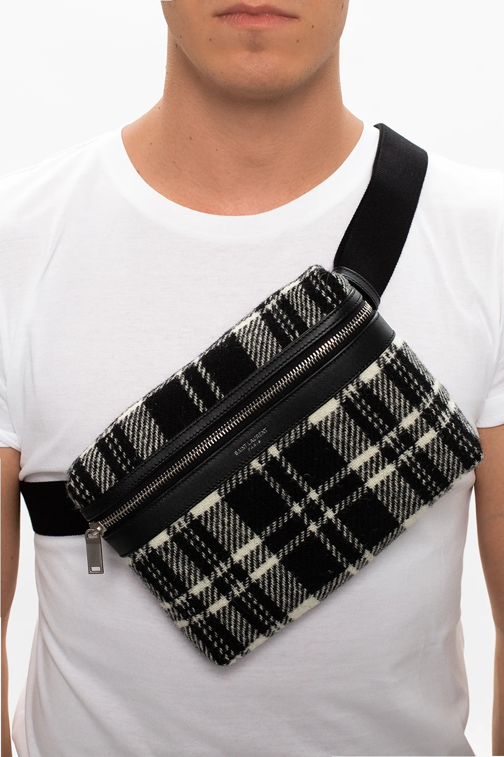 Black and white ‘City’ belt bag from Saint Laurent. Rendered in tartan motif with bovine leather finishes and silver-tone logo embossing, this design employs zip closure, an external zipped pocket on the back, an adjustable strap, silver-tone metal hardware and interior with one compartment and one zipped pocket.