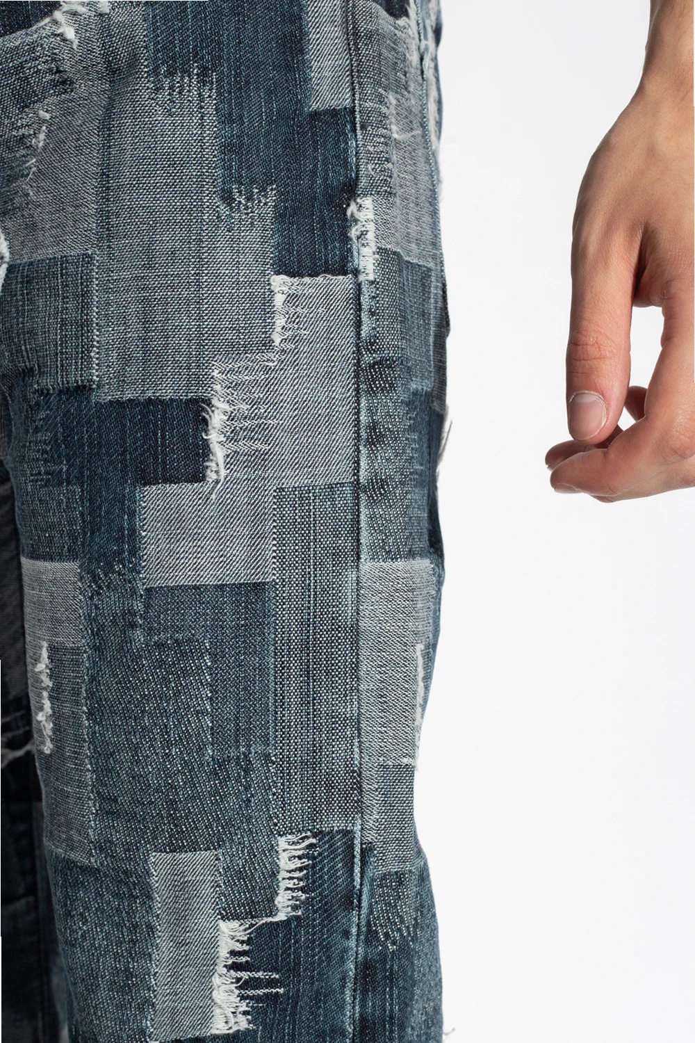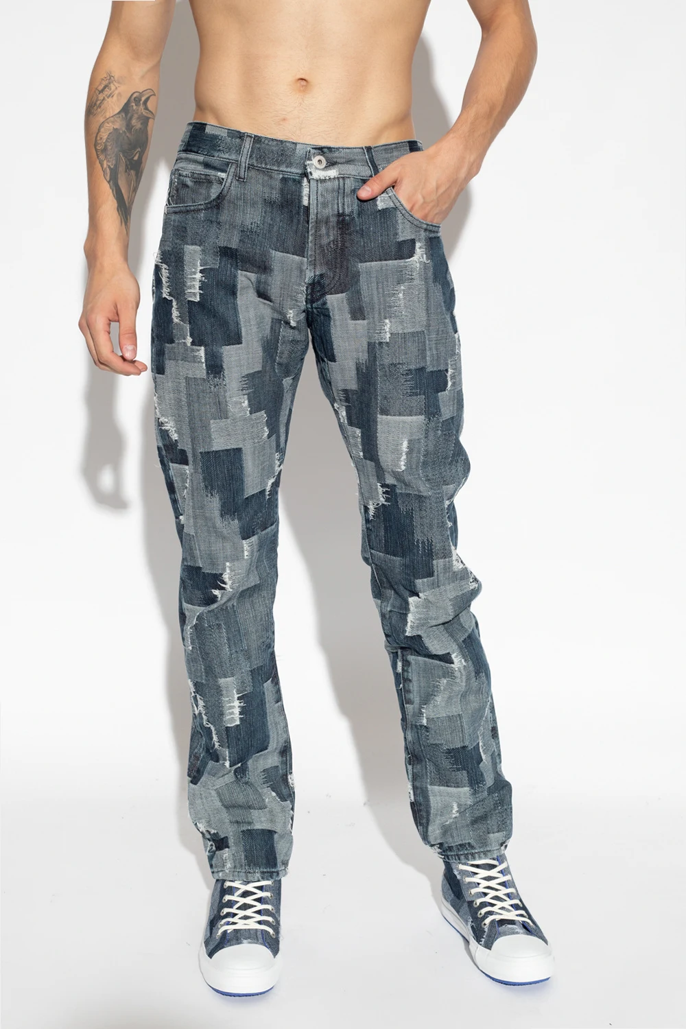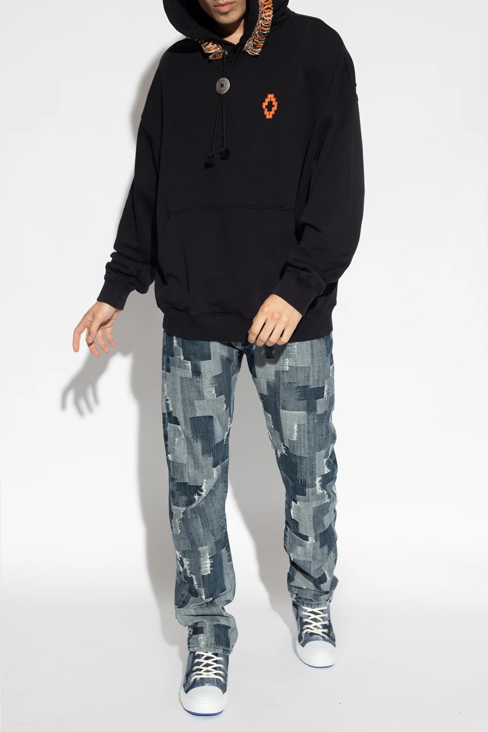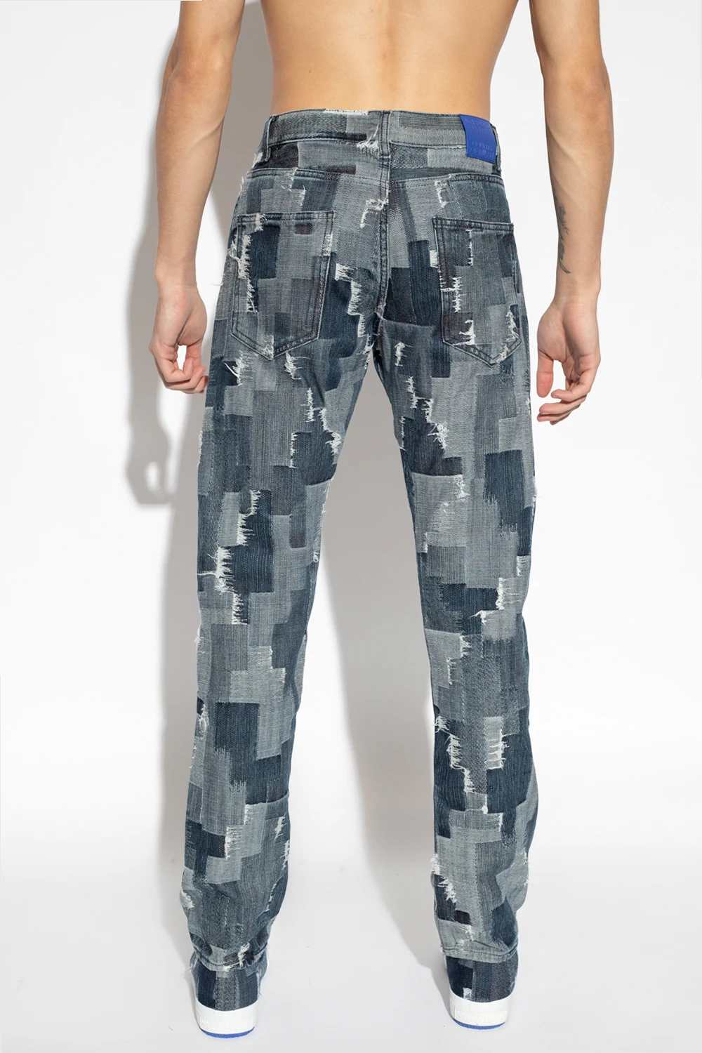 Blue and white jeans from Marcelo Burlon. Crafted from cotton, this pair falls with slightly tapered legs and features button fastenings, classic five pockets, exposed stitching details and a blue patch with an embossed logo at the back.