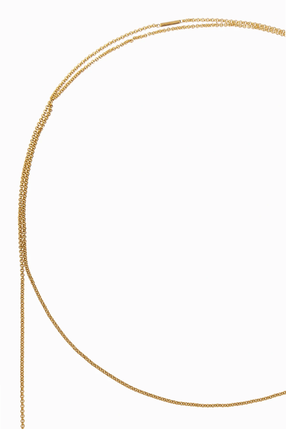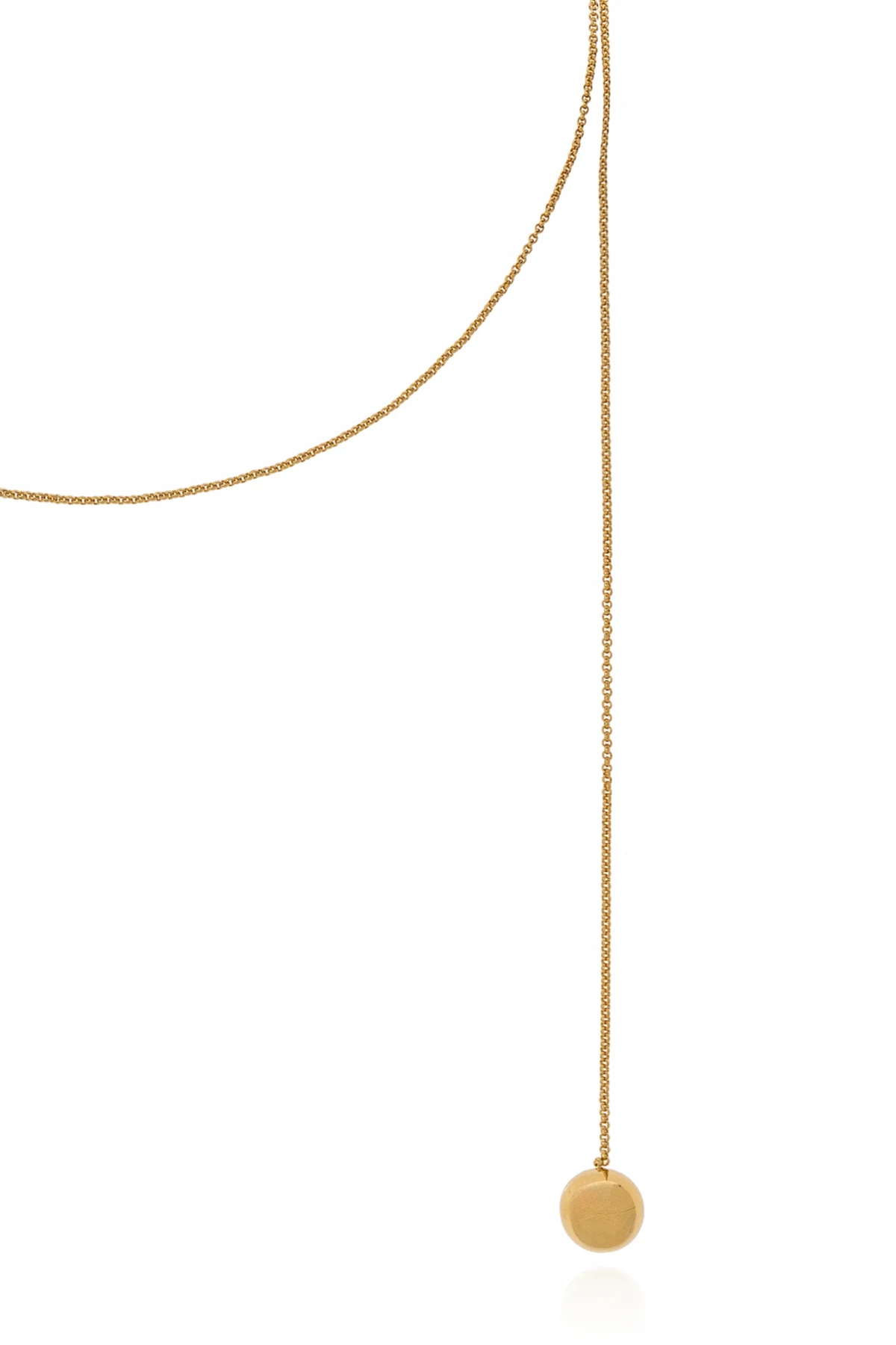 Gefertigt aus Metall mit goldener Beschichtung strahlt die Halskette Eleganz und Luxus aus. Das Fehlen sichtbarer Schriftzüge und Logos des Designers verleiht ihr ein minimalistisches und modernes Aussehen, während die glatten Endkugeln ihre Subtilität betonen.