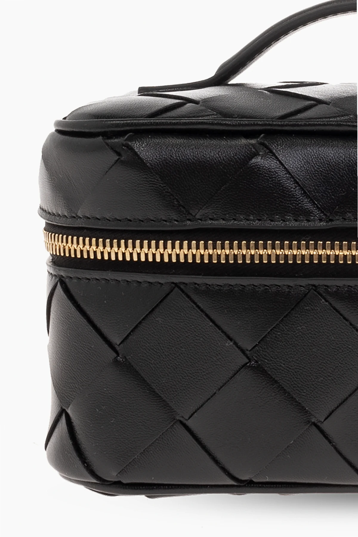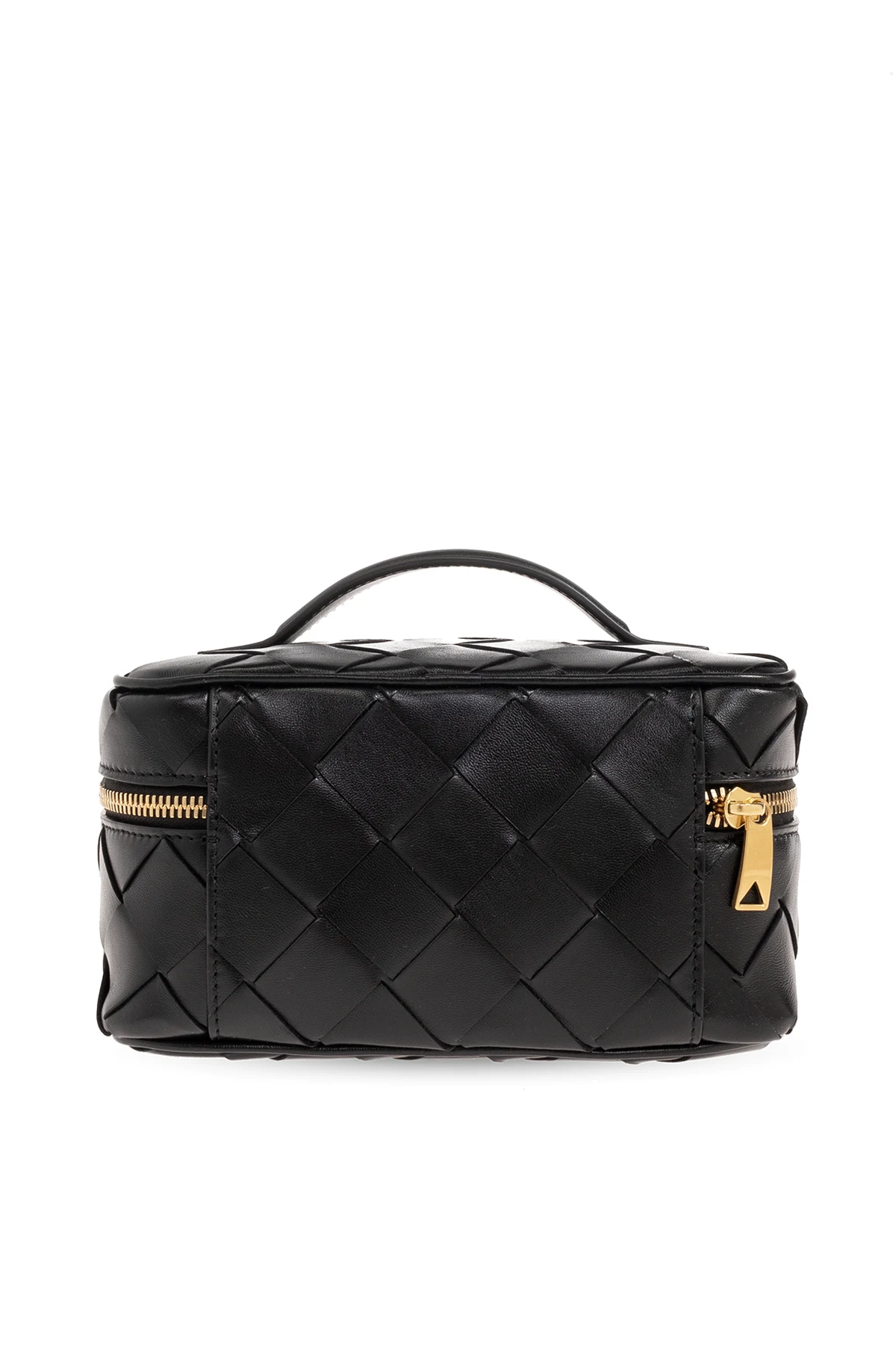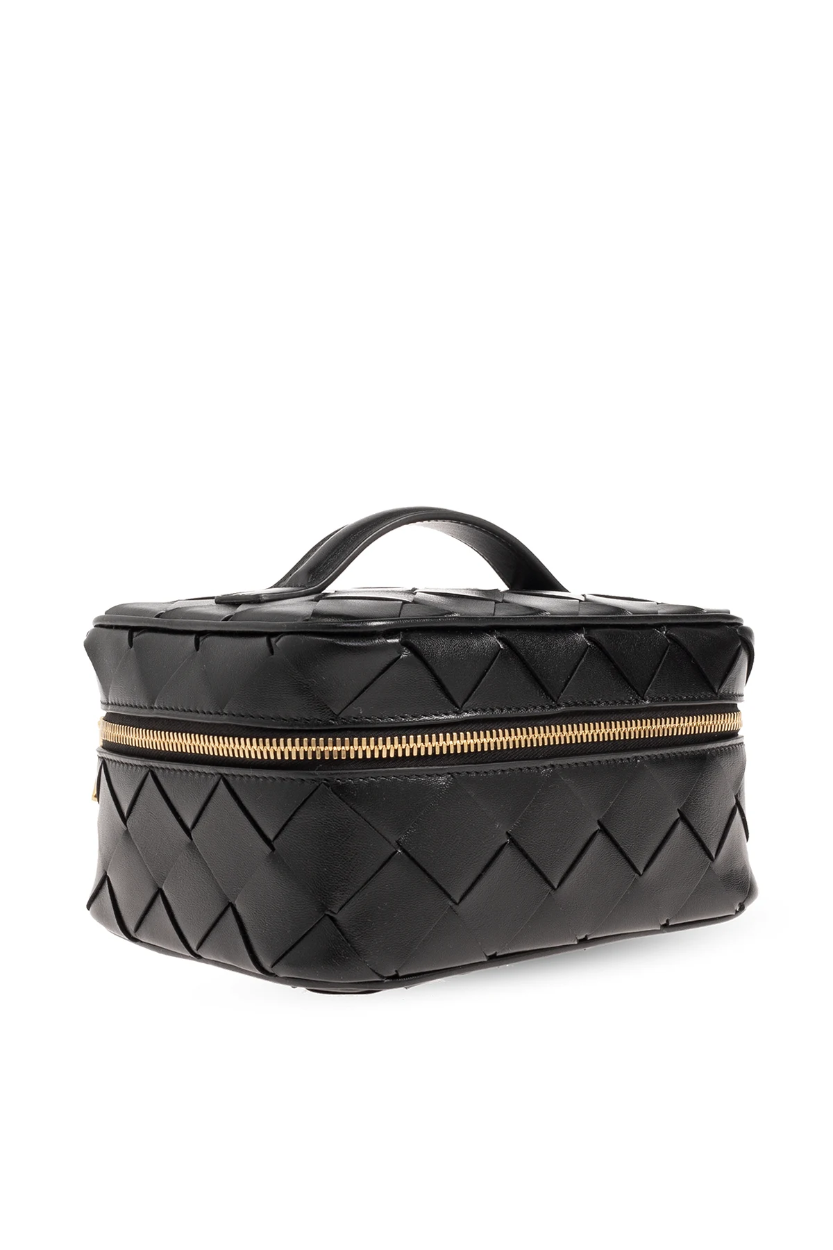Black wash bag from Bottega Veneta. Made of lamb leather accentuated with the brand's signature Intrecciato weave, this design features a zip fastening, one half-round handle, gold-tone metal hardware and one internal compartment.