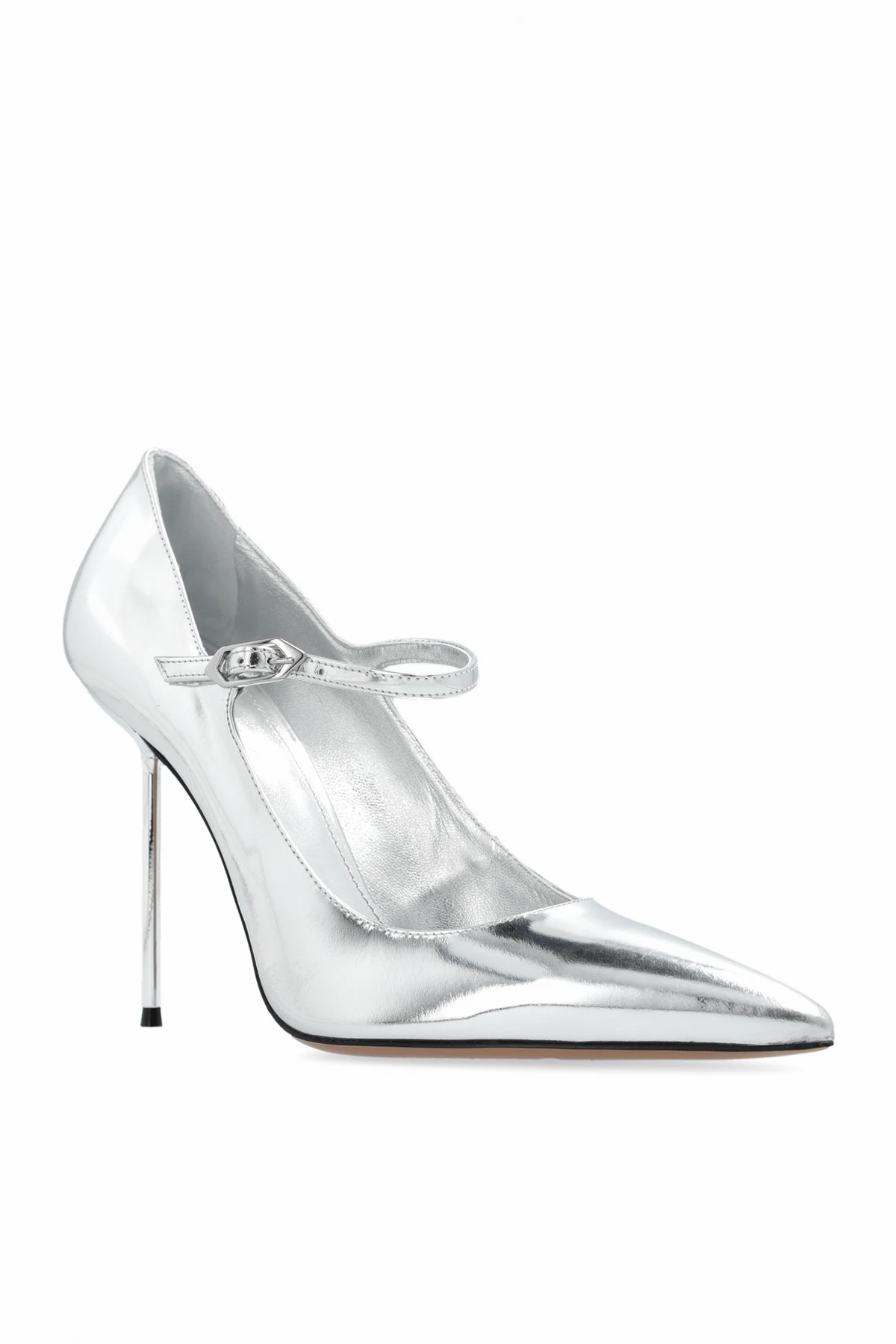 Silver-tone ‘Livia’ pumps from Paris Texas. Made from leather with a mirror effect, this model sits on a beige leather sole and features a pointed toe and an adjustable buckle strap on the front.
