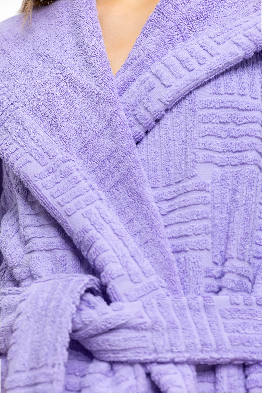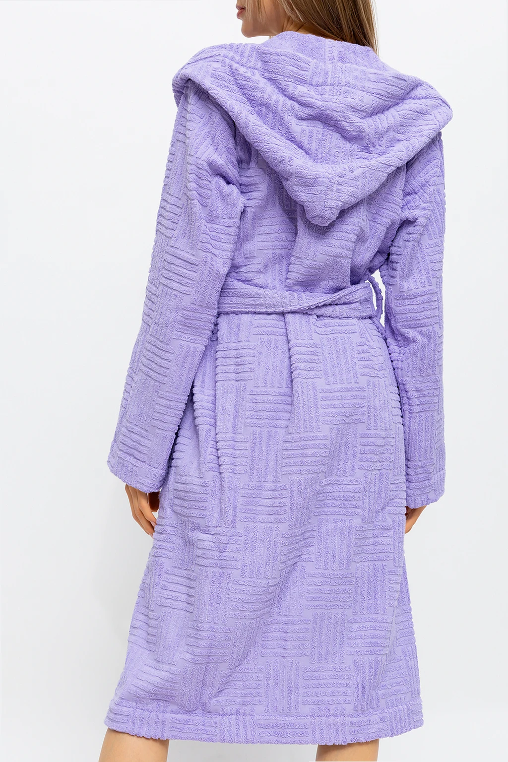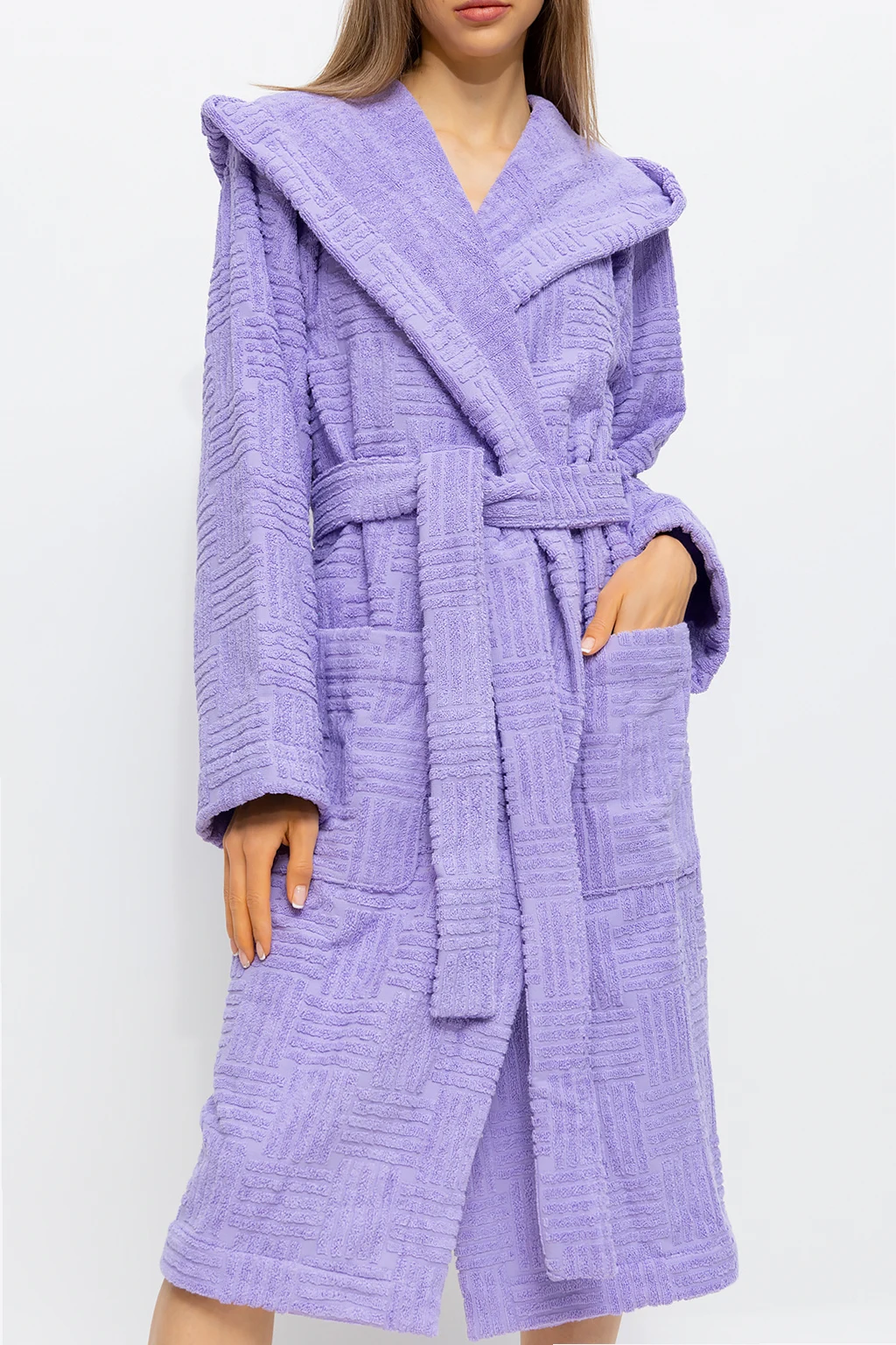 Light purple bathrobe from Bottega Veneta. Made from cotton, this style showcases an embroidered pattern inspired by the brand's signature Intreccio weave. It is complete with a hood, two slip pockets and a waist-cinching belt.