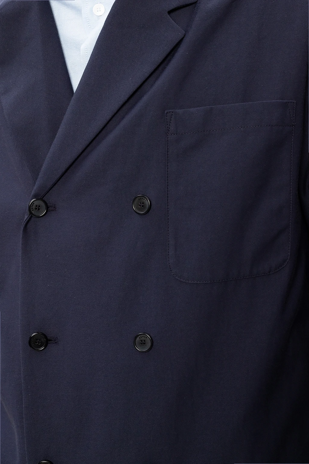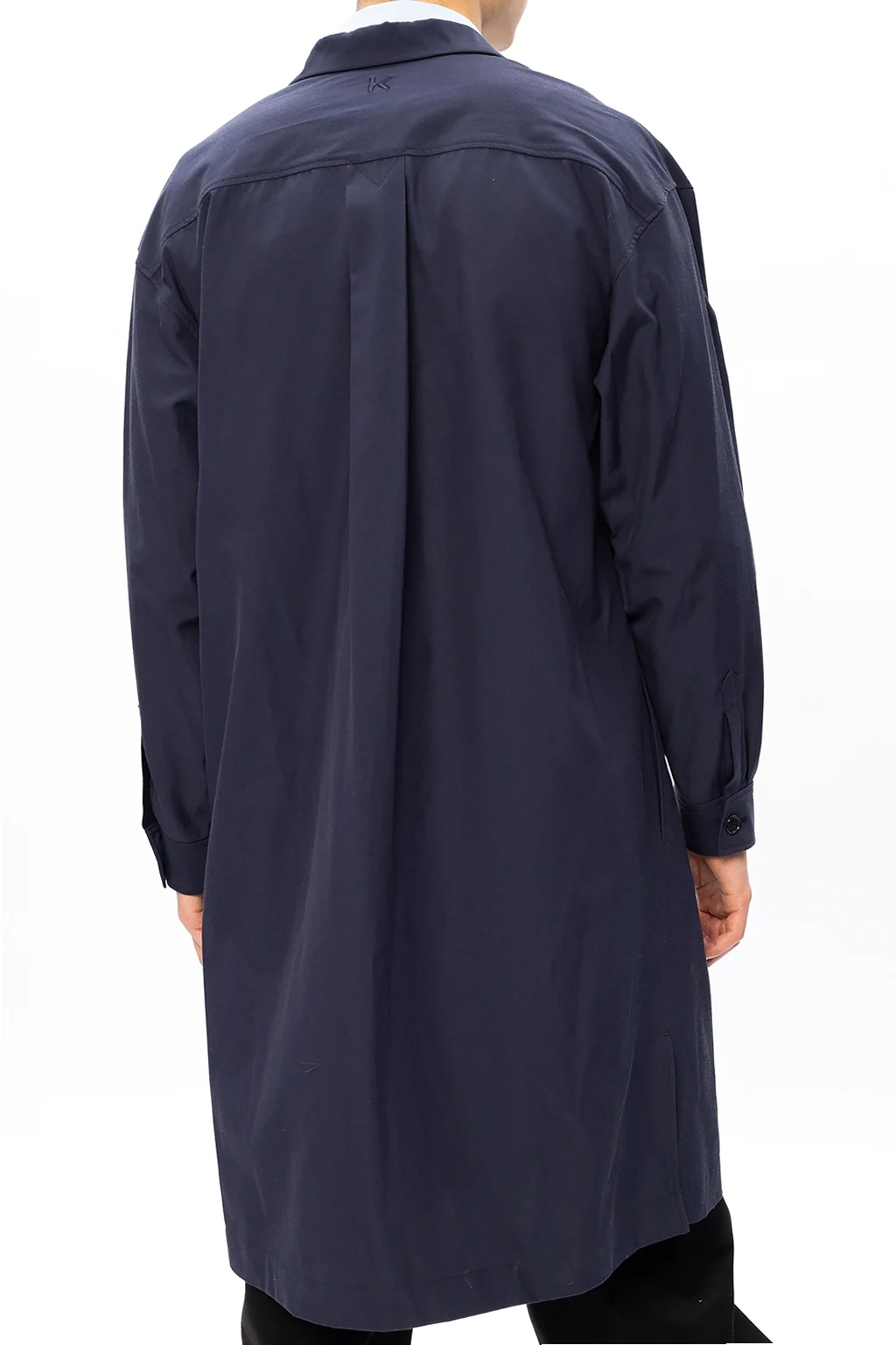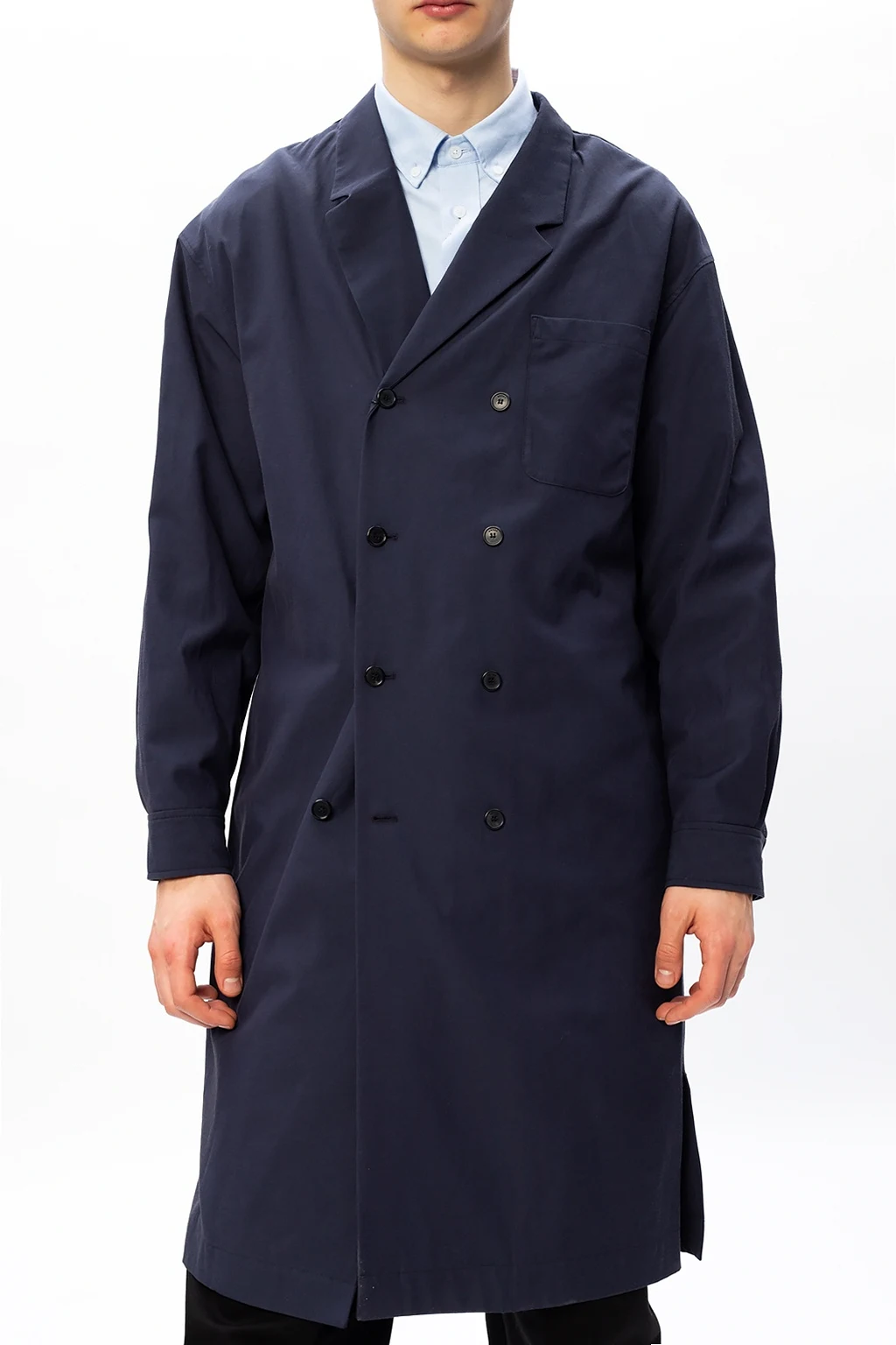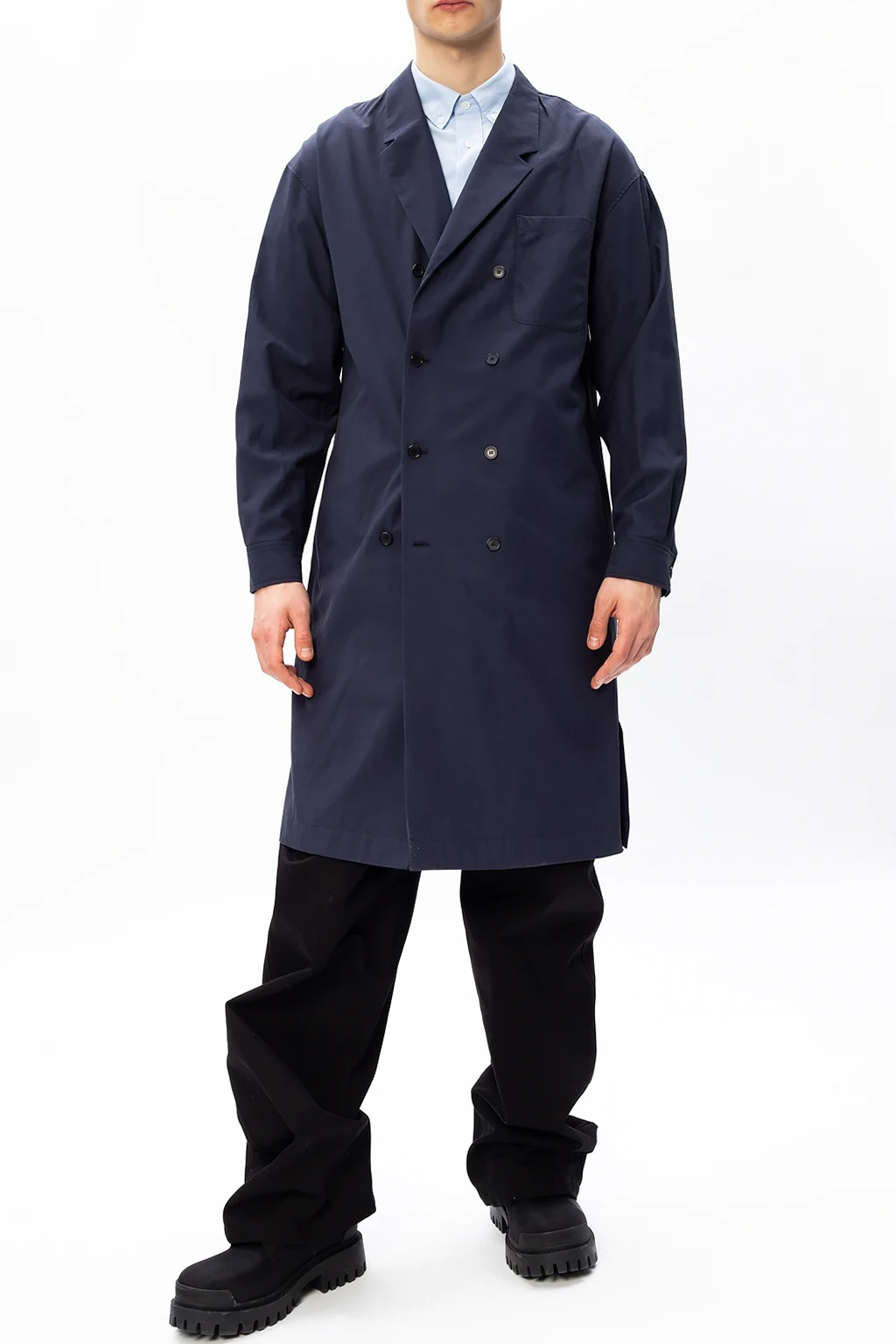 Navy blue coat from Kenzo. Shaped from a cotton-blend fabric with a double-breasted silhouette, this design fastens via buttons and showcases long sleeves with button-fastened cuffs, vents on the sides and a navy blue embroidered detail with the brand's logo on the back.