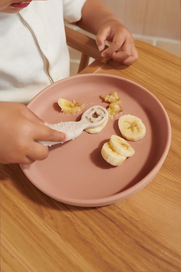 Die Löffel sind aus weichem und flexiblem Silikon gefertigt, das einen sicheren Kontakt mit Lebensmitteln gewährleistet. Ihre strukturierte Konstruktion mit strategisch platzierten Schlitzen sorgt dafür, dass das Essen nicht zurück in die Schüssel fällt, was dem Kind hilft, als unabhängiger Feinschmecker Vertrauen zu gewinnen. Ein zusätzlicher Vorteil ist das Loch am Ende des Griffs, das eine praktische Befestigung ermöglicht.