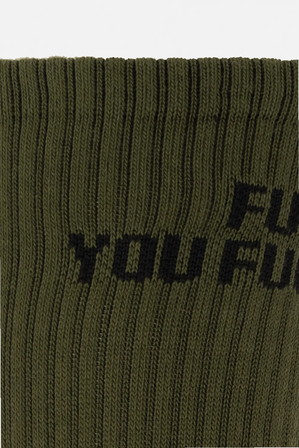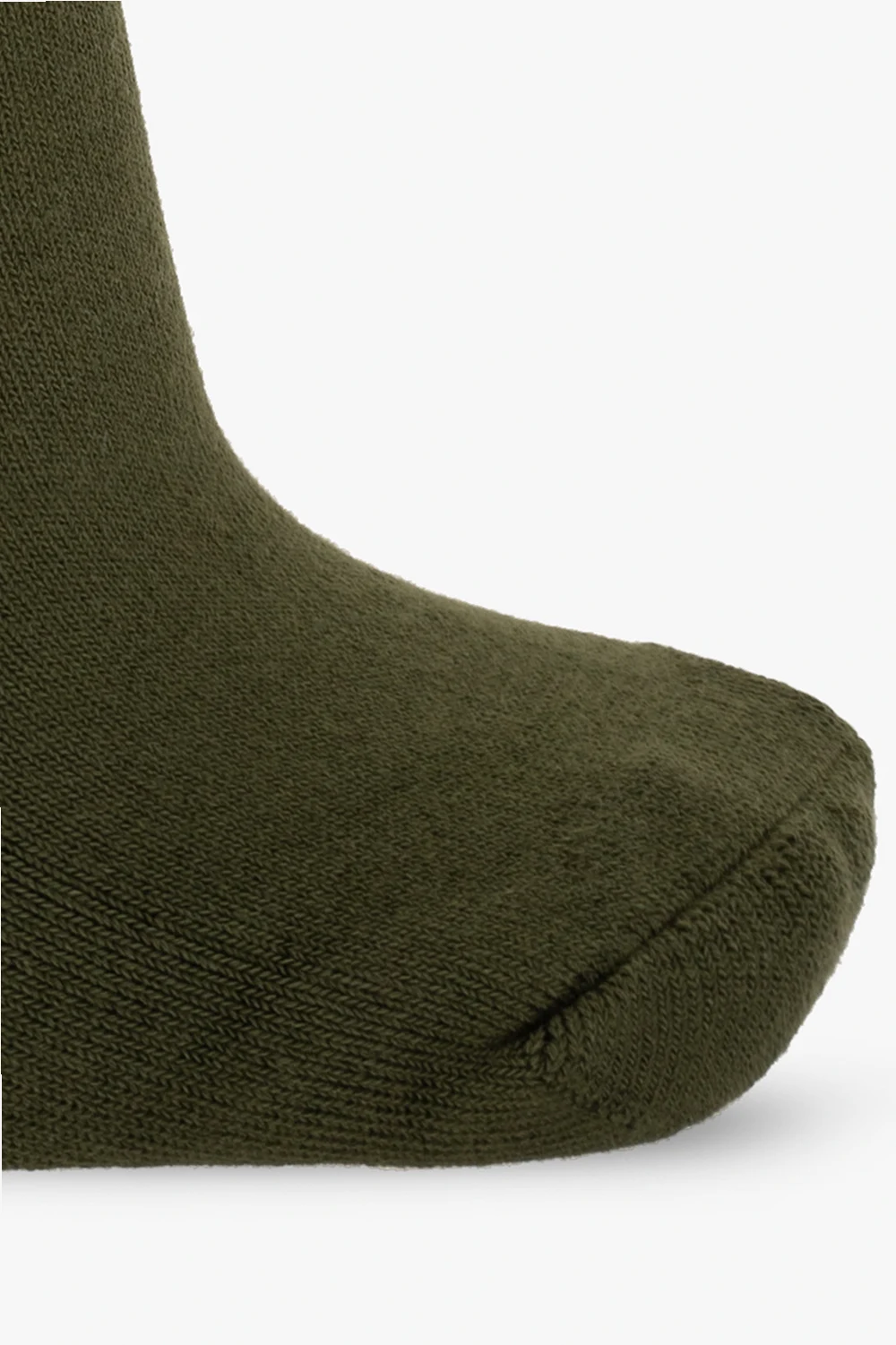 Green socks from R13. Made of cotton, this pair features ribbed cuffs and black lettering embroidery.