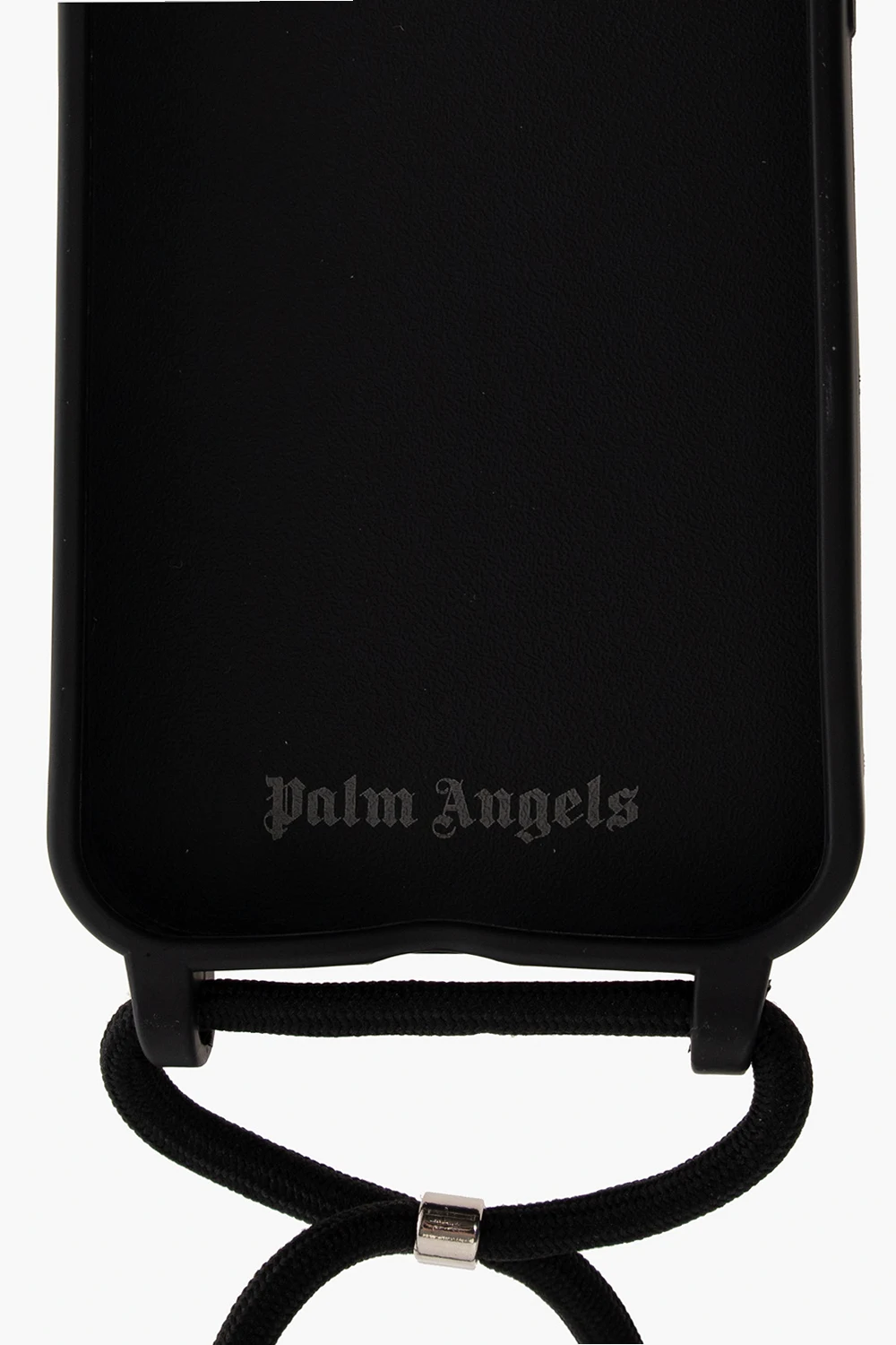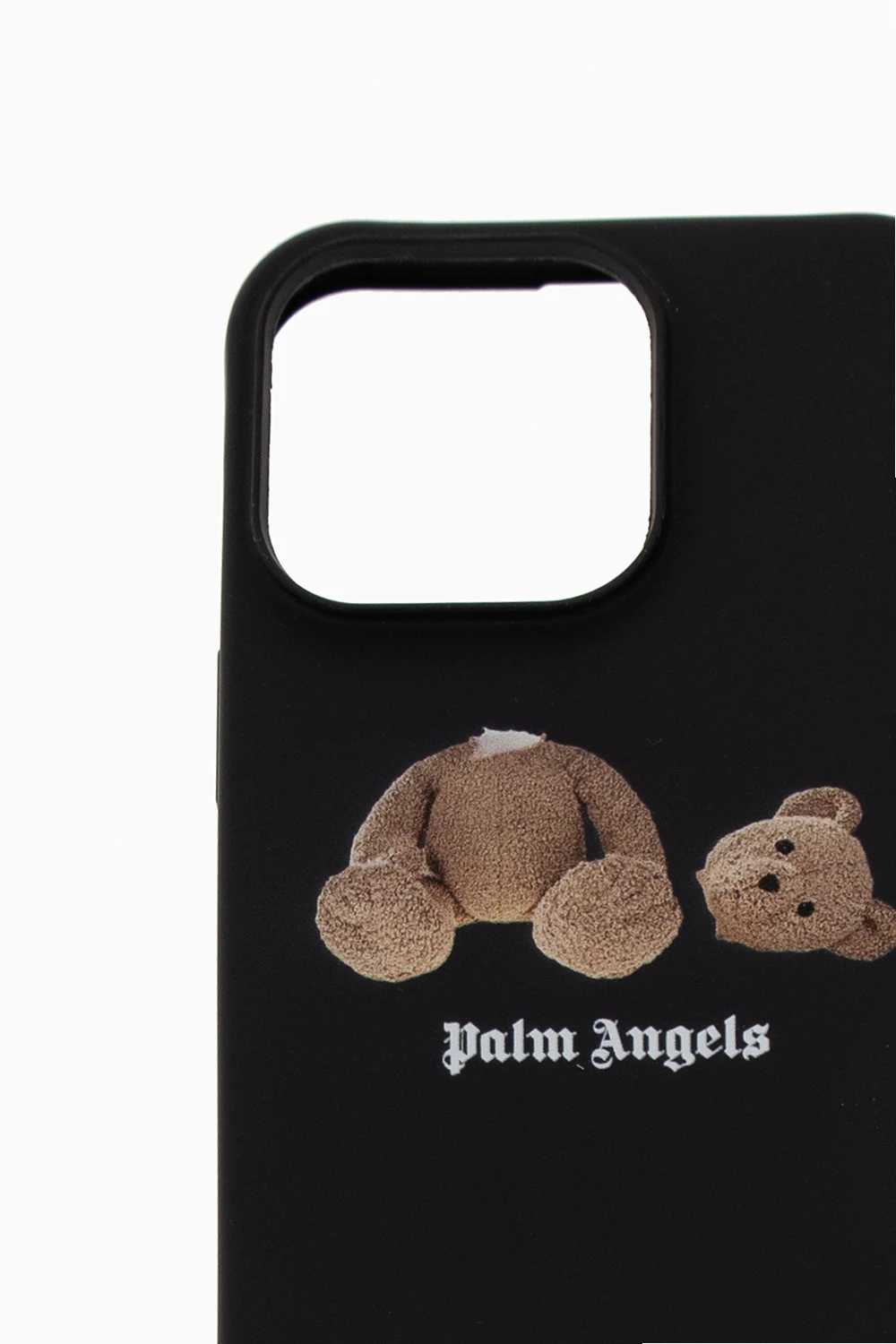 Black iPhone 13 Pro case from Palm Angels featuring a graphic print with the brand's logo and its signature teddy bear motif.