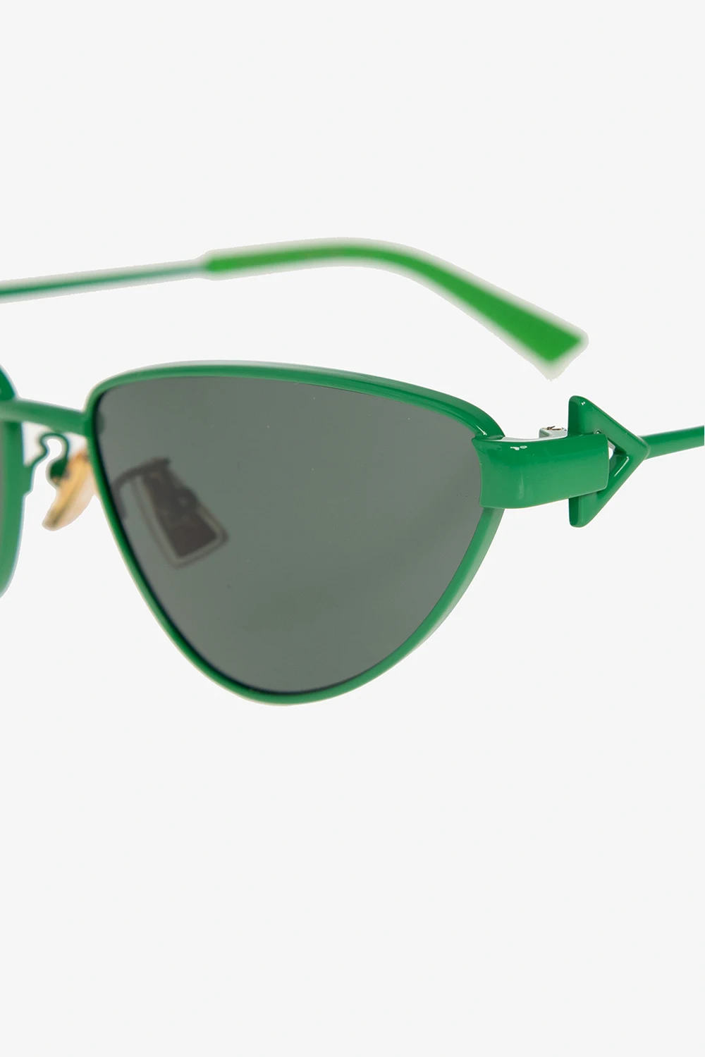 Green sunglasses from Bottega Veneta. This pair has thin metal triangle frames, single bridge with adjustable nose pads and gold-tone appliqués, temples with triangle hinges and matte tips as well as green lenses with 100% UV protection. Comes with a case.