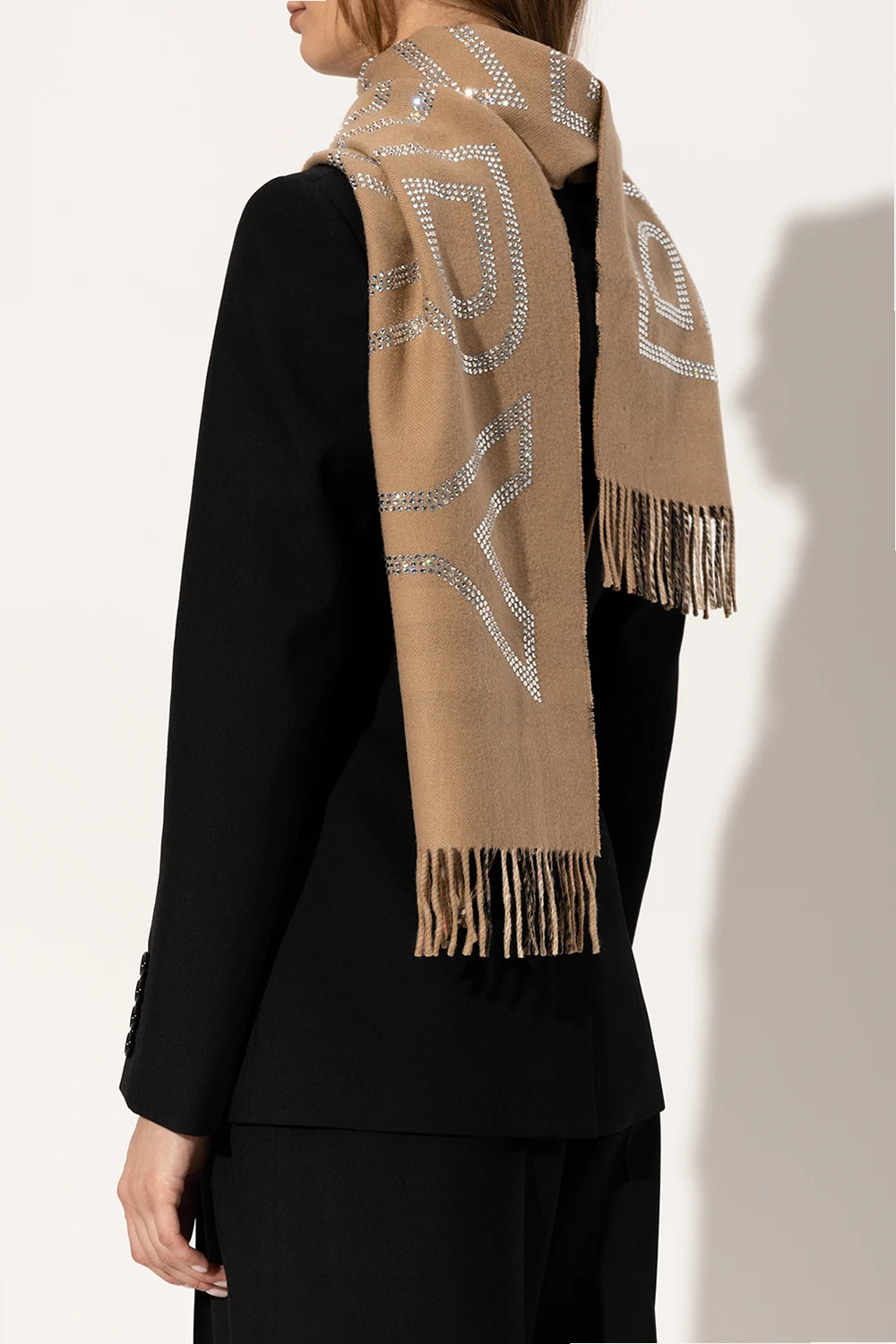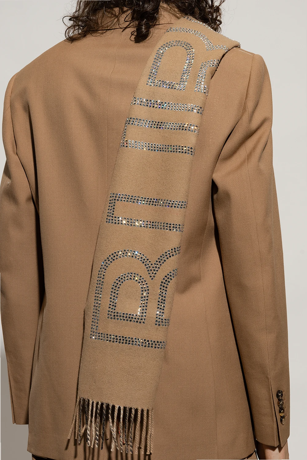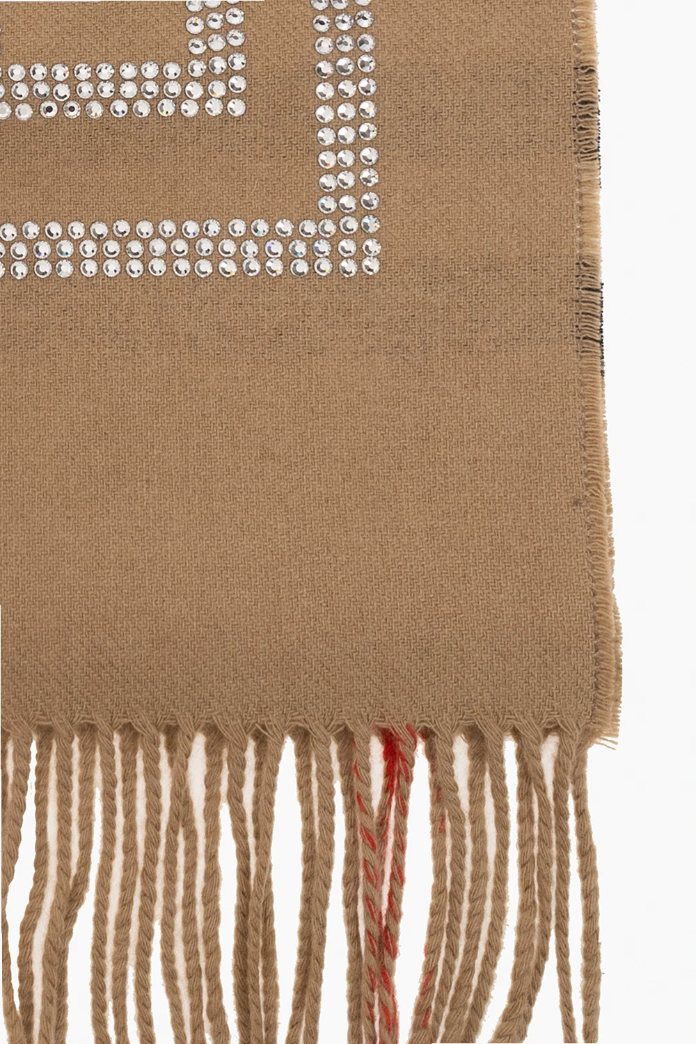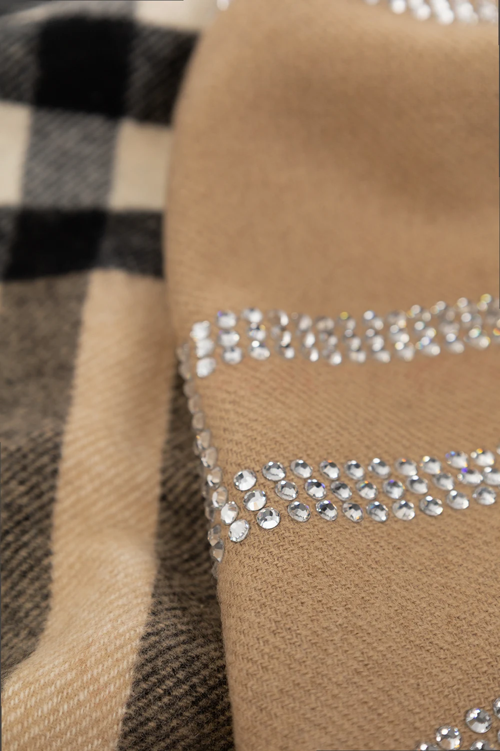 Beige reversible scarf from Burberry. Crafted from cashmere, this item has fringe edges and has one side with the brand’s signature Exaggerated Check pattern and crystal logo on the other side.