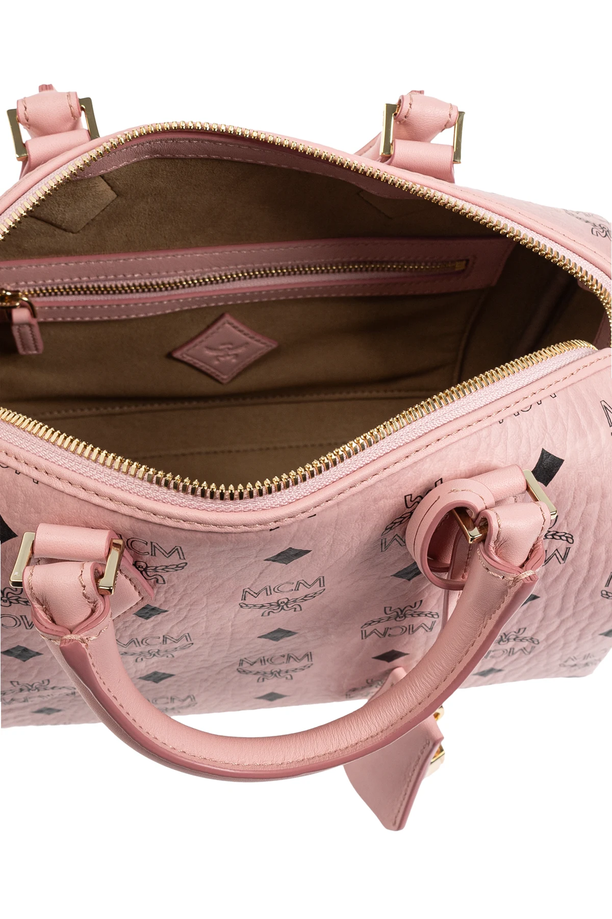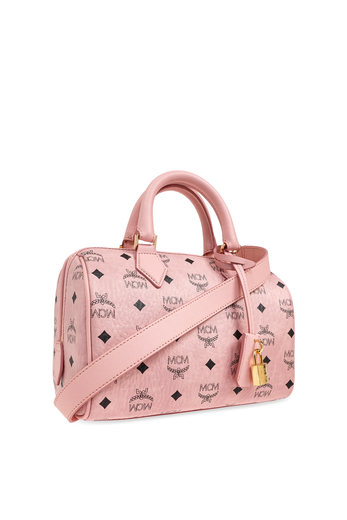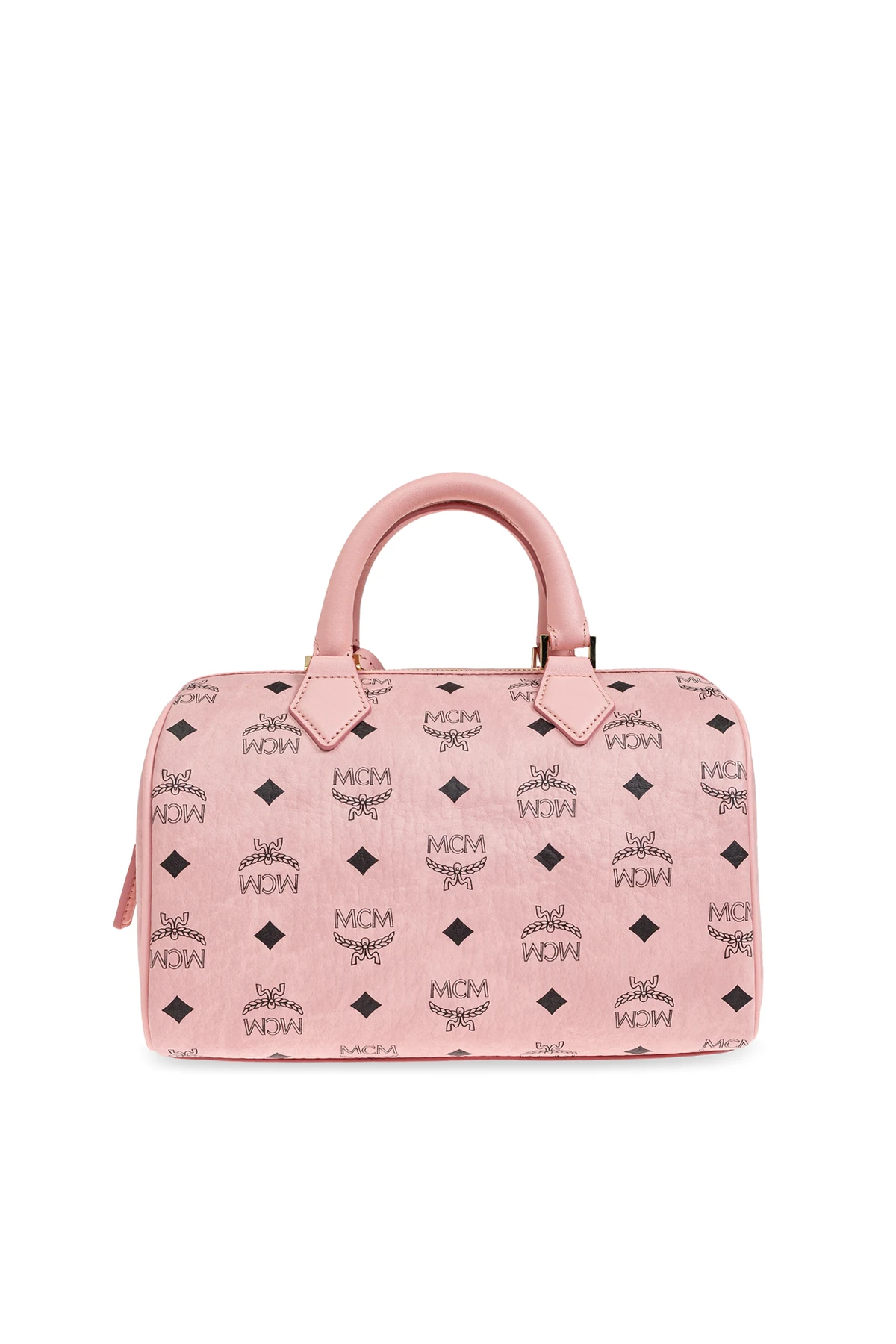 Wir präsentieren die exklusive Handtasche "Ella Boston Small" aus der renommierten Kollektion MCM . Diese einzigartige Tasche, in dominierendem Rosa gehalten, ist mit dem charakteristischen MCM-Logo-Muster verziert, das sich subtil über die gesamte Oberfläche wiederholt.