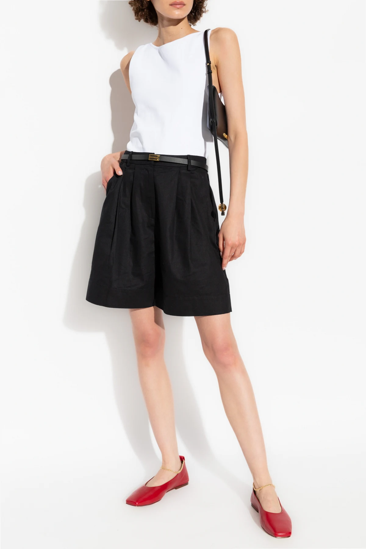 Dieser klassische, ärmellose Schnitt mit breiten Trägern und einem runden, hochgeschlossenen Ausschnitt ist die Quintessenz von Eleganz und Minimalismus. Die Länge des Tops reicht bis zur Hüfte, betont die weiblichen Formen und bietet vielseitige Styling-Möglichkeiten.