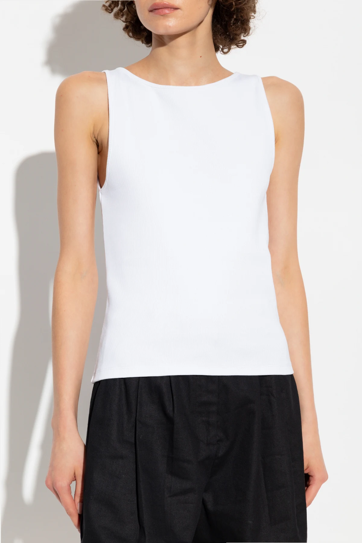 Die gerippte Struktur des Materials verleiht eine subtile Textur, und das Fehlen äußerer Verzierungen oder Logos hält das Top im Geiste der Einfachheit und Klasse. Im Inneren des Ausschnitts befindet sich ein dezentes Etikett mit dem Markennamen, das auf seine besondere Herkunft hinweist.