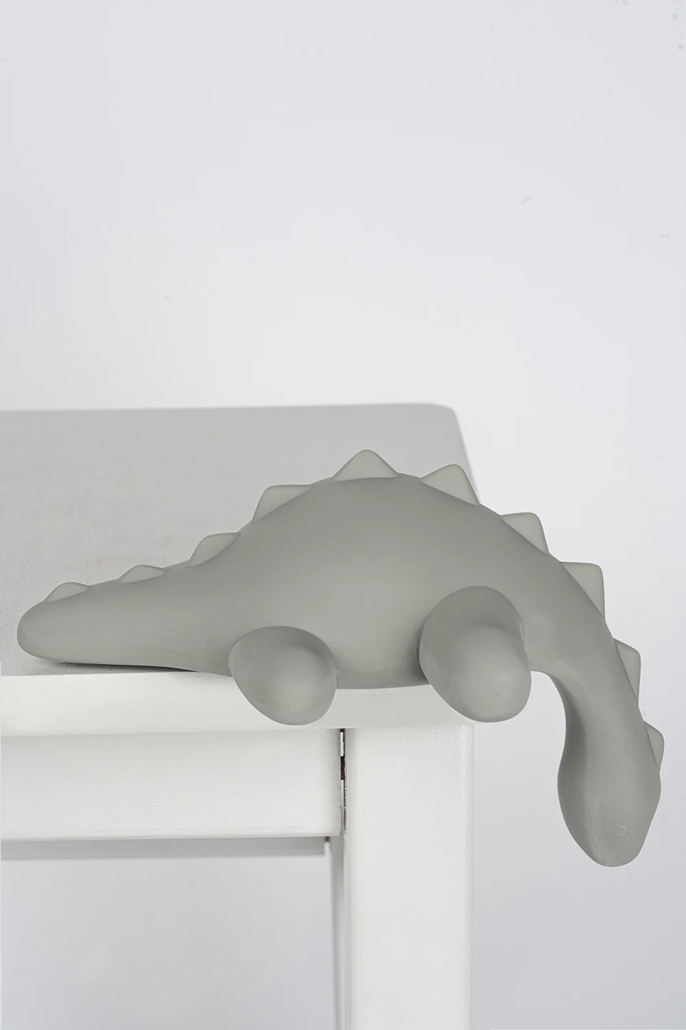 Greyish green dinosaur LED lamp from Konges Slojd. Made of silicone, this item comes with a USB recharge cable.