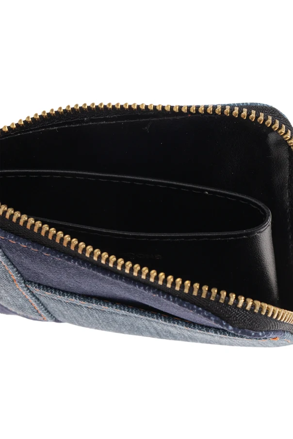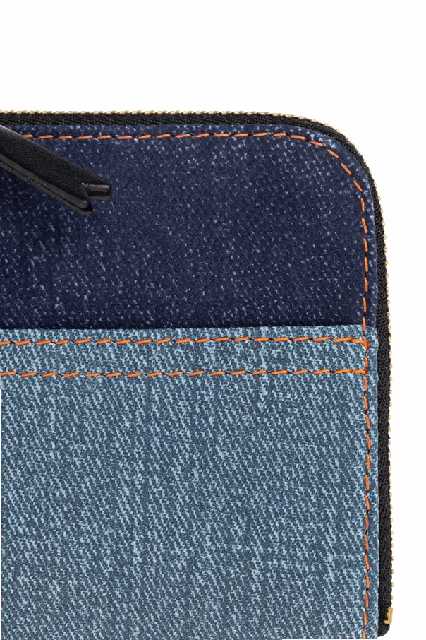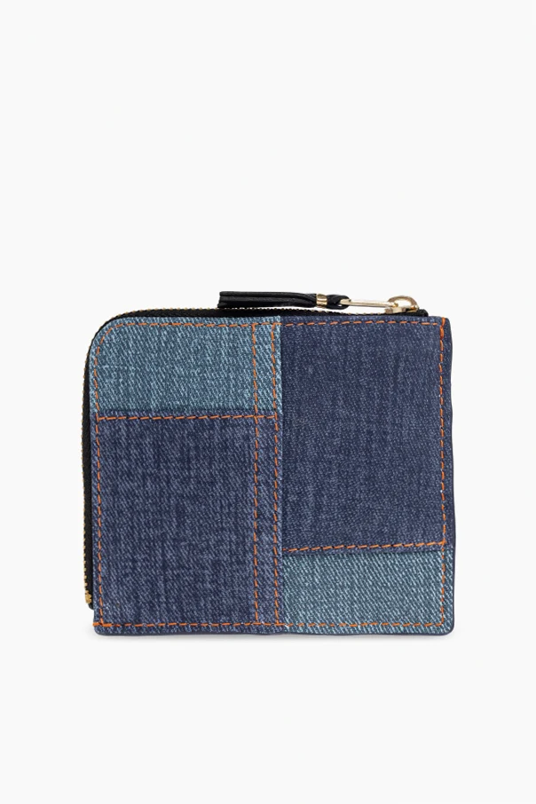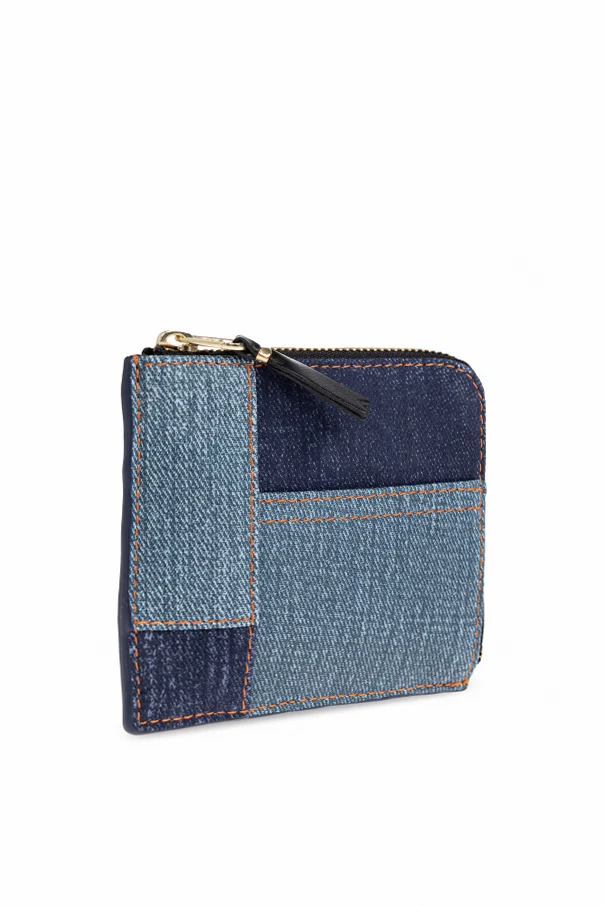Comme des Garçons Leder-Kartenetui ist ein raffiniertes Accessoire, das nicht nur durch seine Ästhetik, sondern auch durch außergewöhnliche Handwerkskunst begeistert. Dieses Unisex-Accessoire in quadratischer Form mit dezent abgerundeten Ecken zieht mit seinem geometrischen Patchwork-Muster aus blauen, jeansähnlichen Stoffen und kontrastierenden, orangefarbenen Nähten alle Blicke auf sich.