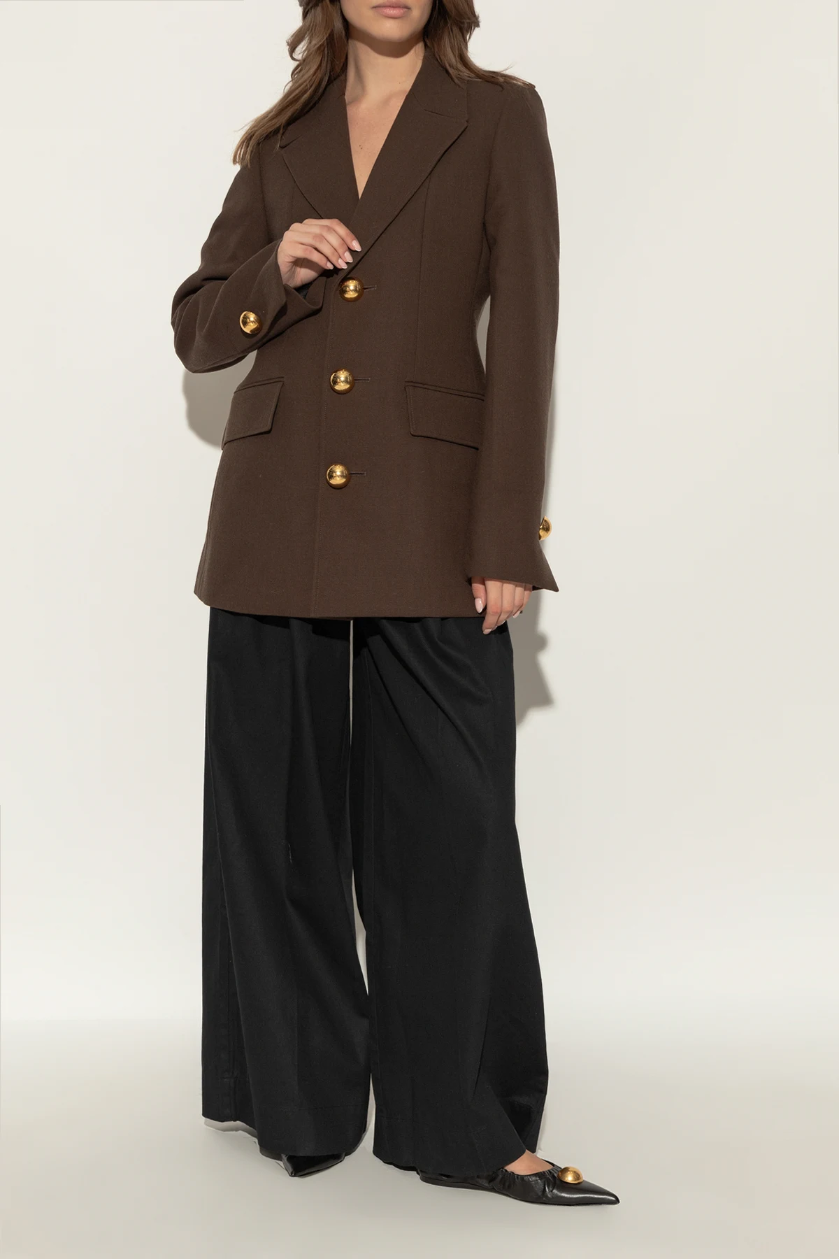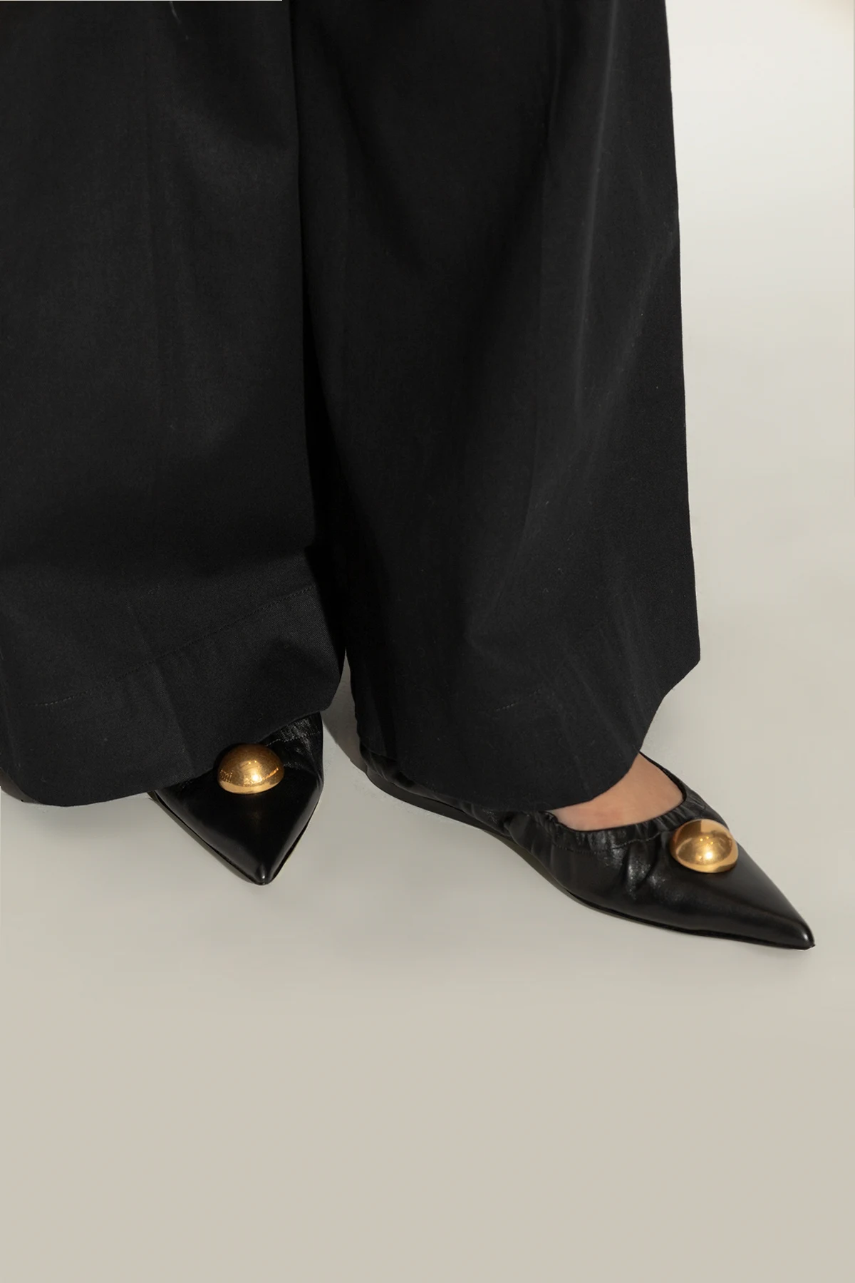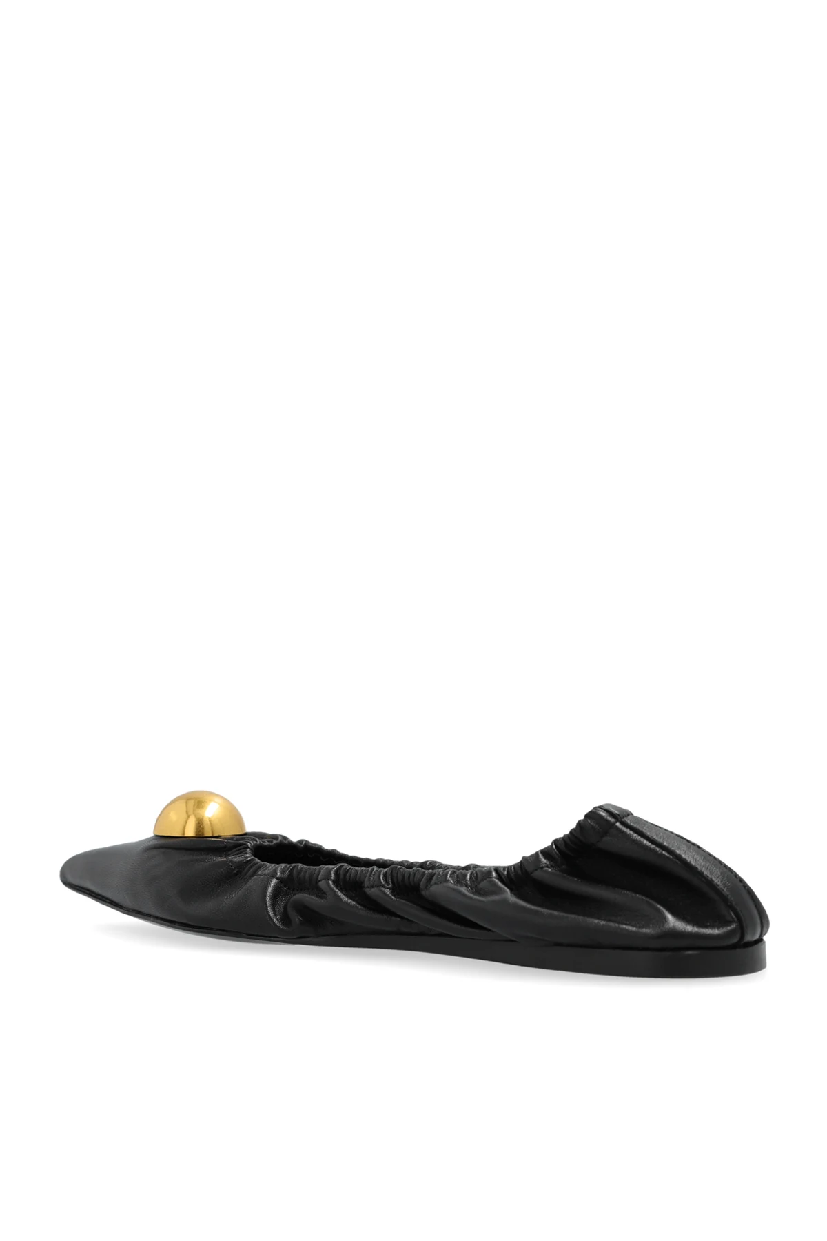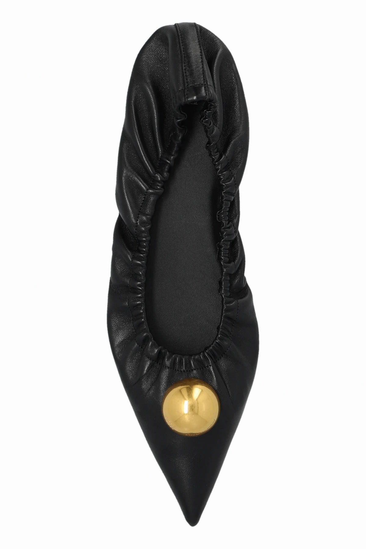 Hergestellt aus hochwertigem schwarzem Leder , zeichnen sich die Ballerinas durch abgerundete Seiten und eine deutlich spitze Zehenpartie aus. Die einheitliche Farbe und das Fehlen zusätzlicher Muster betonen ihren subtilen Charme. An der Vorderseite befindet sich eine große, goldene Kugel , die als Zierde dient, das Auge anzieht und dem Schuh einen einzigartigen Charakter verleiht. Elastische Raffung um die Kanten garantiert eine perfekte Passform und sorgt für maximalen Tragekomfort.