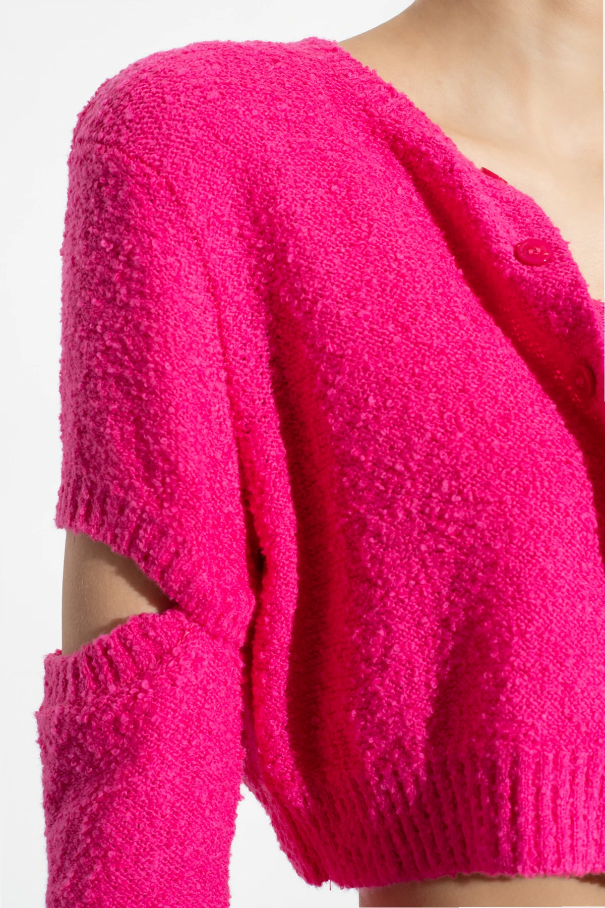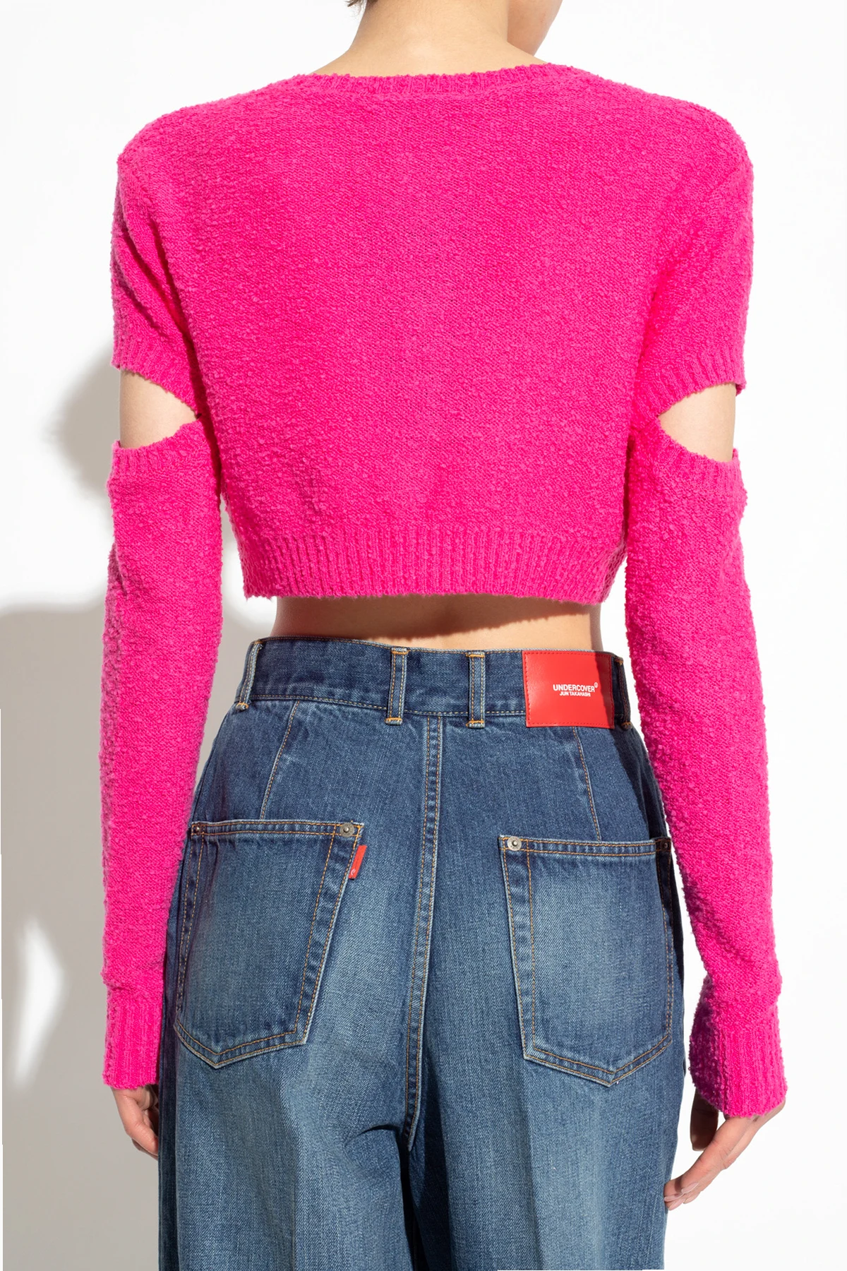 Pink cropped cardigan from Undercover. Made of cotton, this design features button fastenings, long sleeves with cut-outs, a round neck and ribbed edges.