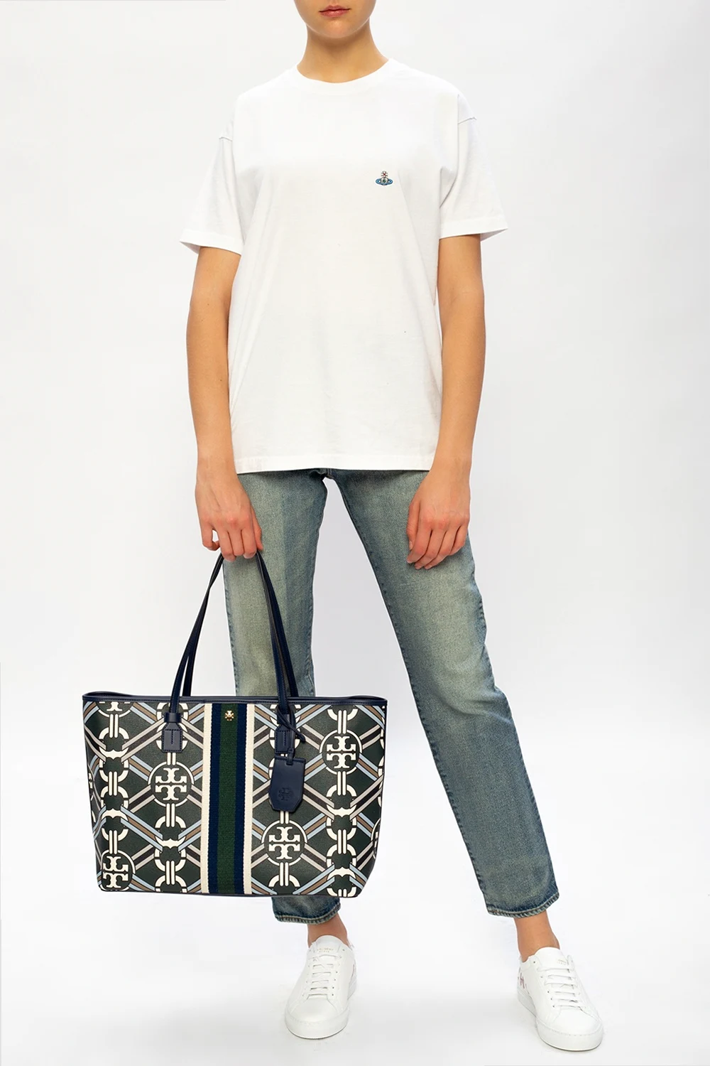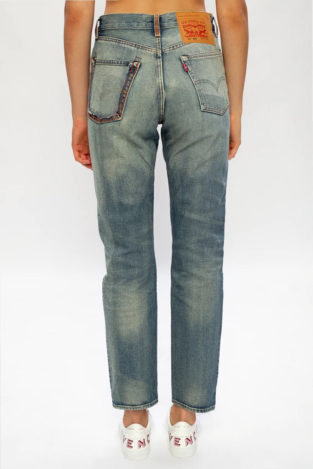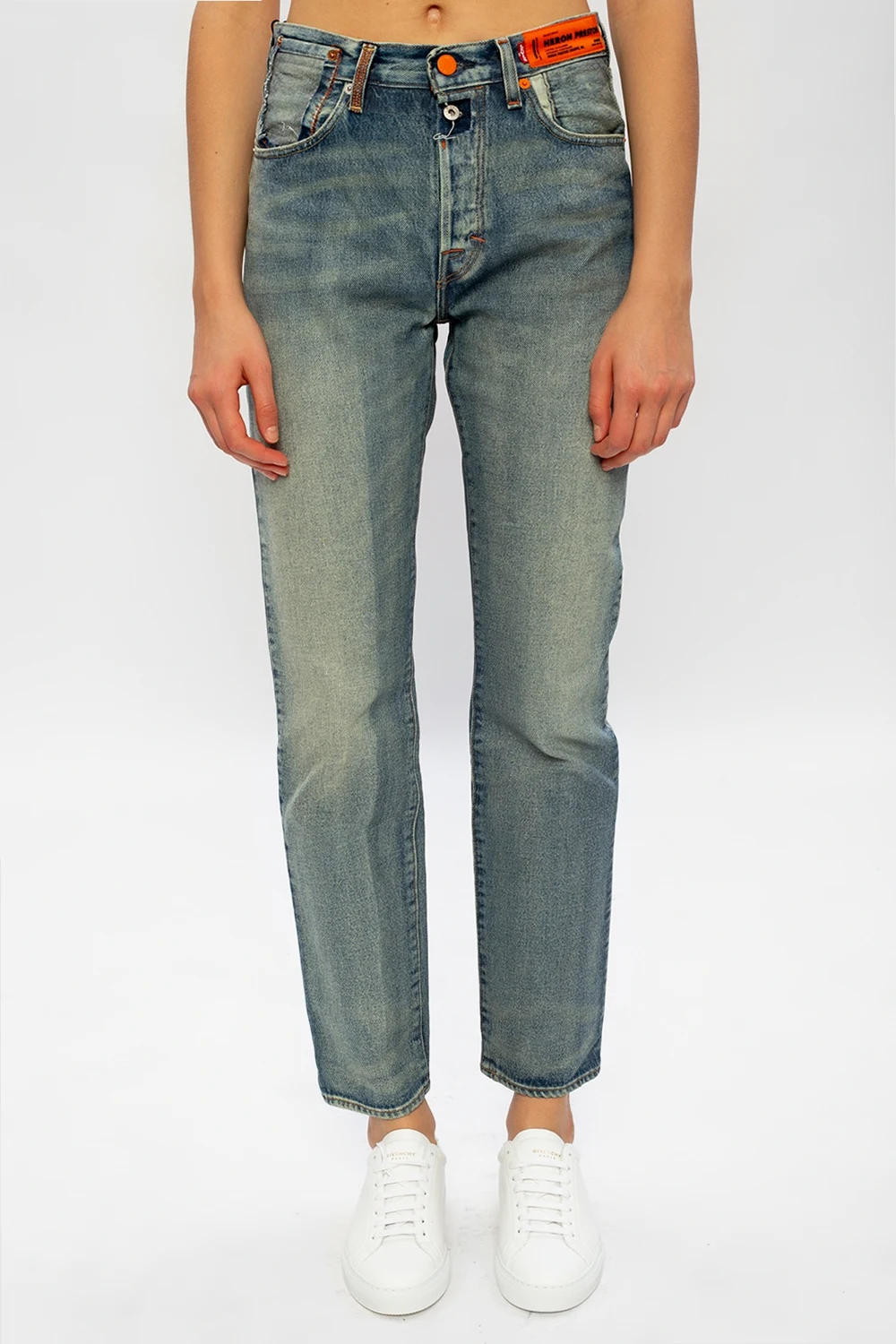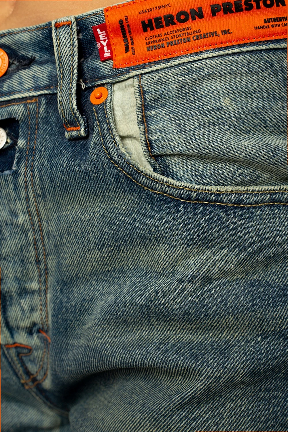 Light blue ‘501’ distressed jeans Heron Preston x Levi’s. Fastened with concealed buttons, this straight leg design features three slip pockets, orange stitching details and logo patches.
