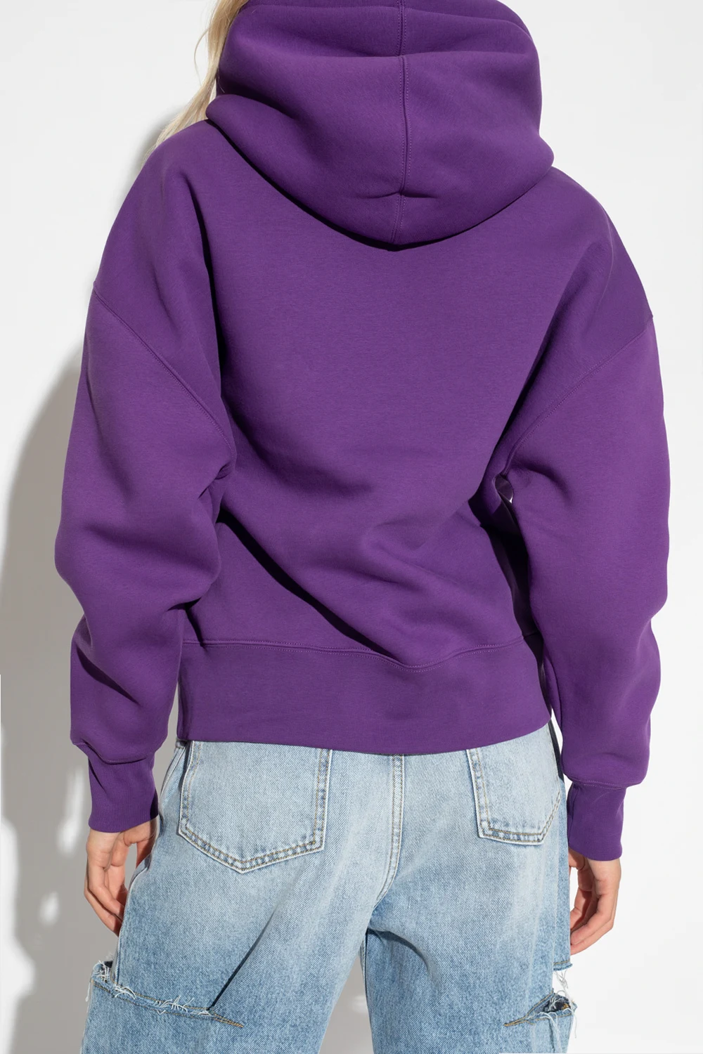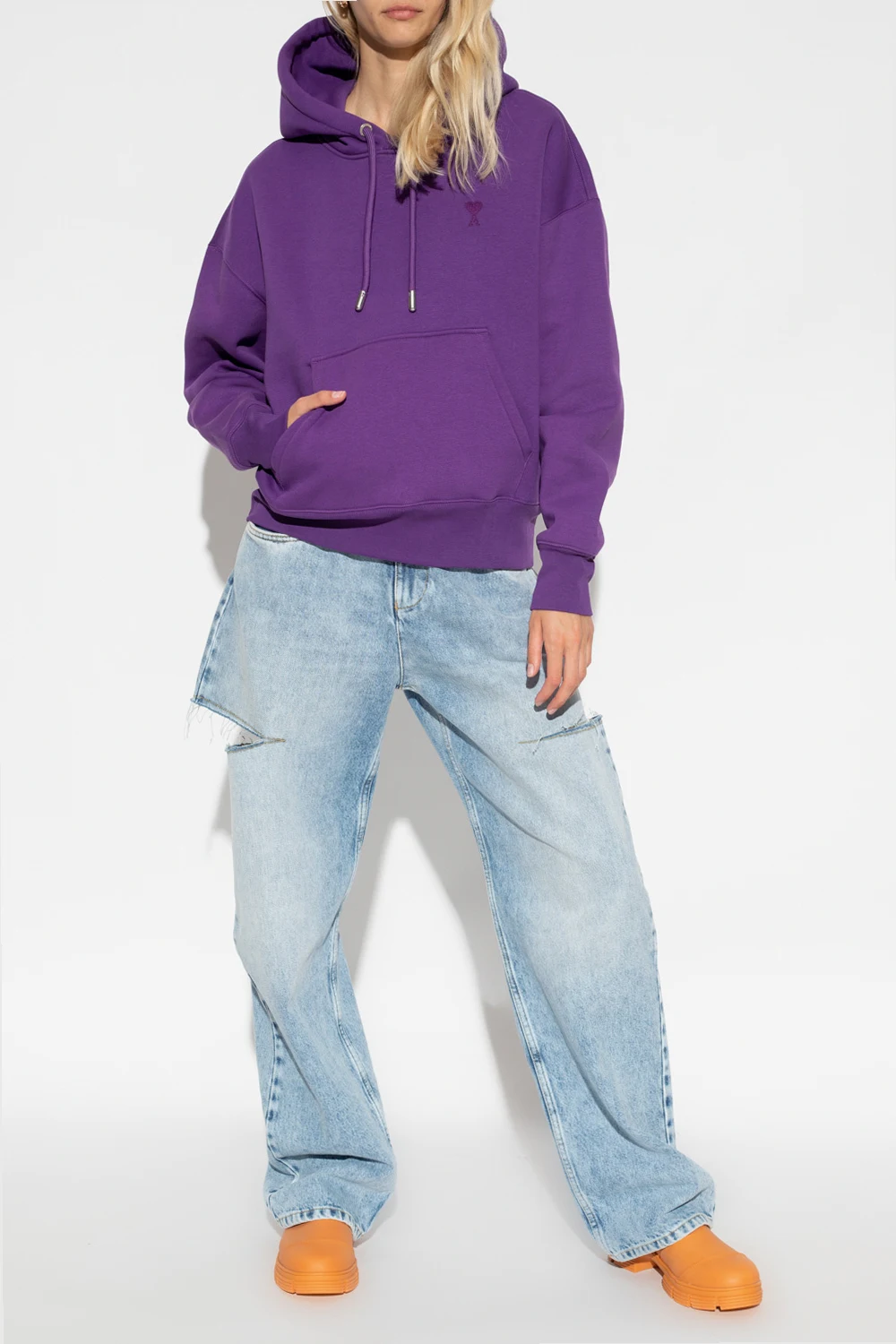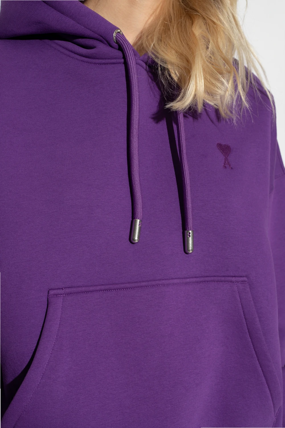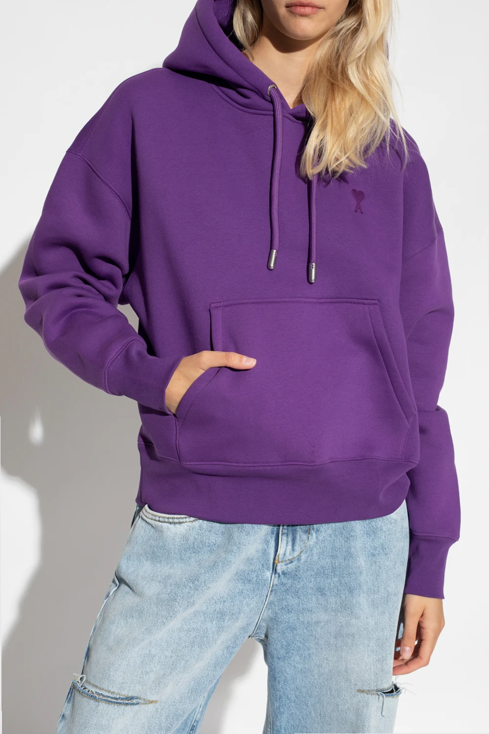 Purple loose-fitting hoodie from Ami Alexandre Mattiussi. Crafted from a blend of organic cotton and recycled fabric, this garment features a drawstring hood, ‘Ami De Coeur’ logo embroidery on the front and back, slip pocket and ribbed trims at the hem and cuffs.