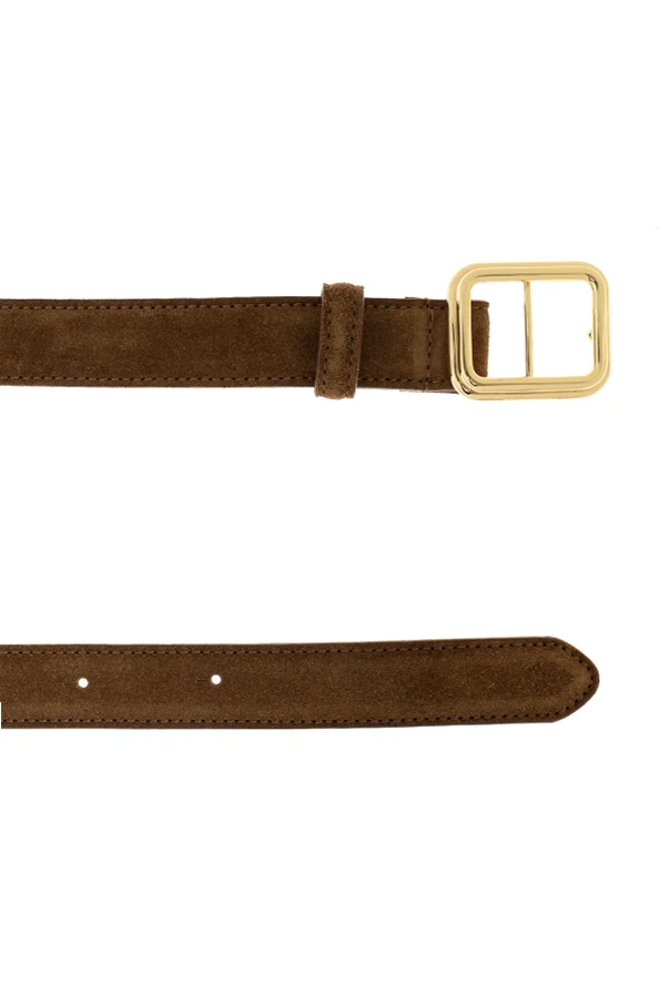 Die markante, rechteckige Schnalle in edlem Goldton mit abgerundeten Ecken ist ein äußerst stilvolles Detail, das den Prestige und die exquisite Ästhetik des Gürtels betont. Das Ende des Gürtels ist durch präzise, robuste Nähte direkt an der Schnalle gekennzeichnet, was Langlebigkeit garantiert und für perfekte Handwerkskunst steht.