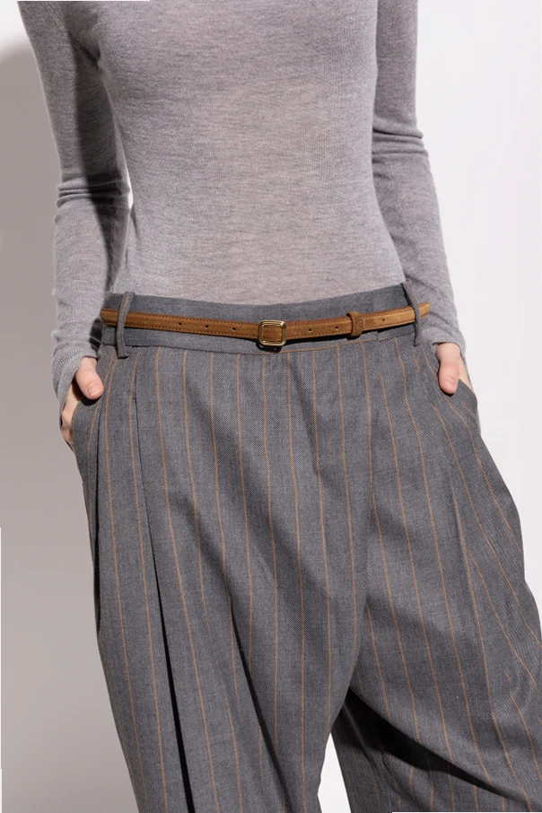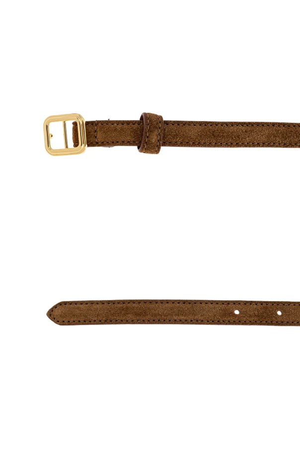 Der Gürtel in einem warmen, klassischen Braunton ist mit einer schlicht gestalteten, minimalistischen Schnalle in Goldfarbe versehen. Sorgfältig verarbeitete Nähte und eine zusätzliche Schlaufe aus dem gleichen Material betonen den einzigartigen, stilvollen Charakter des Produkts.