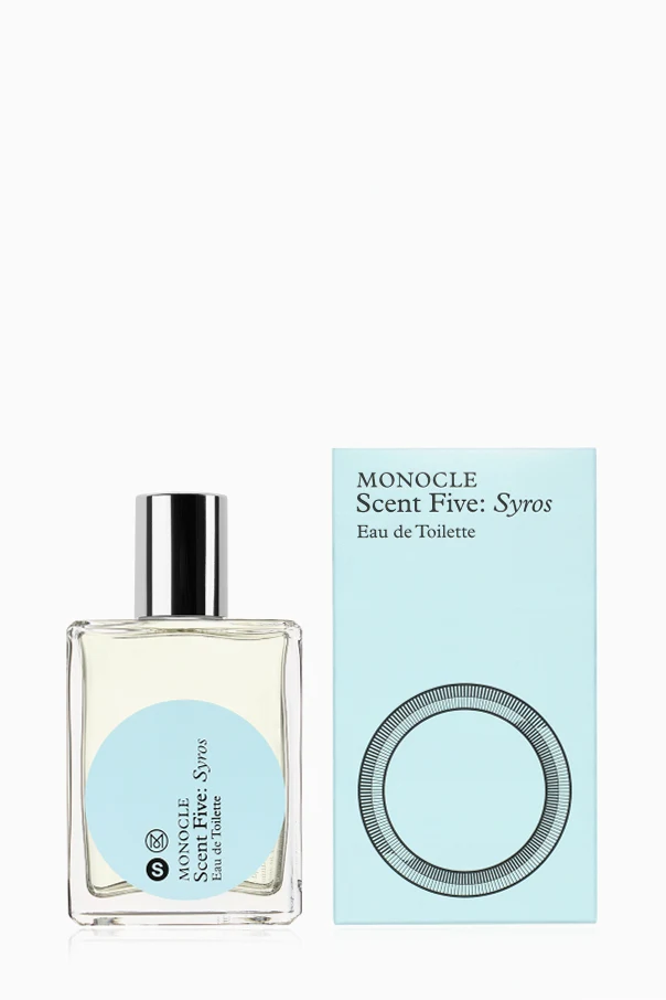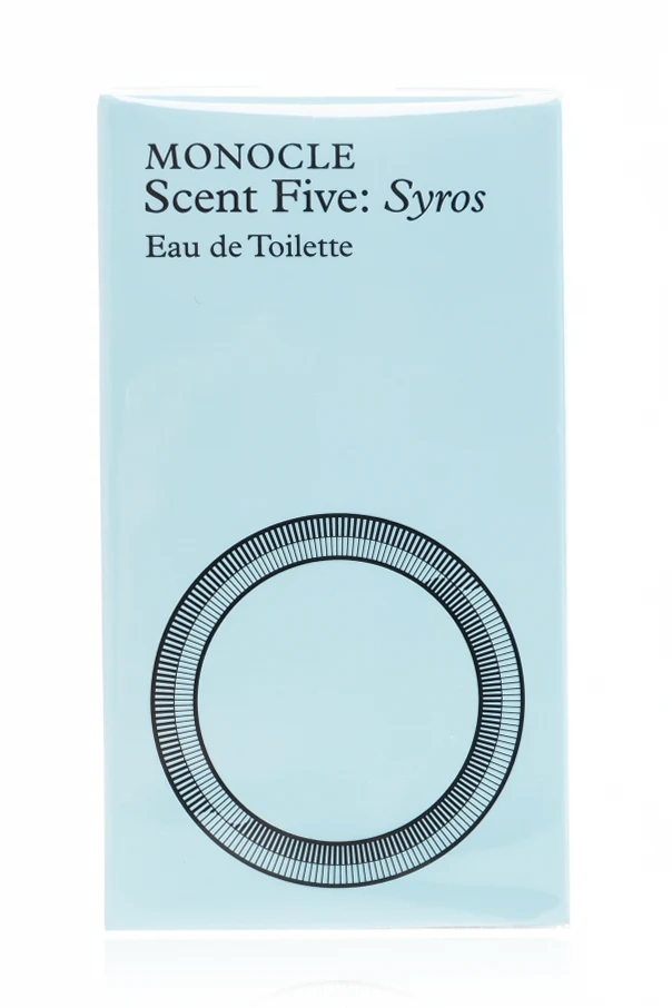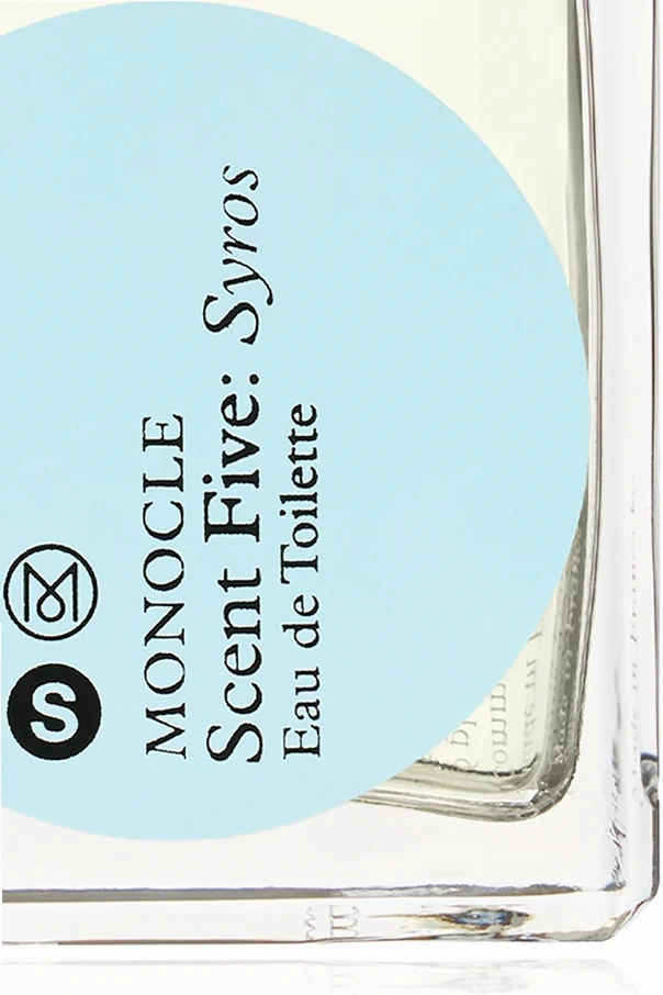 Das Eau de Toilette Monocle Scent Five: Syros , signiert vom Modehaus Comme des Garçons , steht für raffinierte Eleganz und anspruchsvollen Minimalismus. Die Komposition ist in einer sorgfältig designten Flasche eingeschlossen, deren rechteckige, transparente Form und markante Kanten ihren exklusiven Charakter unterstreichen. Das hochwertige Glasgefäß ist mit einem metallischen, glänzenden Verschluss versehen. Besonders ins Auge fällt das auffällige Etikett in Hellblau mit dem lesbaren Markenlogo und markanten grafischen Signaturen.