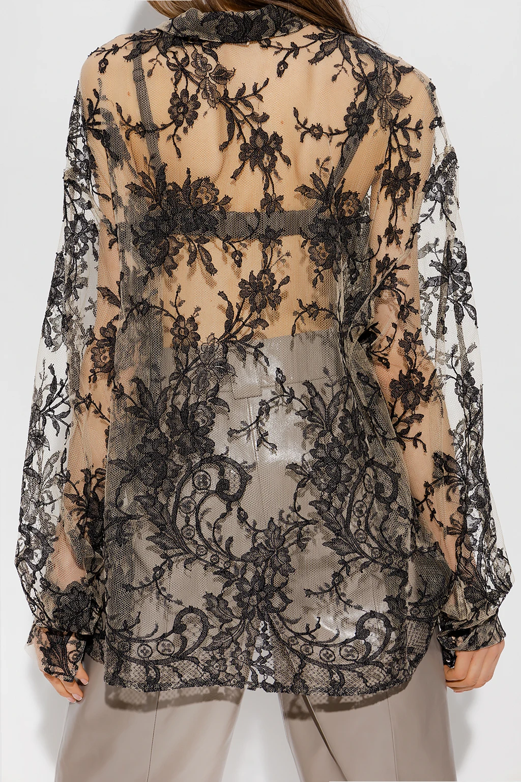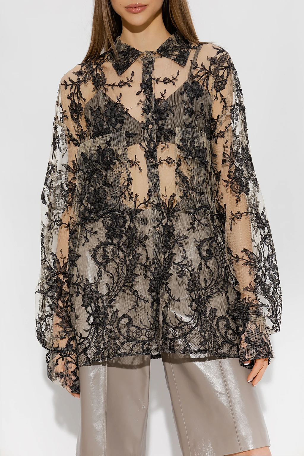 Beige and black ‘Calais’ shirt from The Mannei. Rendered in lace with an oversize fit, this style features button fastenings, two frontal pockets and long sleeves with button cuffs.