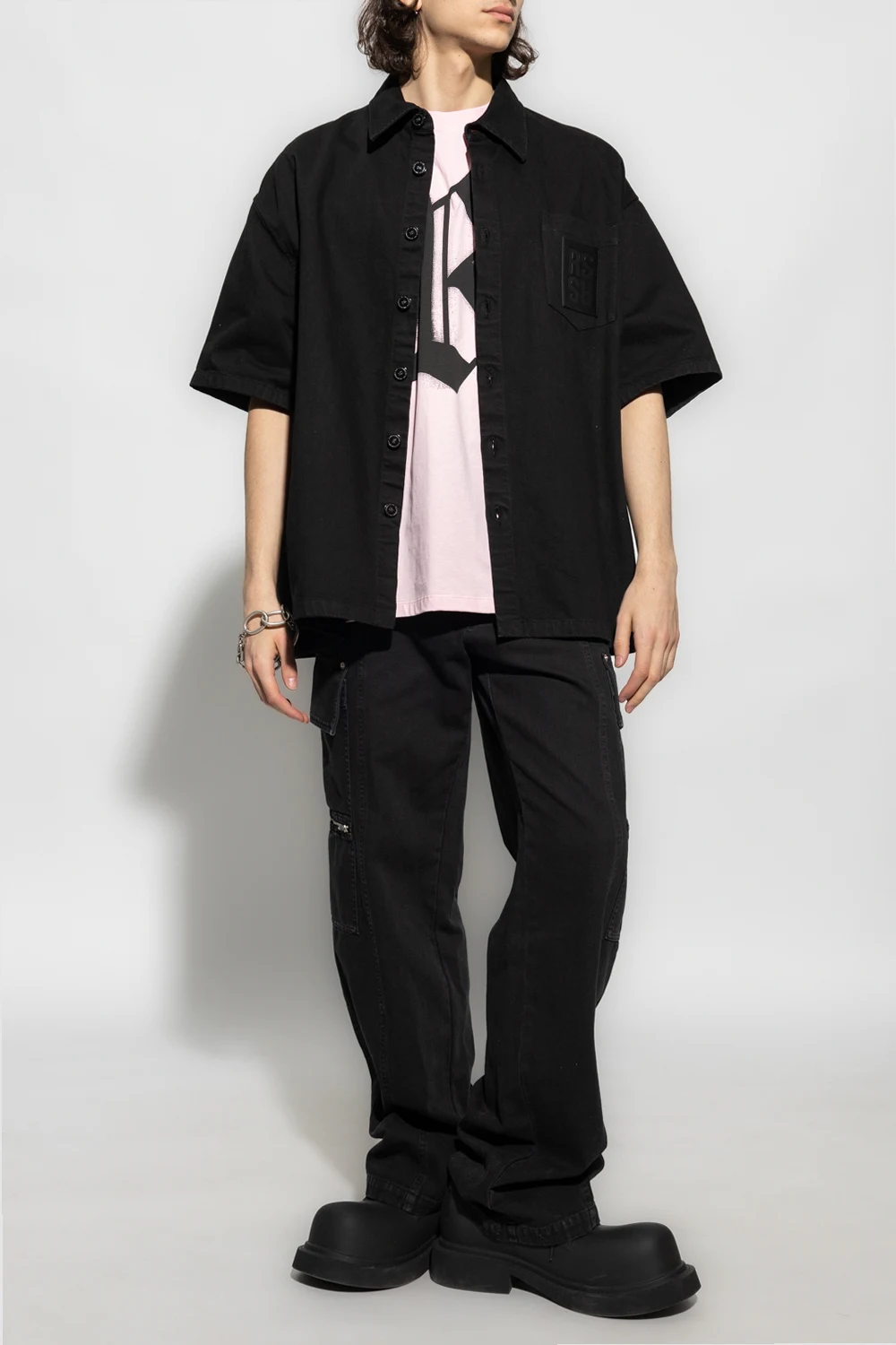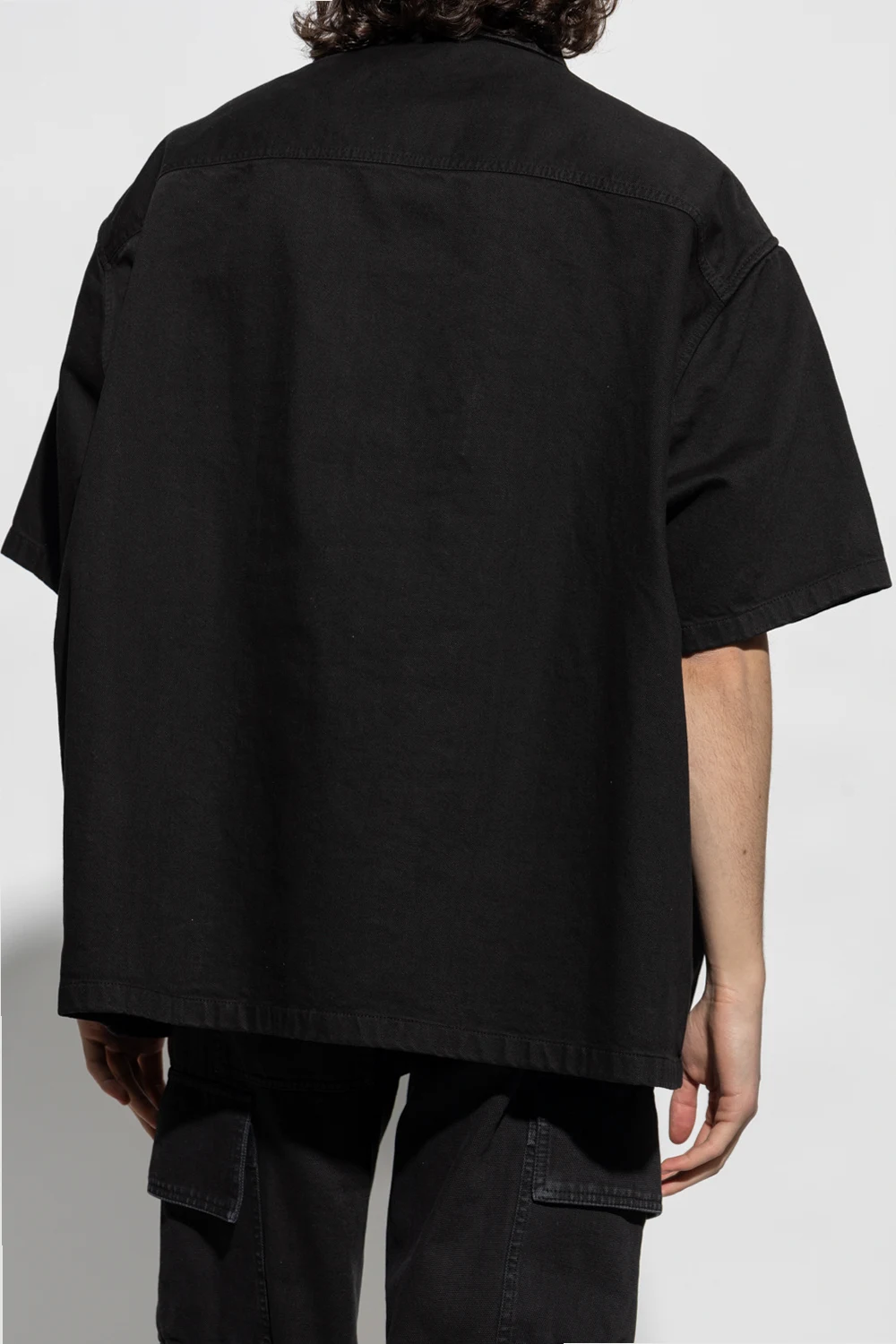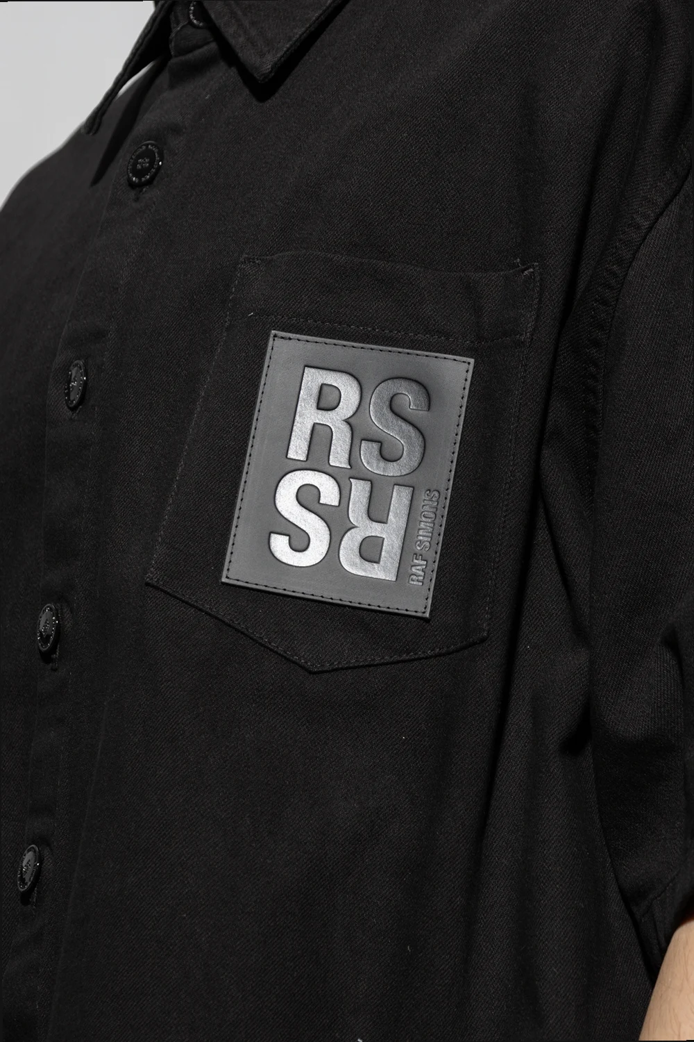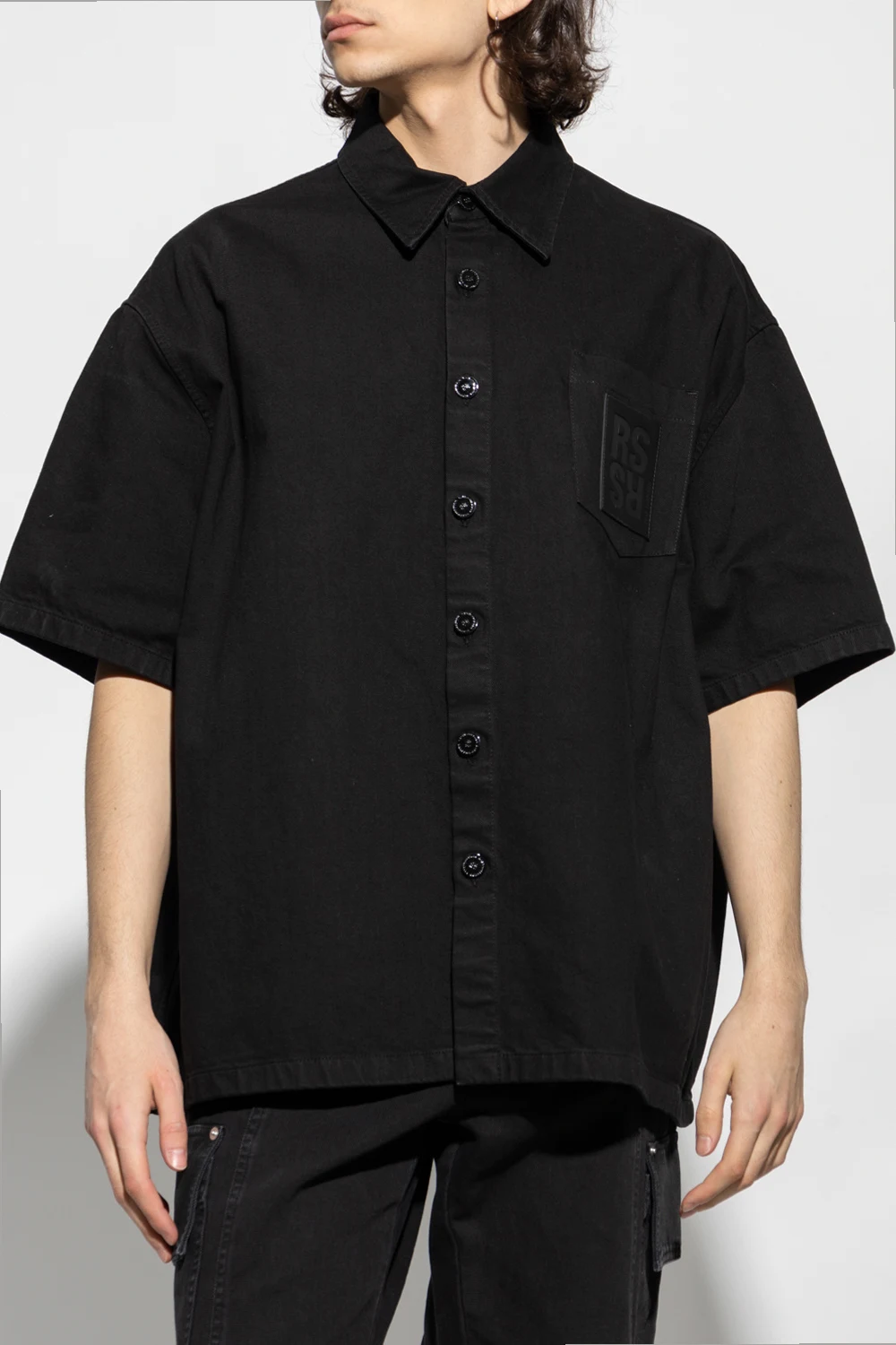 Black denim shirt from Raf Simons. Crafted from cotton with a relaxed fit, this style features button fastenings, short sleeves and a slip chest pocket accentuated with a logo patch.