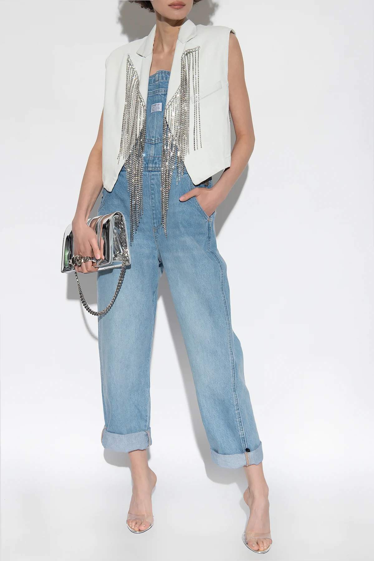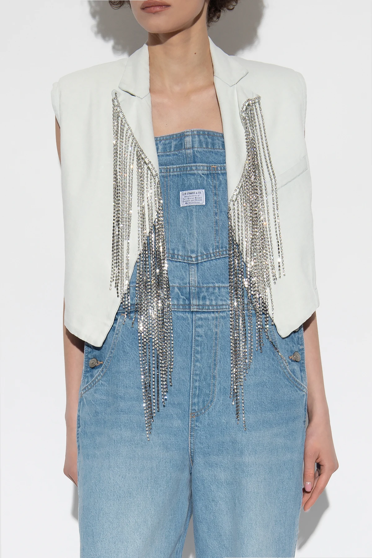 White denim vest from Forte Forte. This design features a front pocket, silver-tone metal fringes embellished with crystals and blue logo patch at the back.