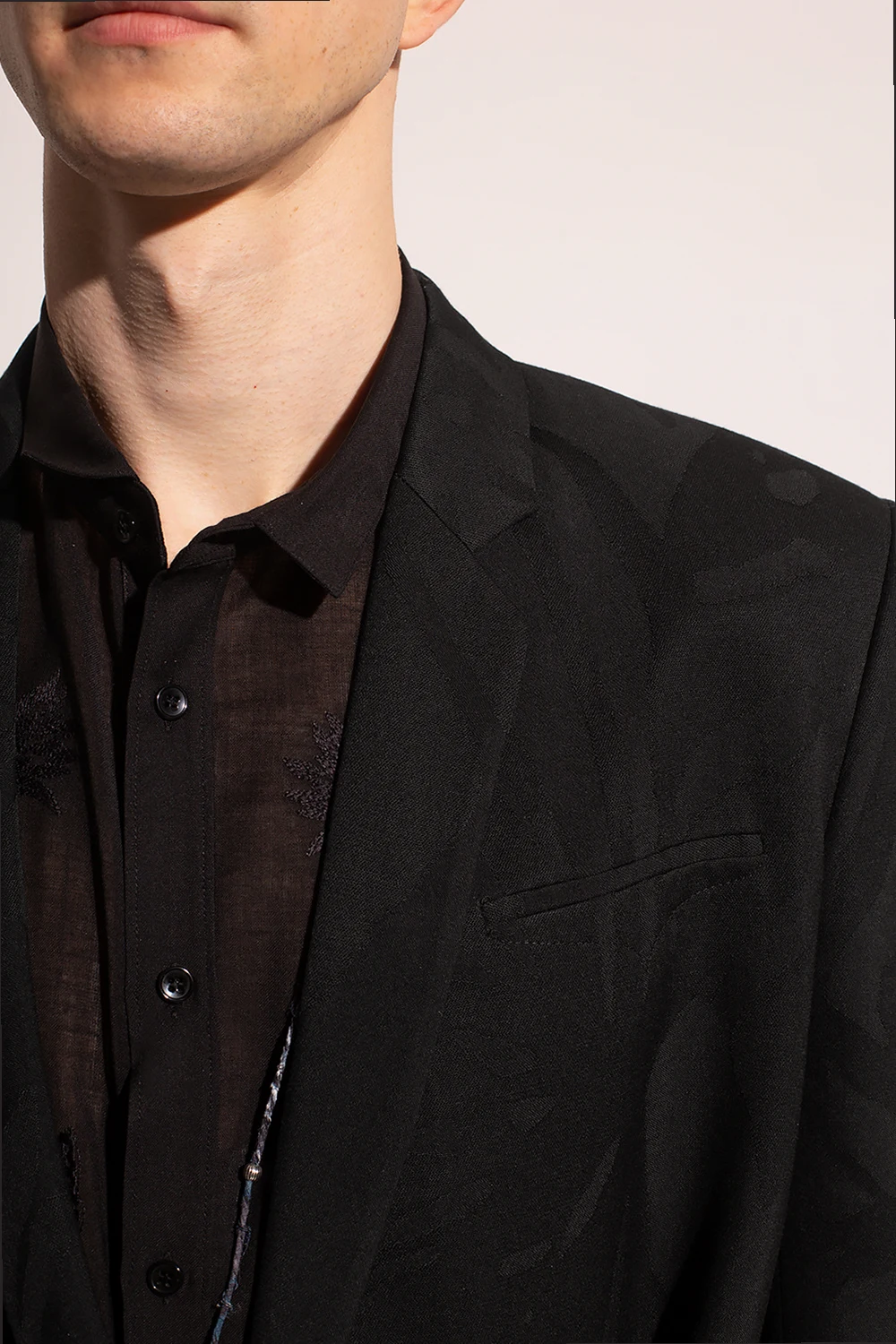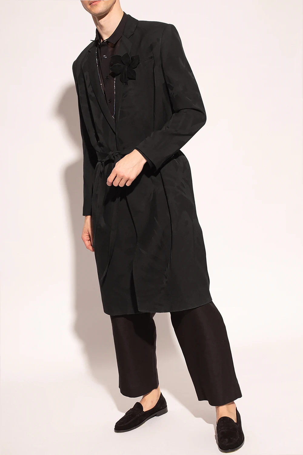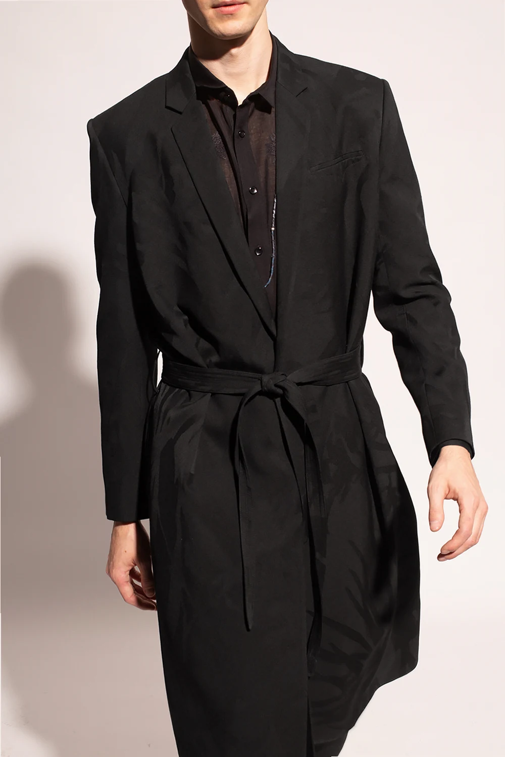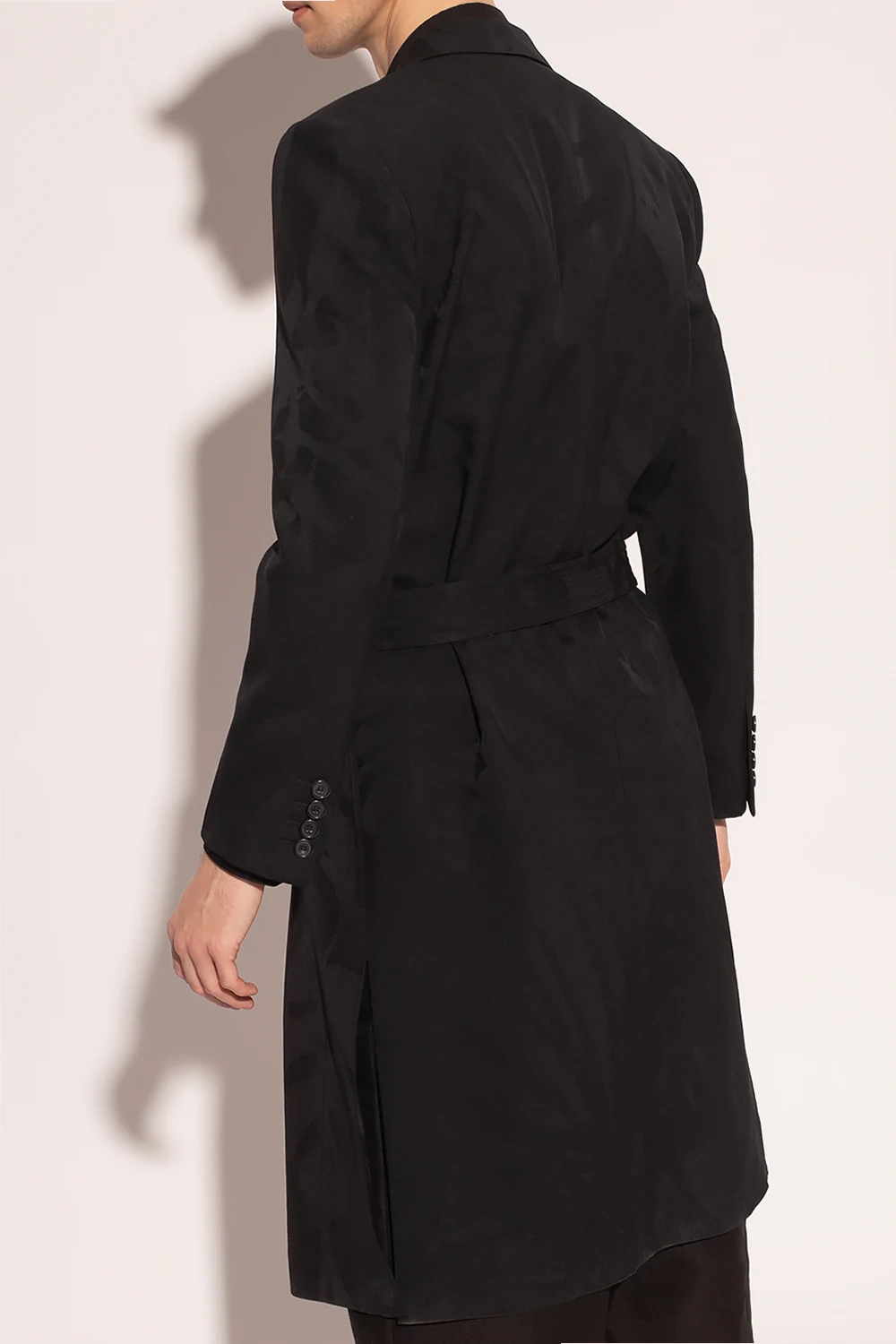 Black coat from Saint Laurent. Fastened with a button and belt, this wool-crafted garment features an embroidered pattern, two side pockets, one front pocket, long sleeves, double rear vent and silk lining.