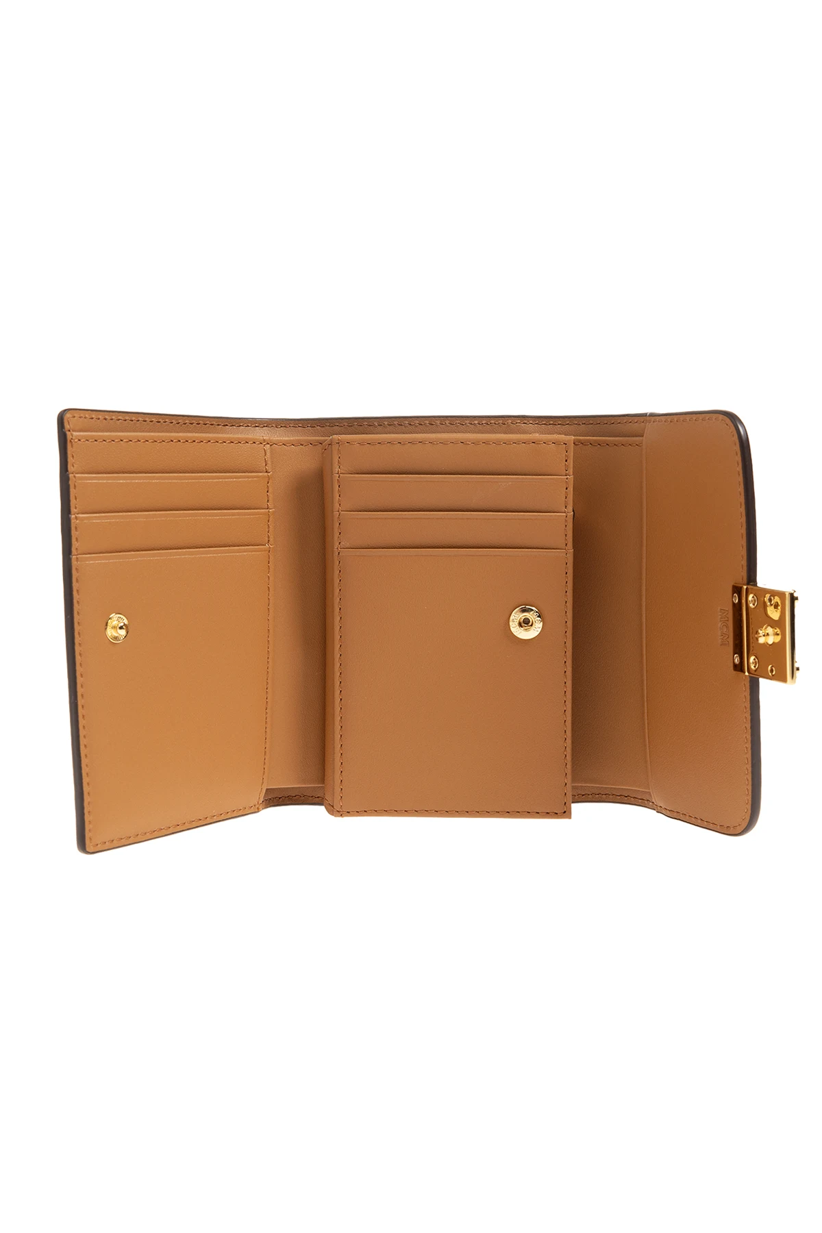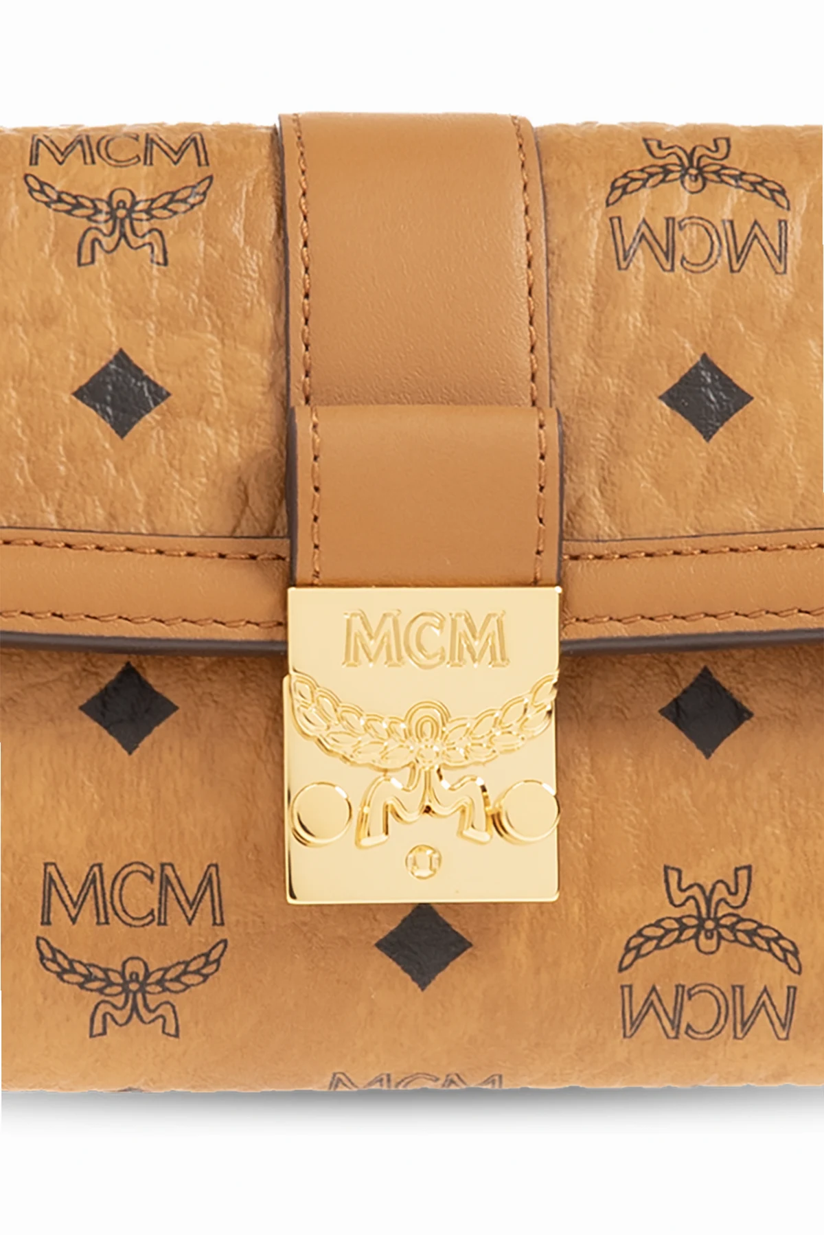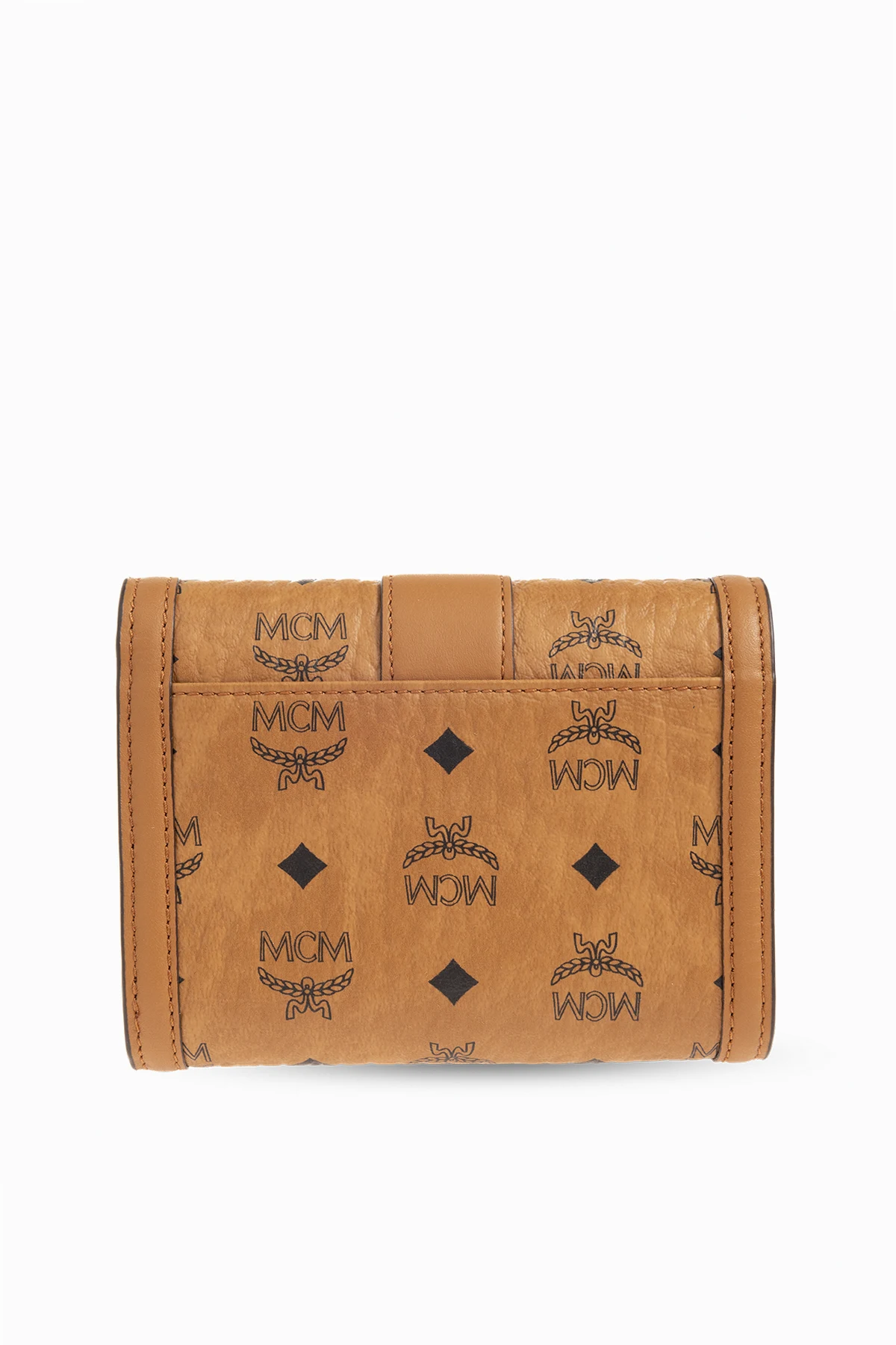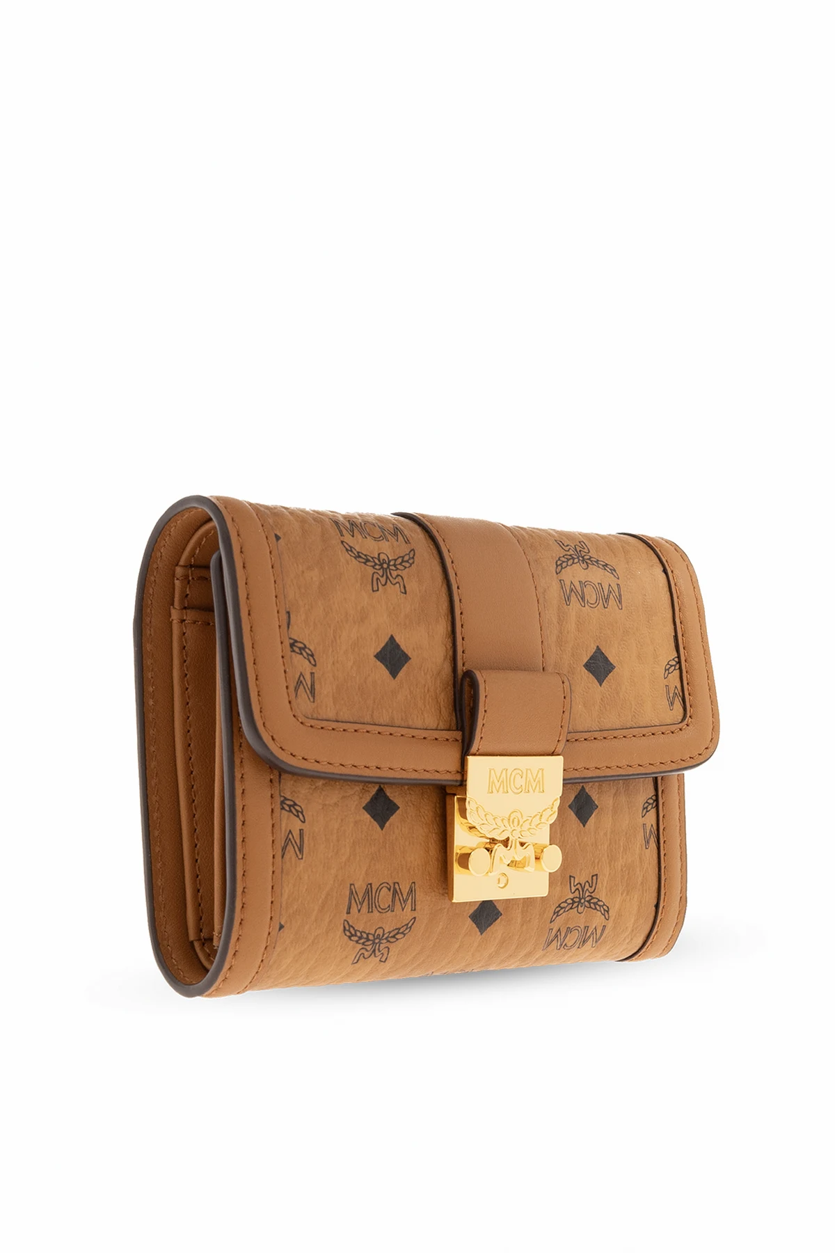 Brown wallet from MCM. Made of coated canvas with the brand’s signature monogram pattern in black and leather trims, this model fastens with a gold-tone Laurel Lock closure and has one bill compartment, zipped coin pocket, one slip pocket and six card slots inside.