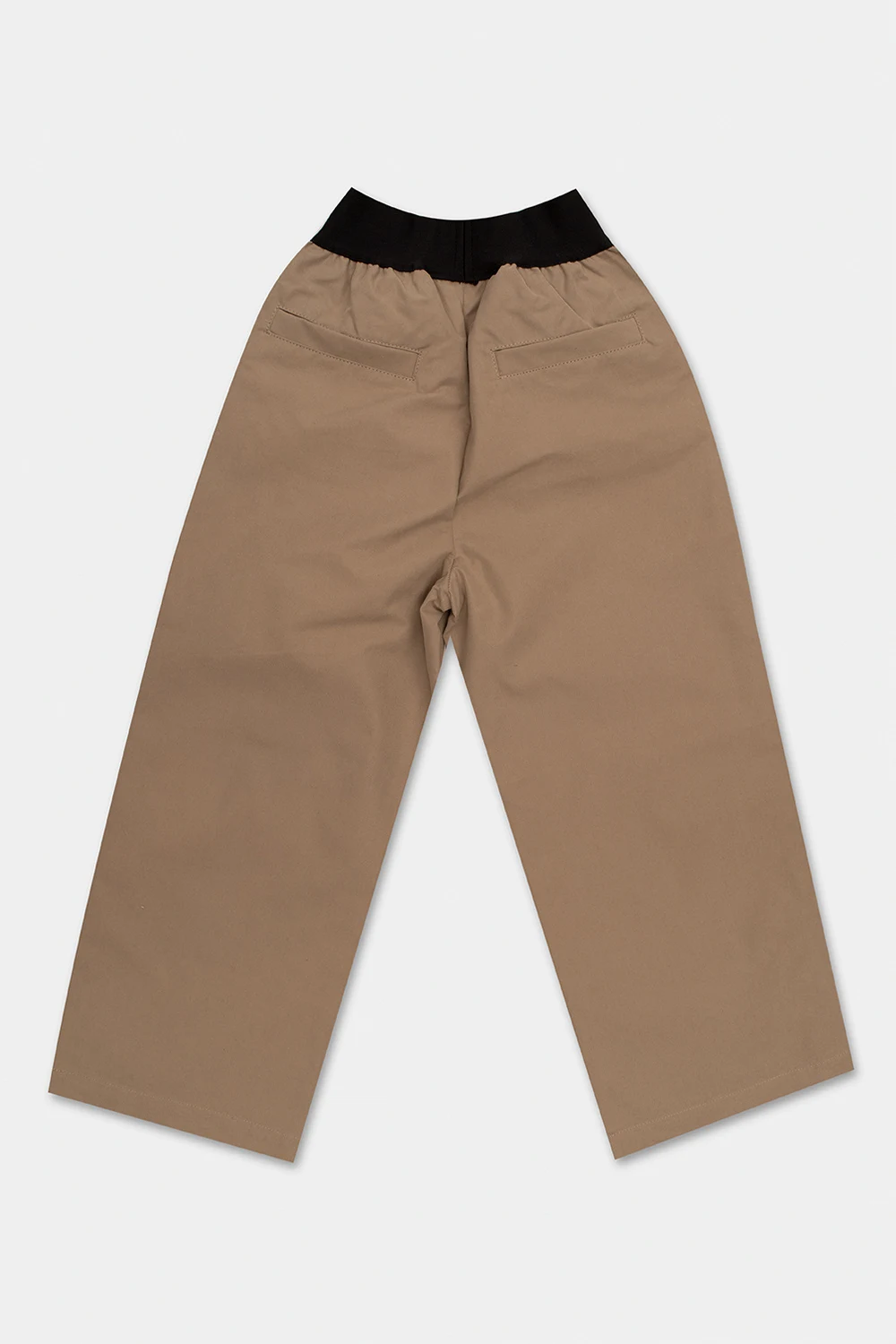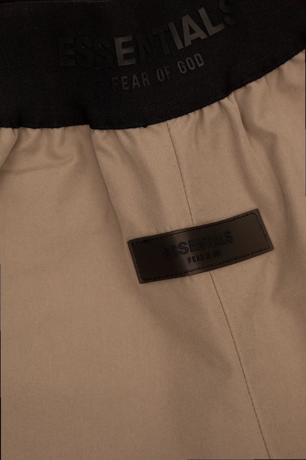 Greyish beige trousers from Fear Of God Essentials Kids. Made of cotton, this straight leg design features a black elastic waistband with a logo, rubber logo patch and four slip pockets.
