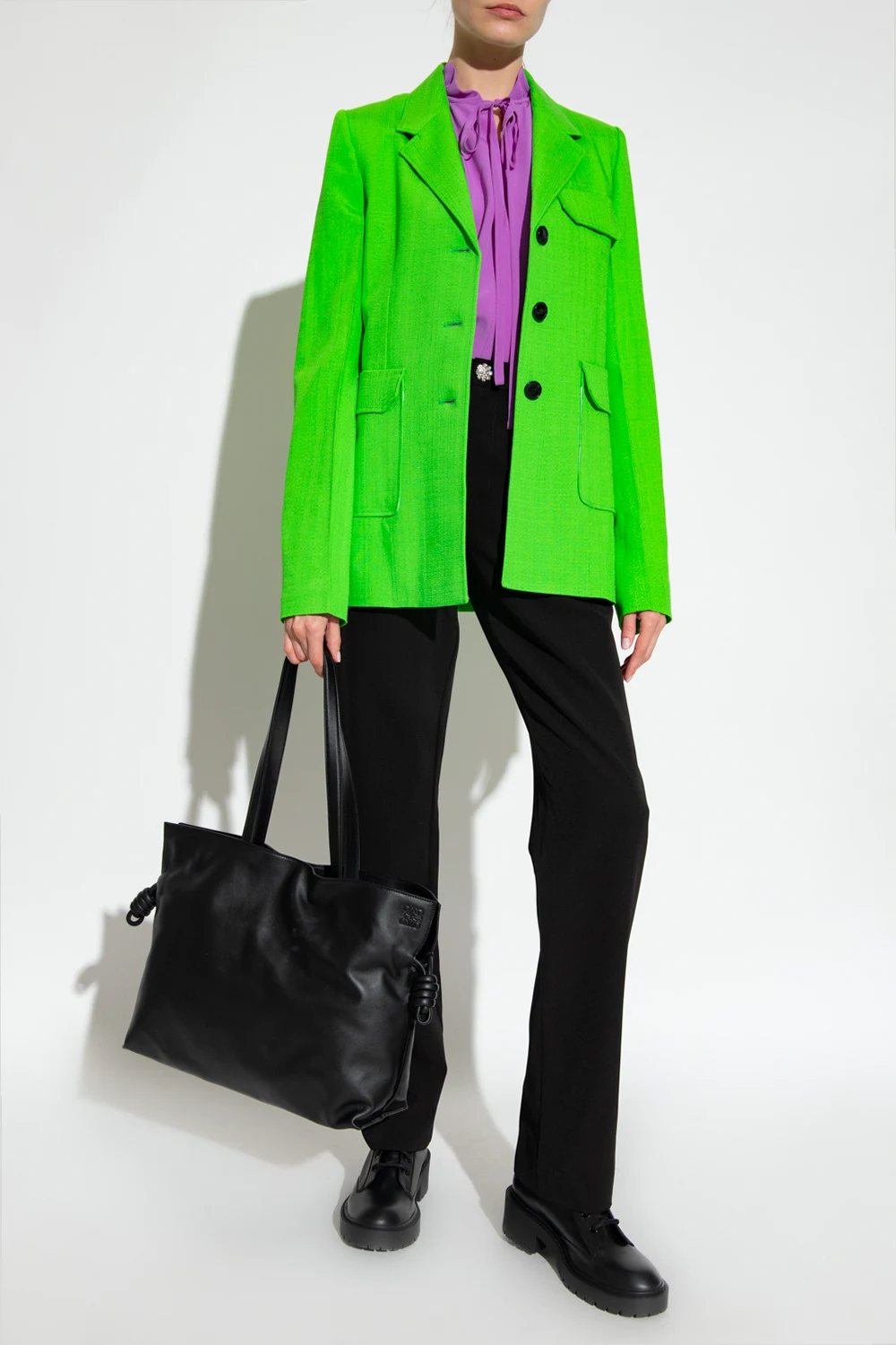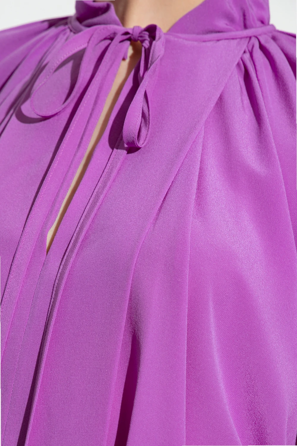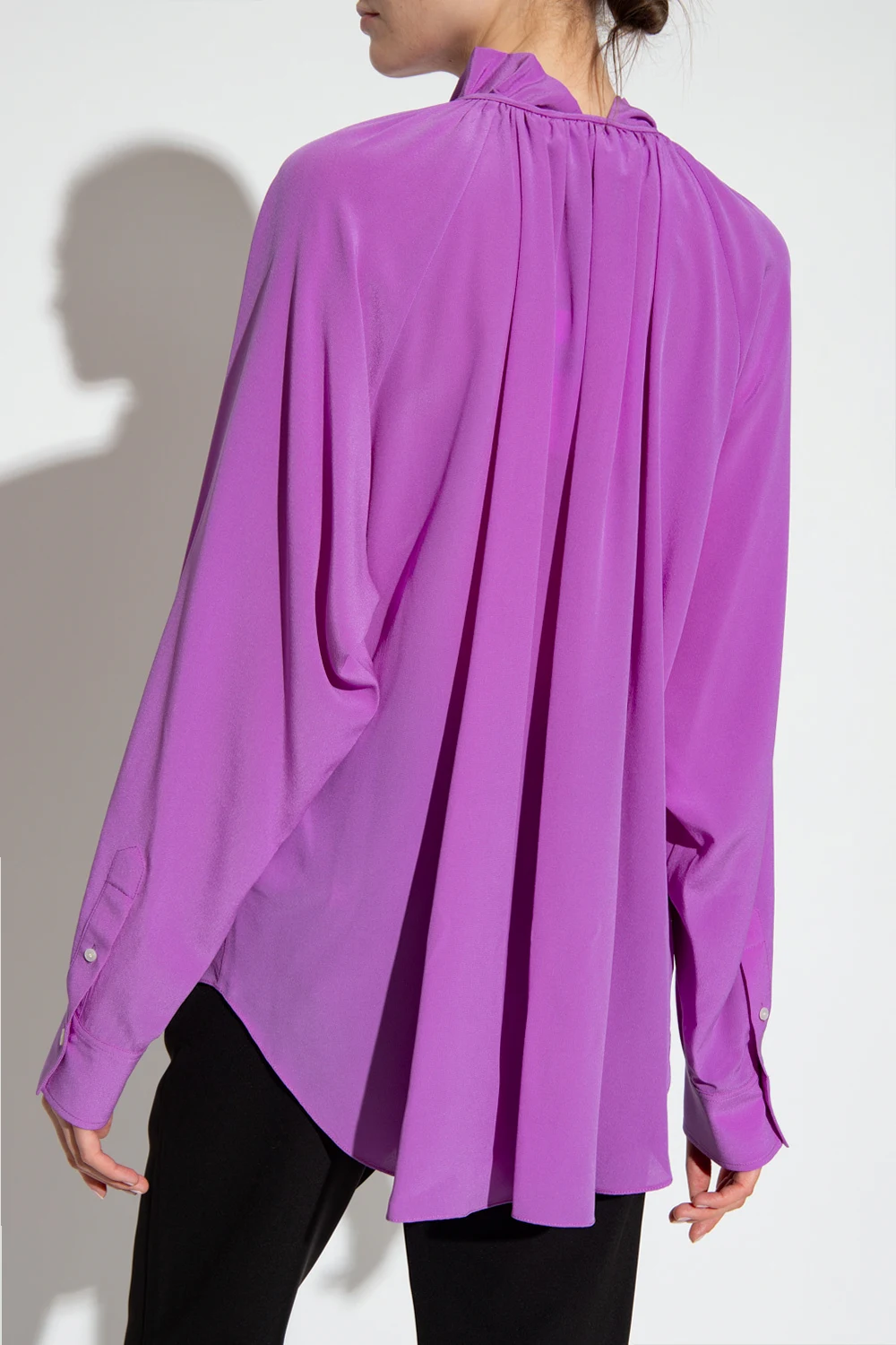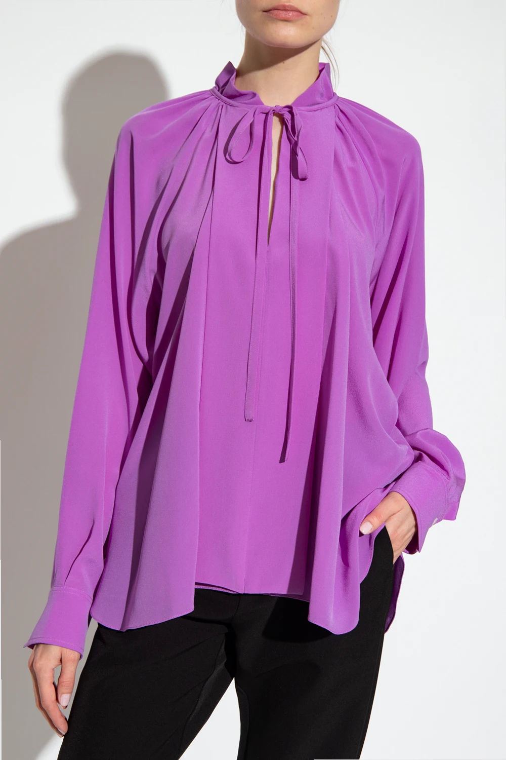 Purple top from Victoria Beckham. Made of silk with a relaxed silhouette, this style features a round neck with a drawstring split and long sleeves with button cuffs.