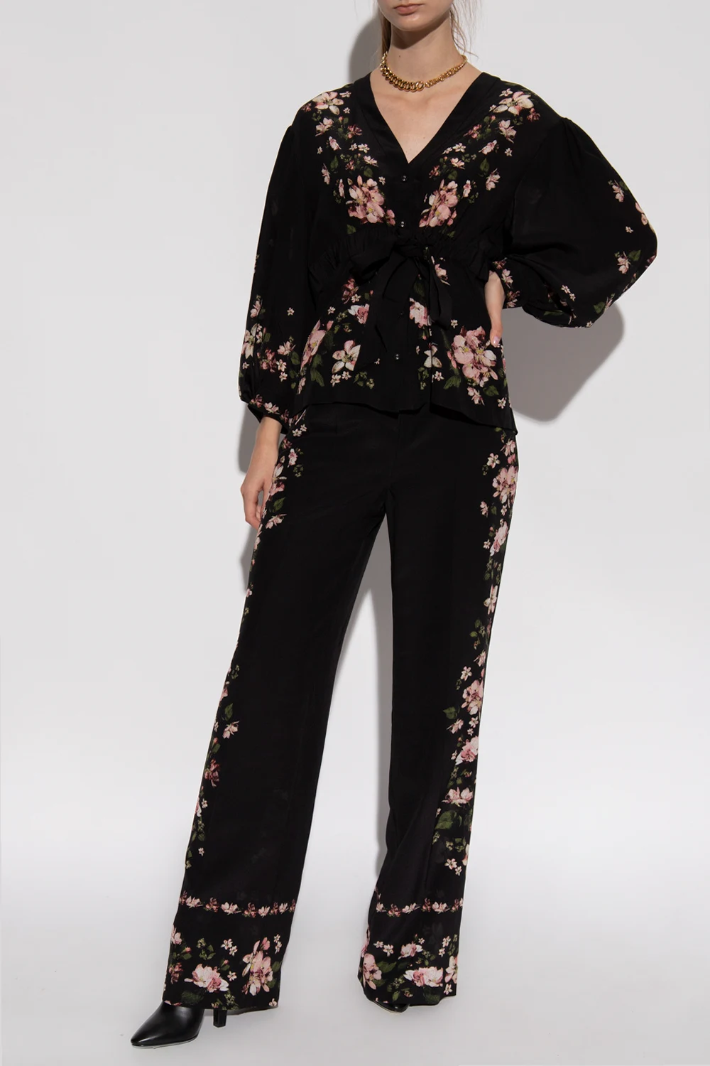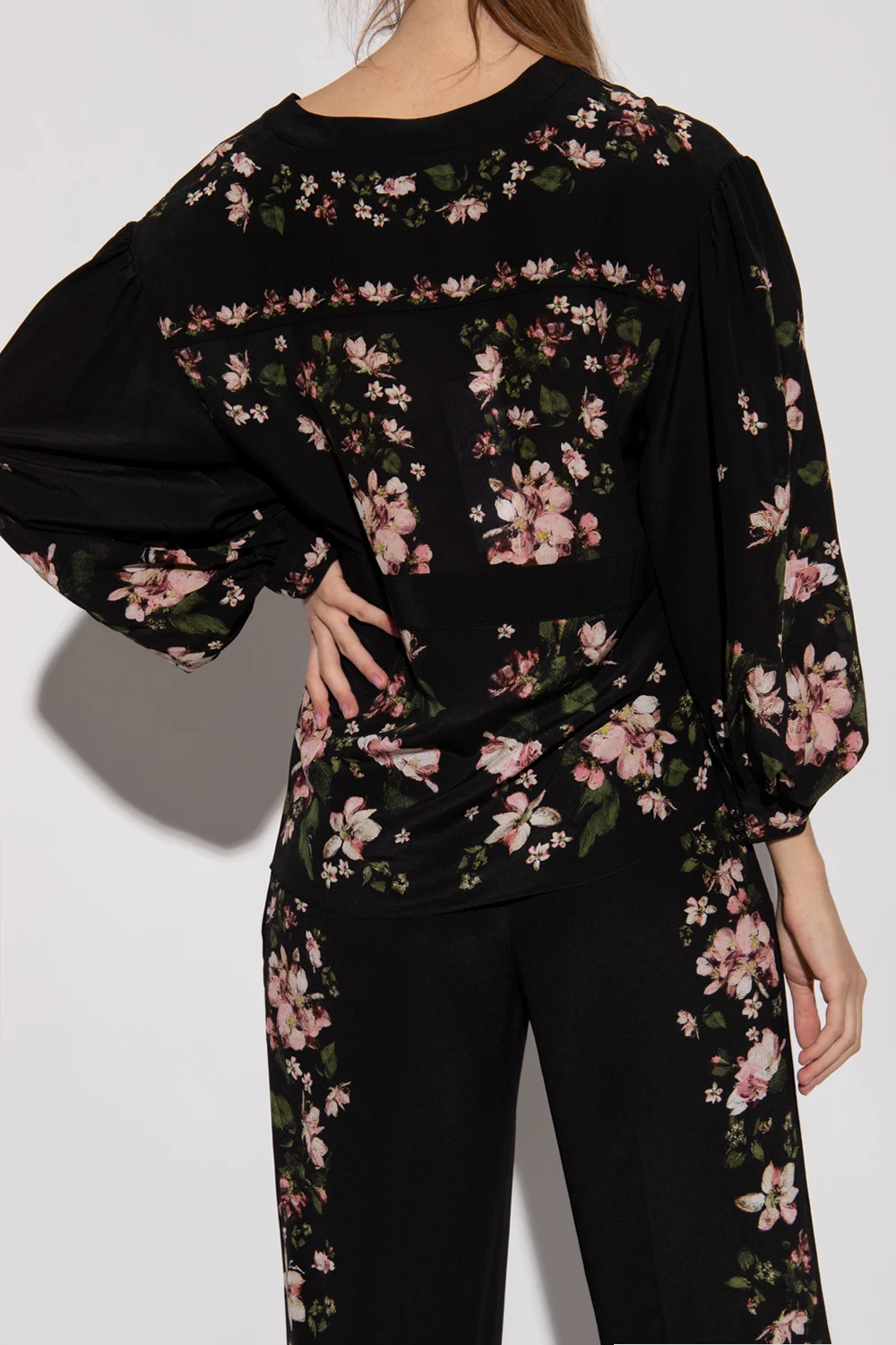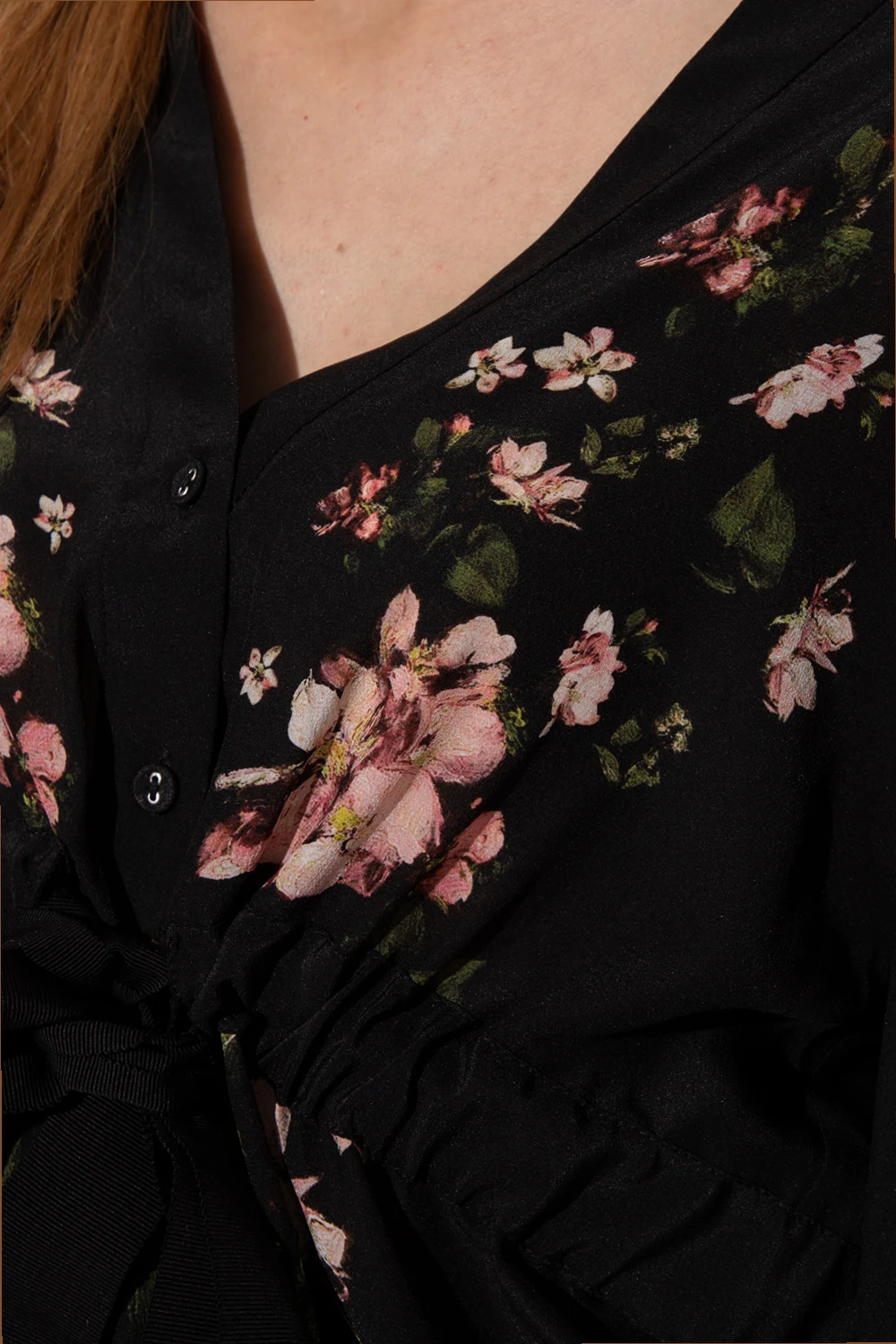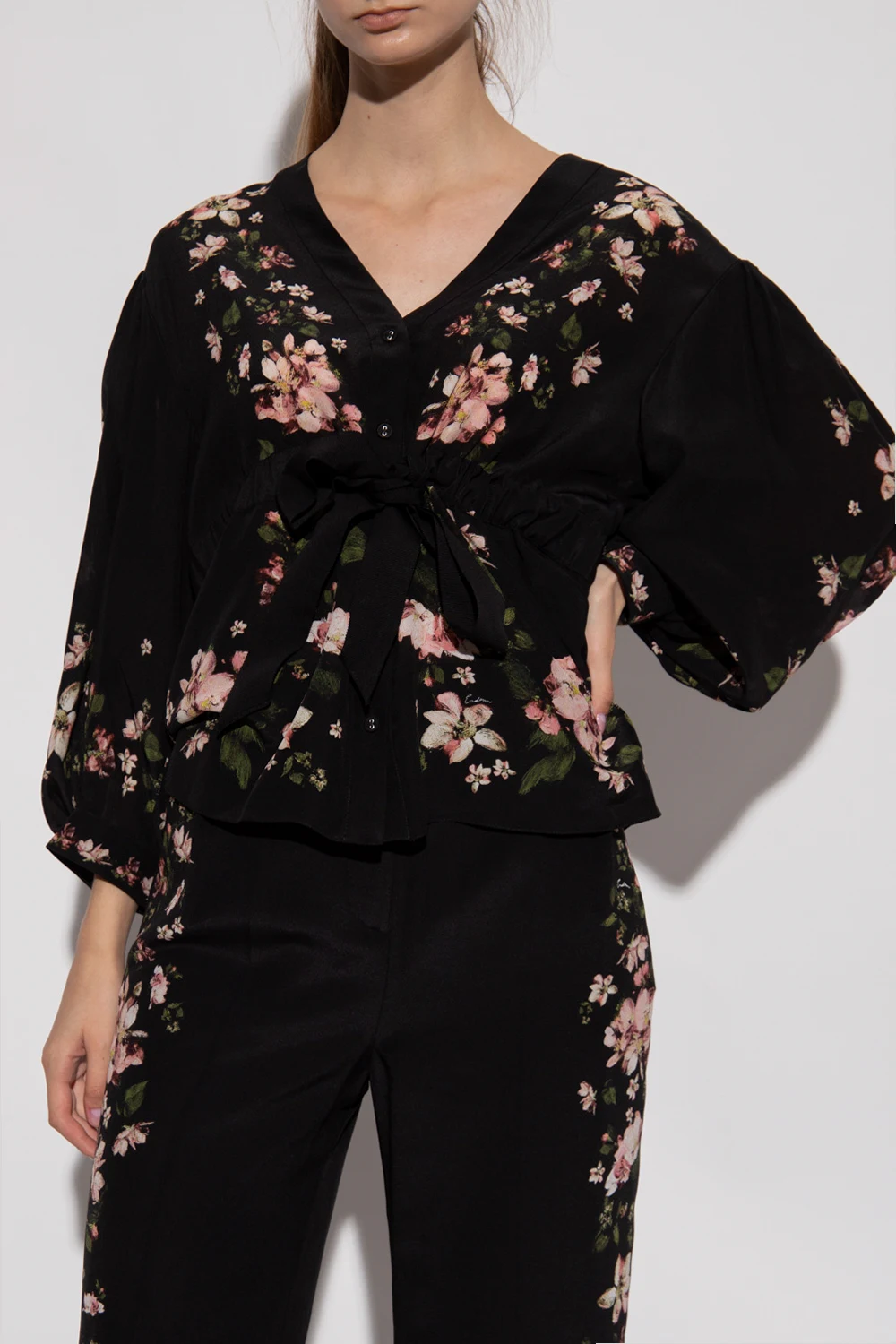Black shirt from Erdem. Crafted from silk and illustrated with a pink, green and white floral pattern, this style features button fastenings, a V-neckline, a waist-cinching grosgrain belt and puffed sleeves with button cuffs.