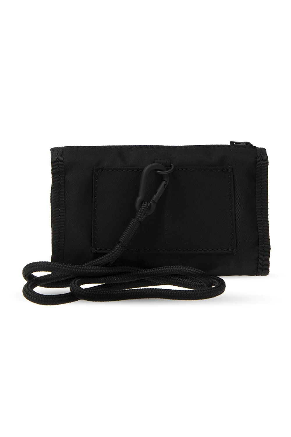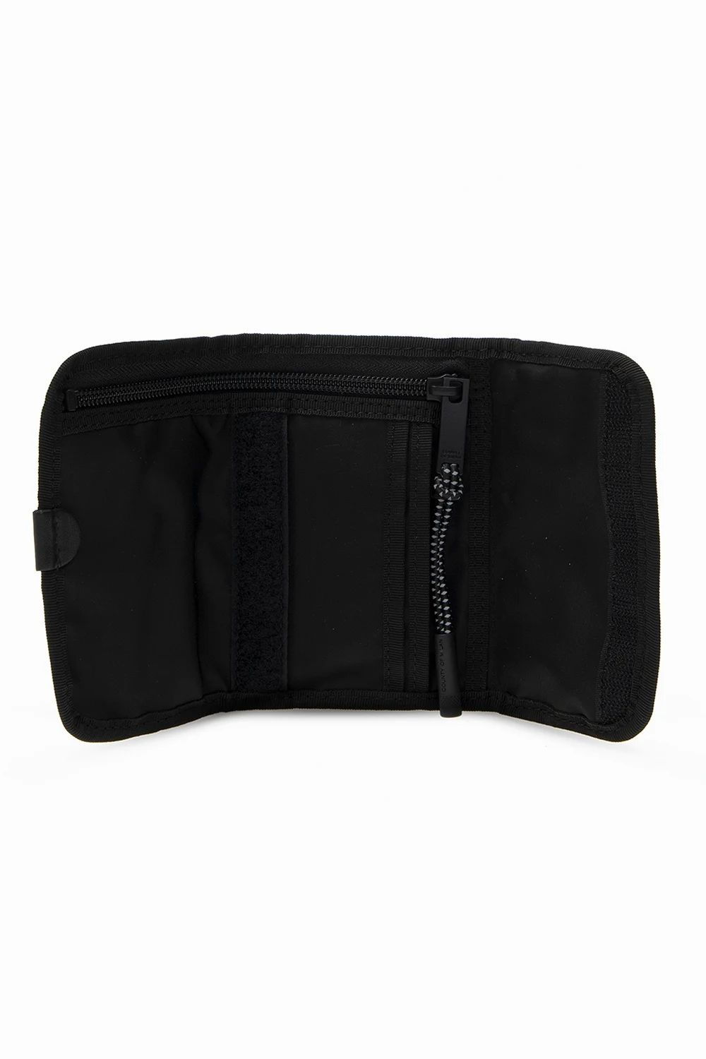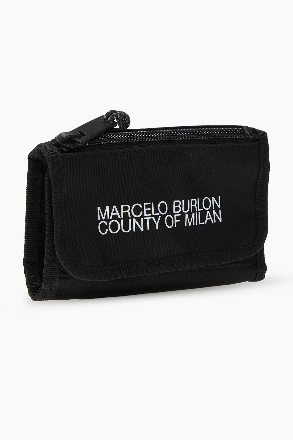 Black bifold wallet from Marcelo Burlon. Trimmed with leather. Velcro fastening. Zip pocket on the front. Detachable neck strap with a carabiner. Slip pocket, zip pocket and two card slots inside.