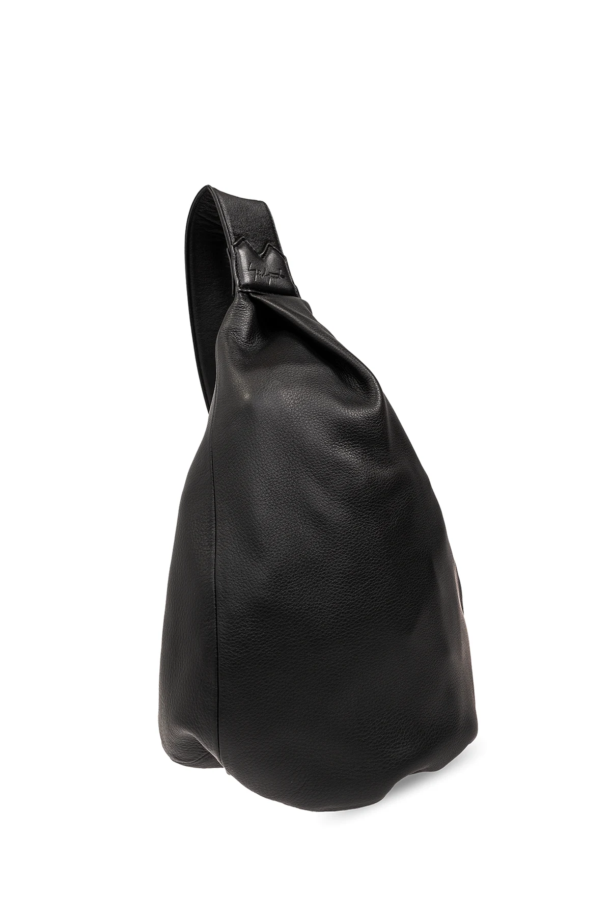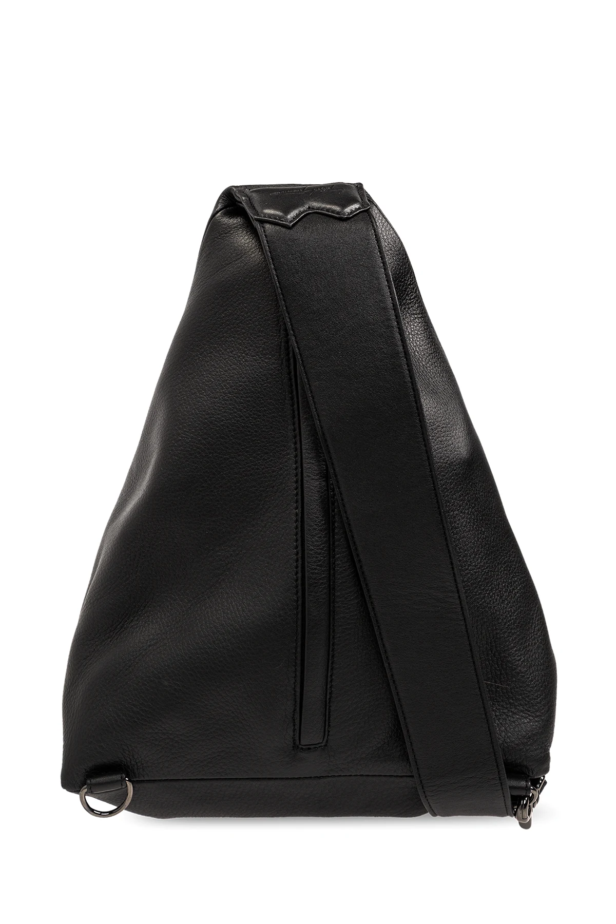 Black one-shoulder backpack from Discord Yohji Yamamoto. Made of leather, this item fastens via a zip and showcases an embossed logo, antiqued silver-tone metal hardware as well as an adjustable shoulder strap and one internal compartment with one zip pocket.