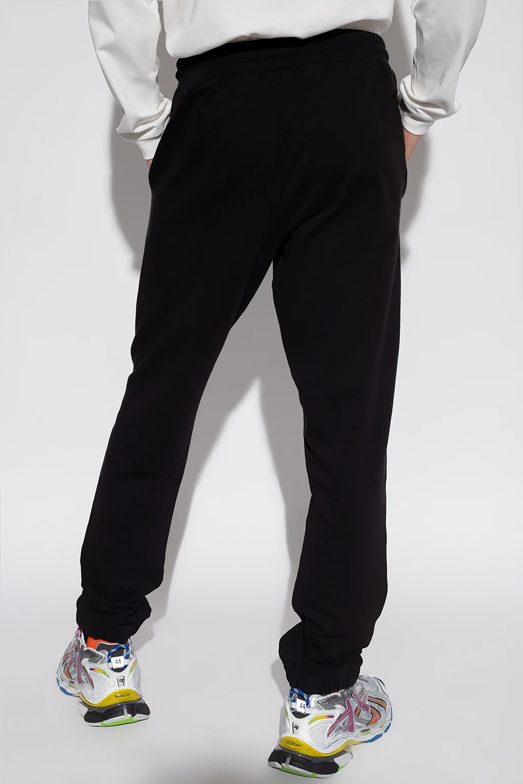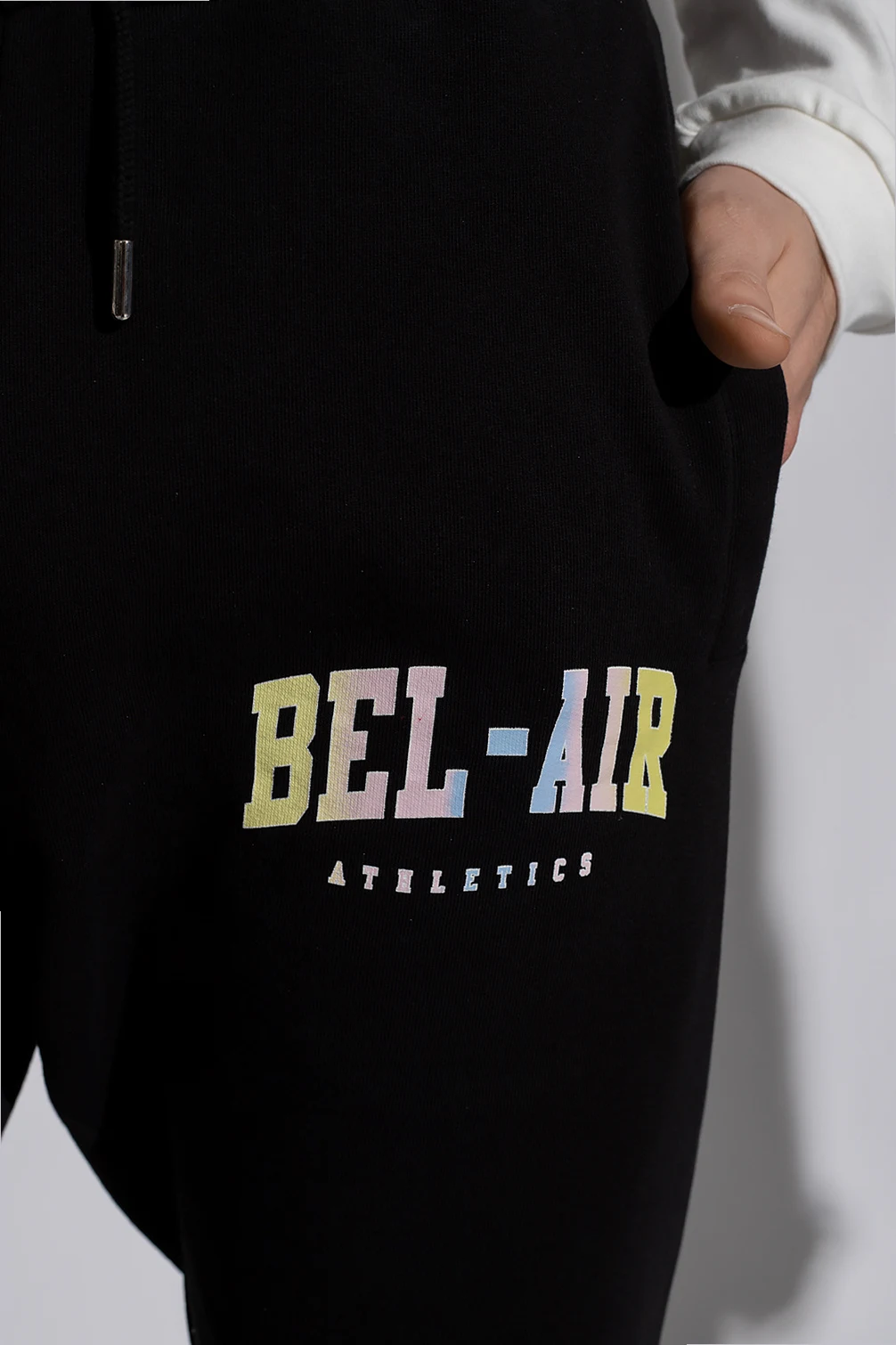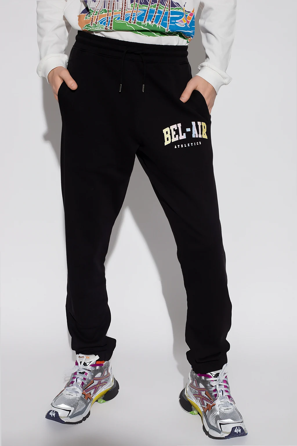 Black sweatpants from Bel Air Athletics. Made of cotton, this pair features an elastic waistband with drawstrings, a multicolored logo pattern, two slip pockets and elasticated cuffs.