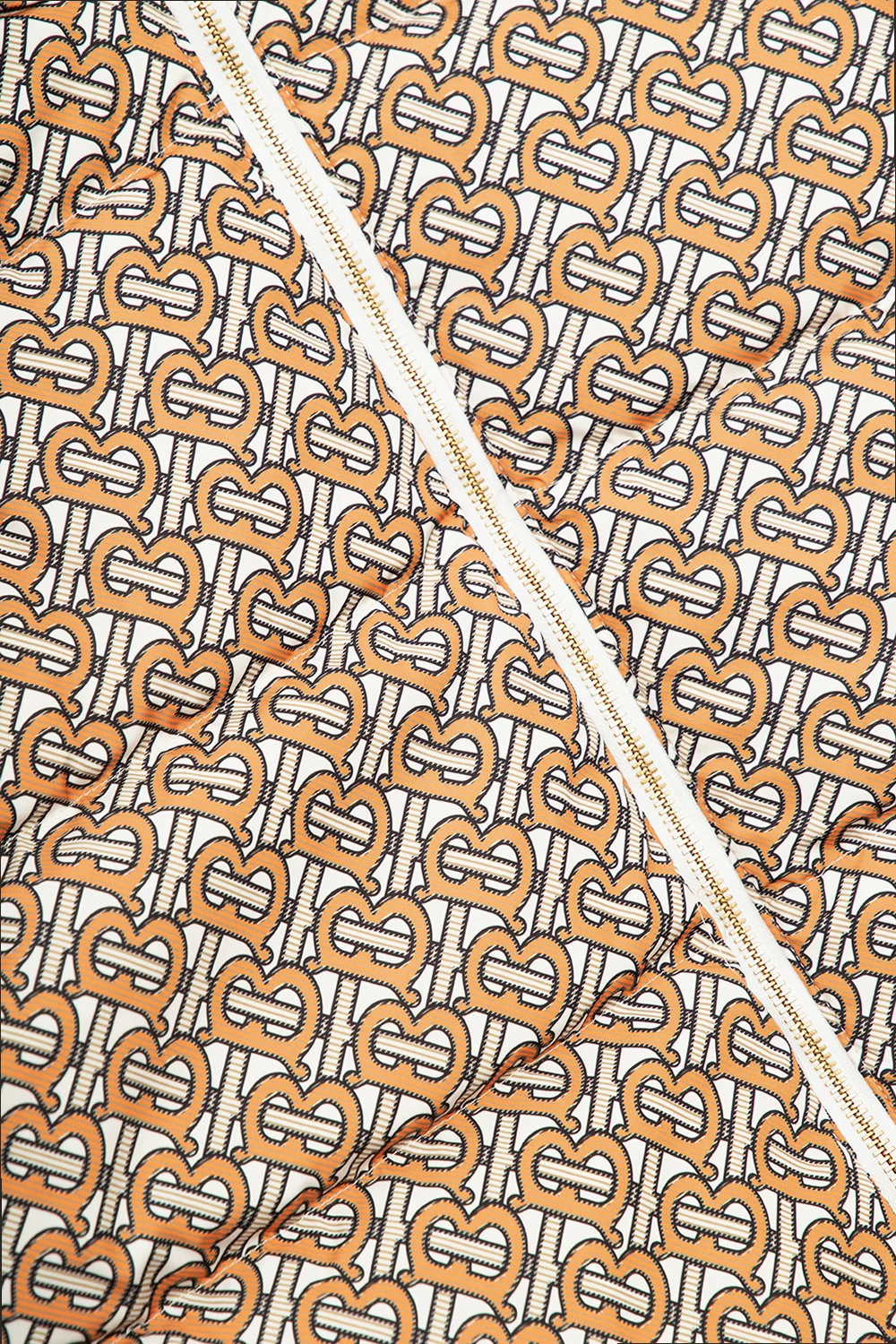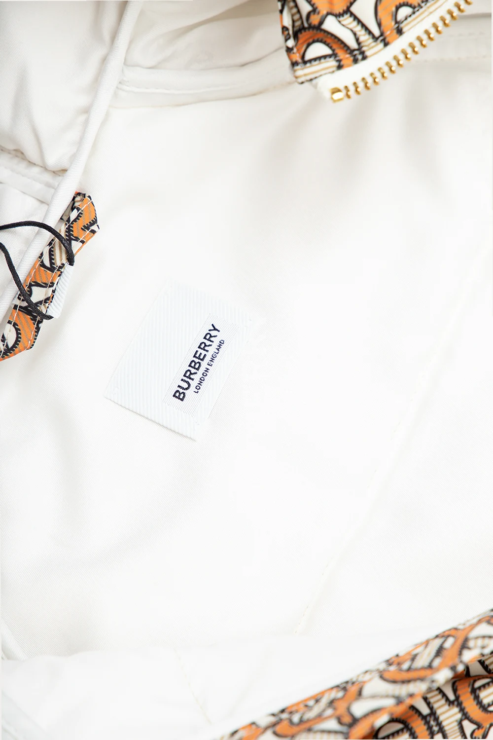 Multicolored hooded down jacket from Burberry Kids. Fastened with a gold-tone zip, this garment features a monogram, two snap-fastened front pockets and long sleeves with ribbed cuffs.