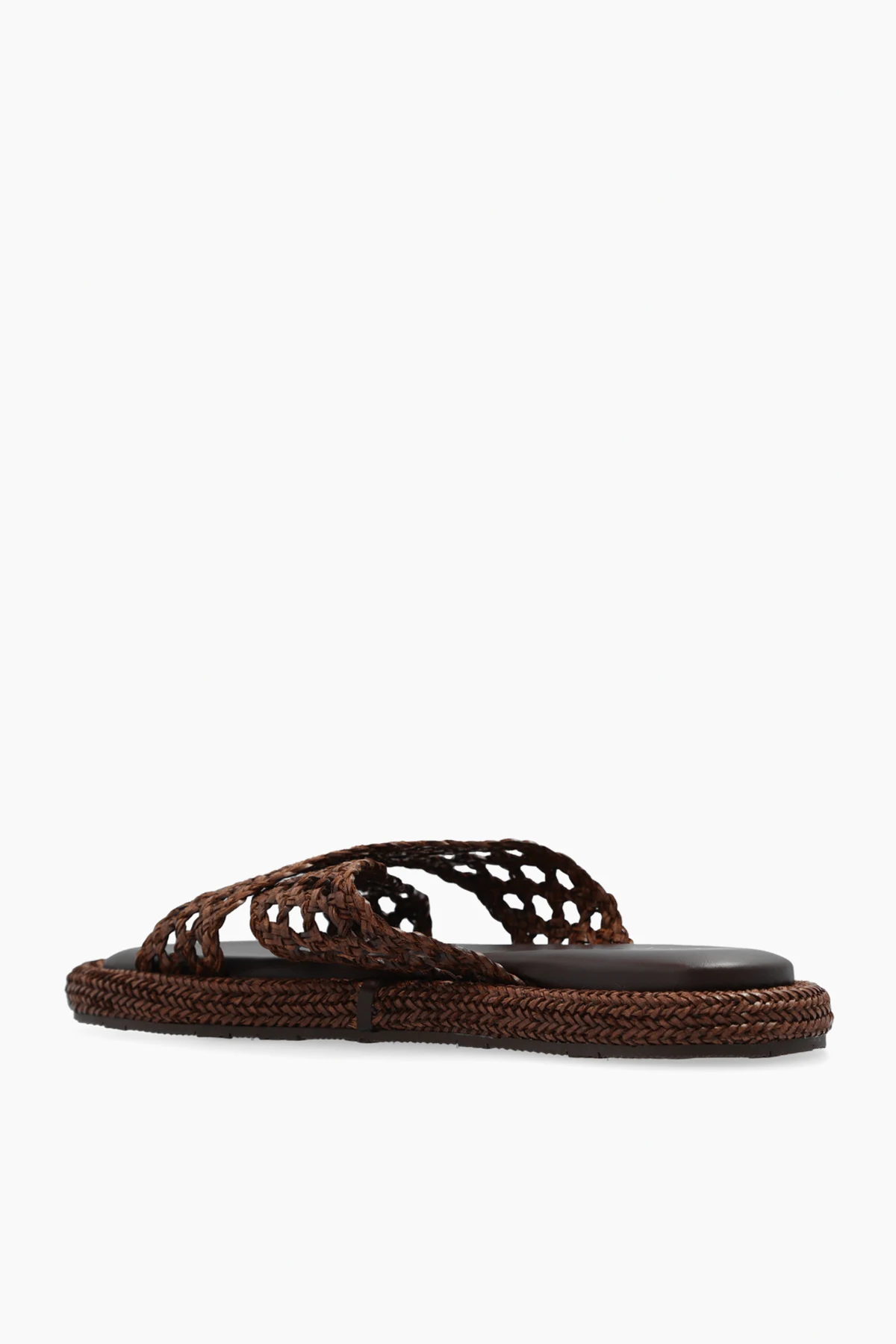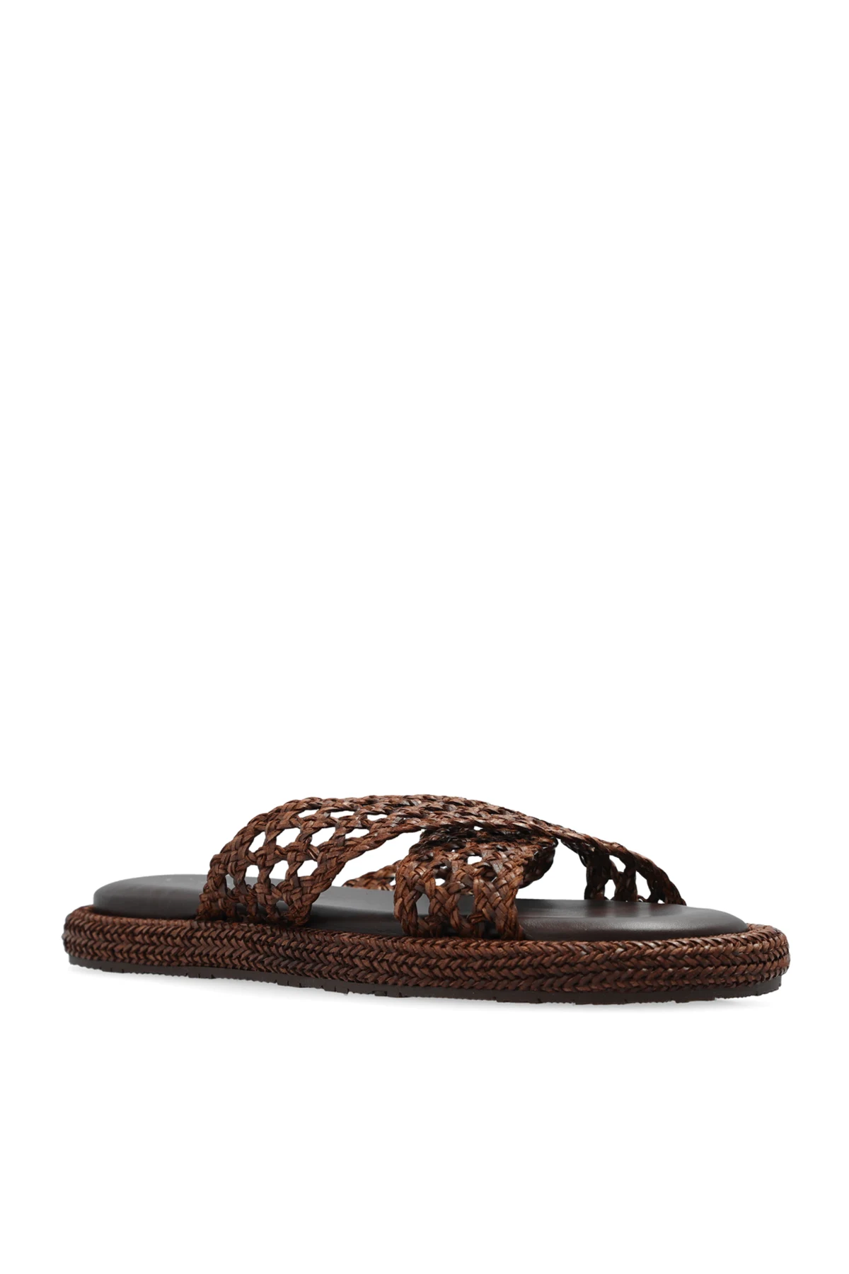 Die majestätische Verarbeitung aus geflochtenem Leder , sowohl in der äußeren als auch in der inneren Schicht, unterstreicht den luxuriösen Charakter dieser Sandalen. Die glatte, beige Sohle aus hochwertigem Gummi gewährleistet hervorragende Haftung und Langlebigkeit, während ihre fein profilierte Struktur den ganzen Tag über Komfort bietet.