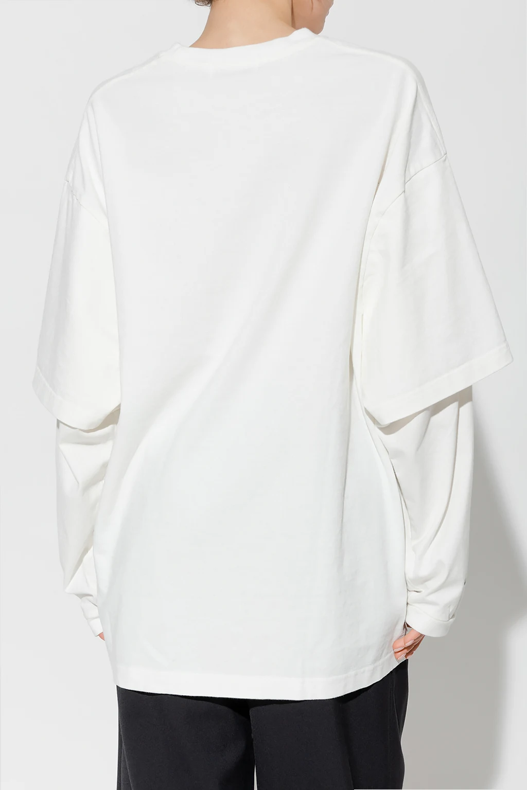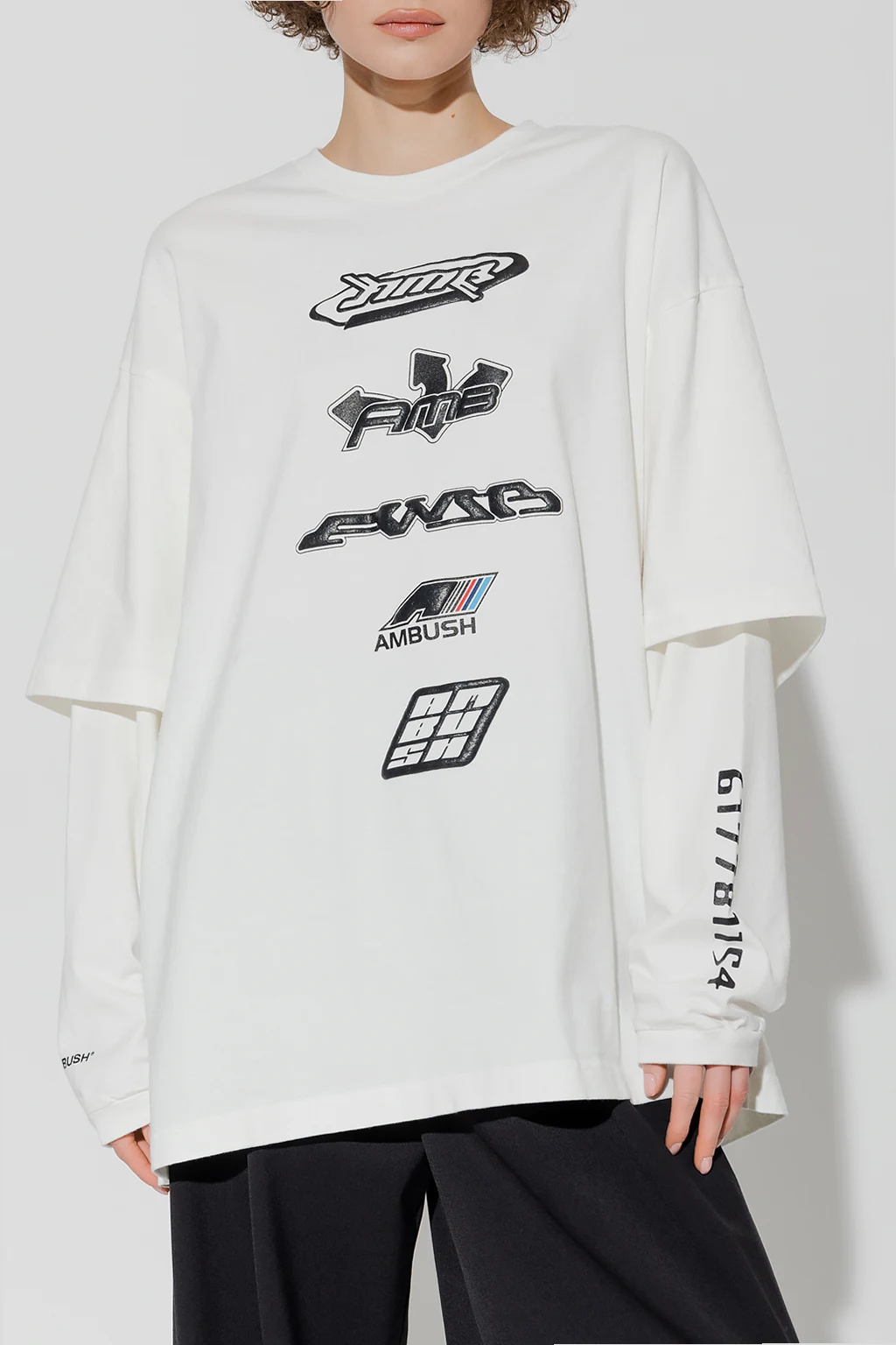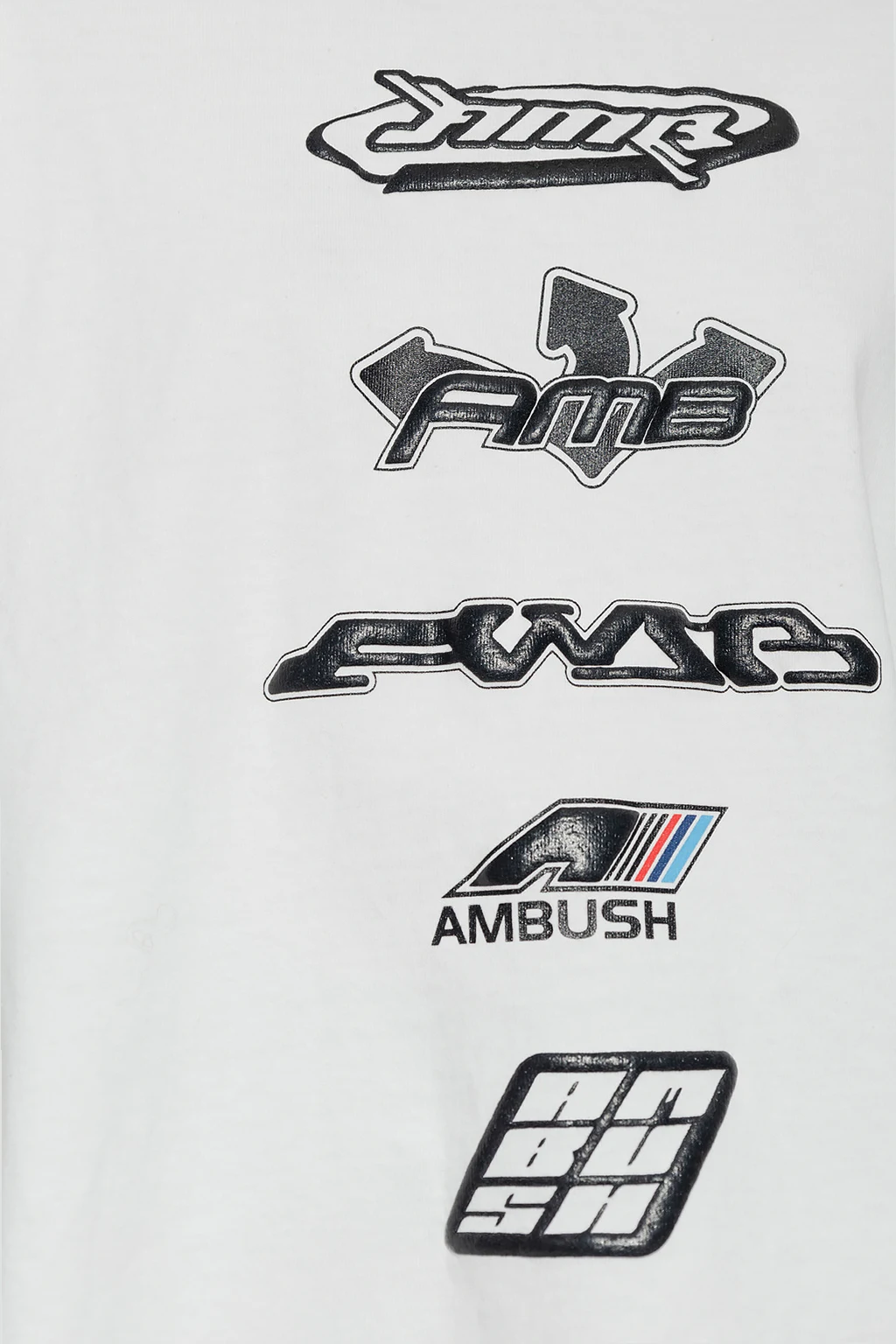 White T-shirt from Ambush. Made of cotton, this design features neon green, raised logo prints, two-layered sleeves and ribbed trims at the crew neck and cuffs.