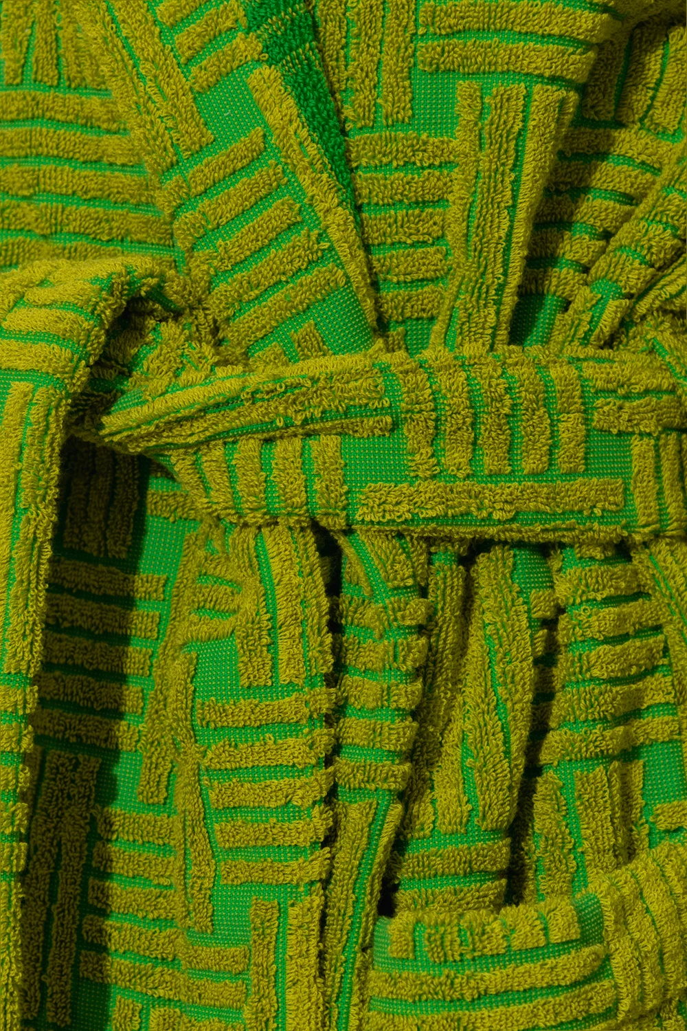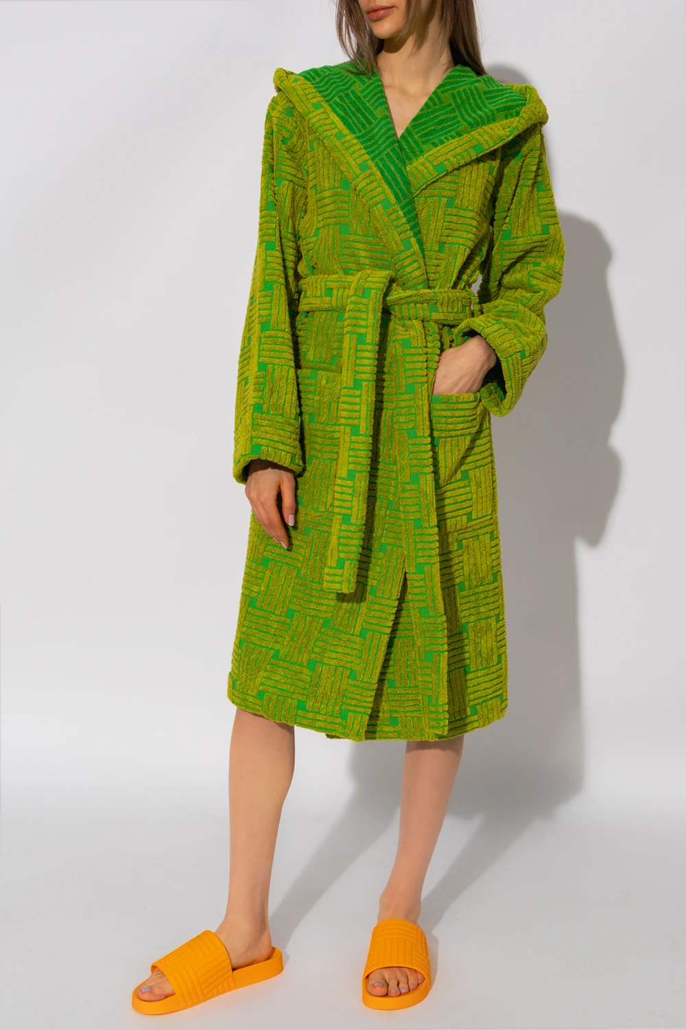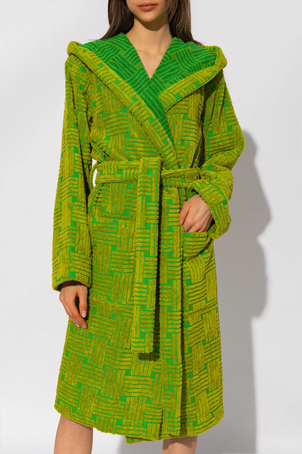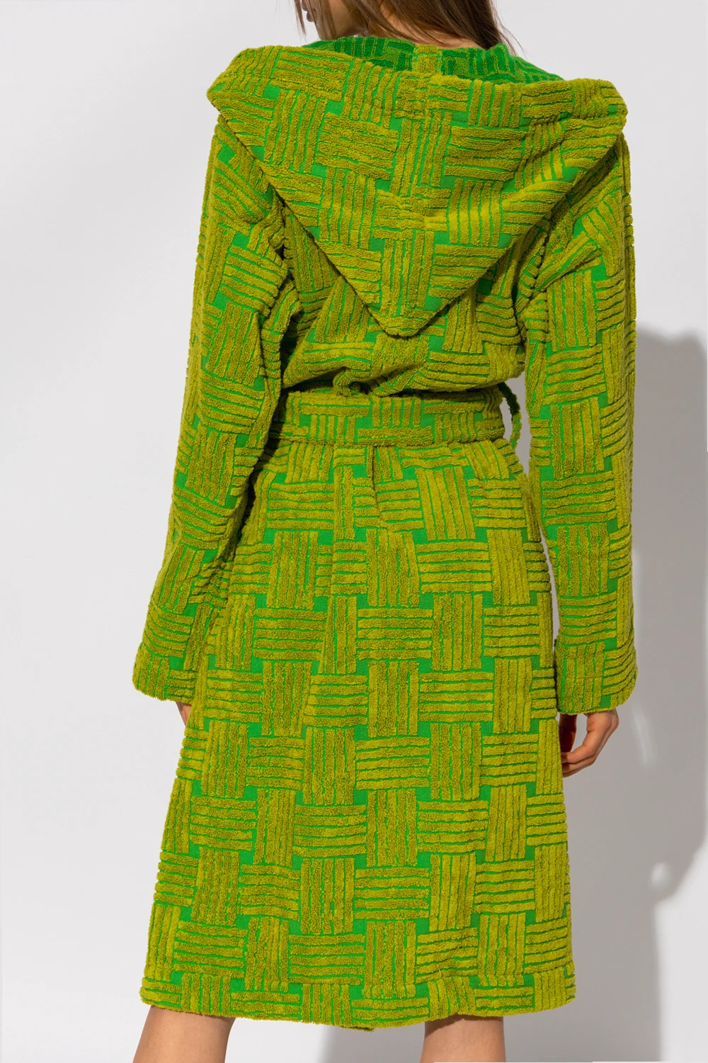 Light green hooded bathrobe from Bottega Veneta. Crafted from cotton, this style showcases the brand's iconic ‘Intreccio’ weave, a waist-cinching belt and two slip pockets.