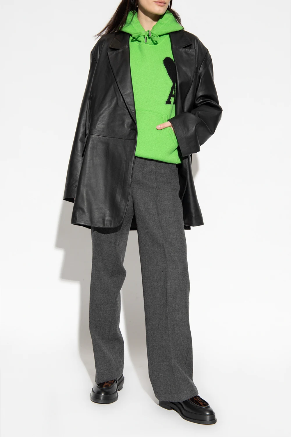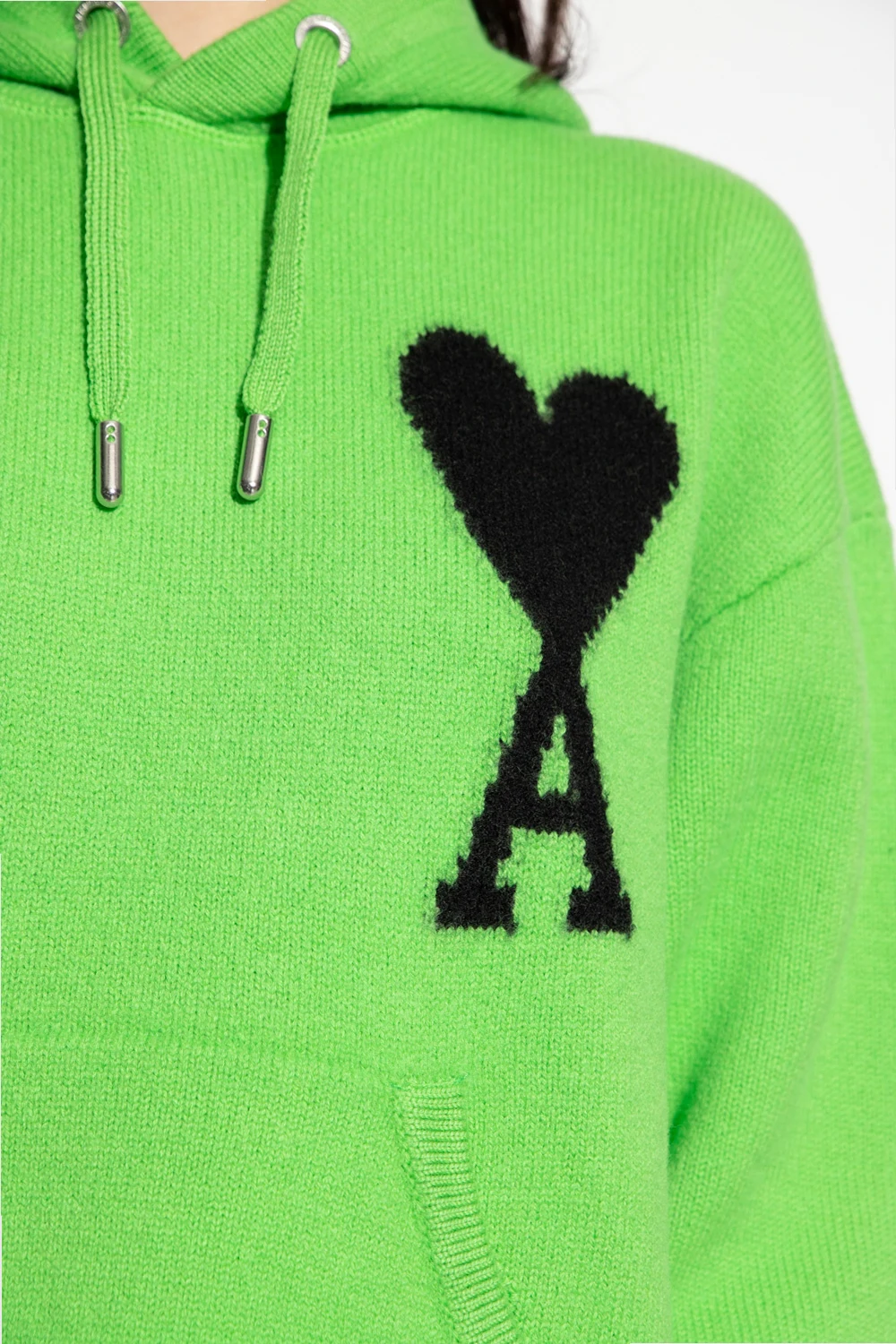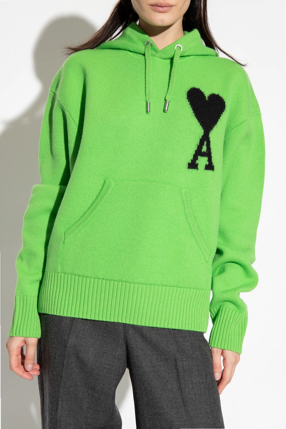 Green sweatshirt with a drawcord-adjustable hood from Ami Alexandre Mattiussi. Crafted from wool, this style features a kangaroo pocket, black ‘Ami De Coeur’ embroidery on the front and elasticized trims on the bottom hem and cuffs.